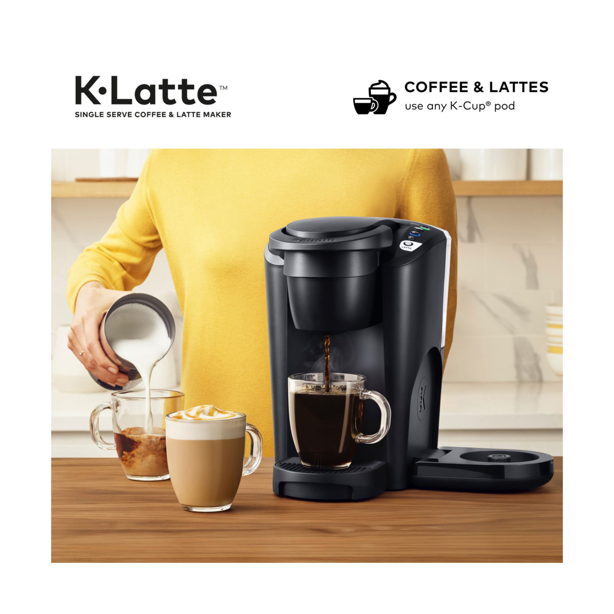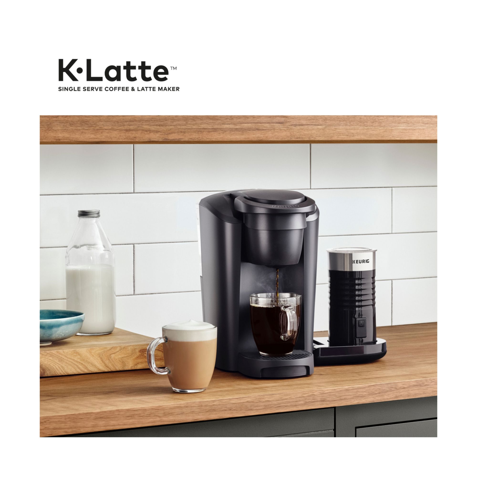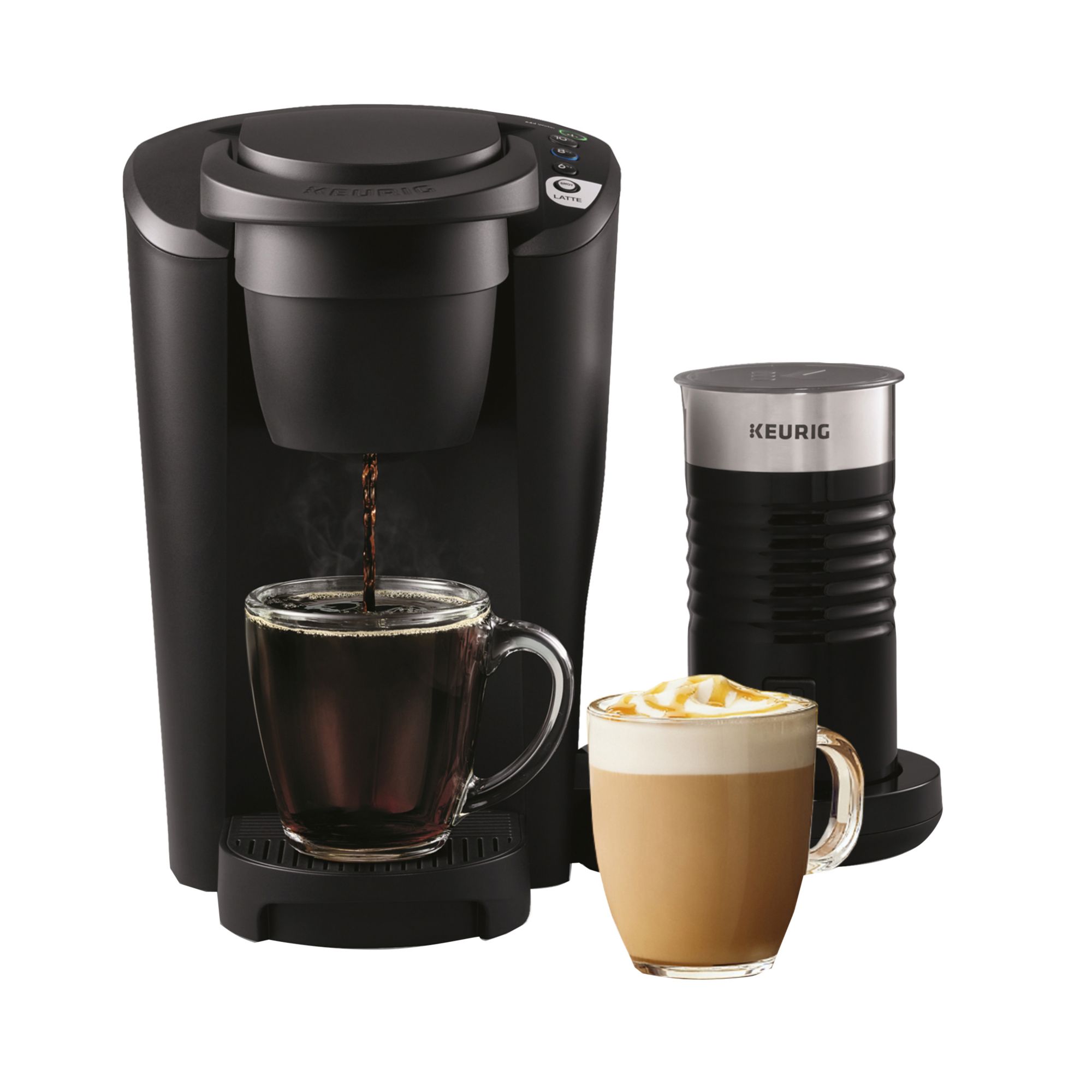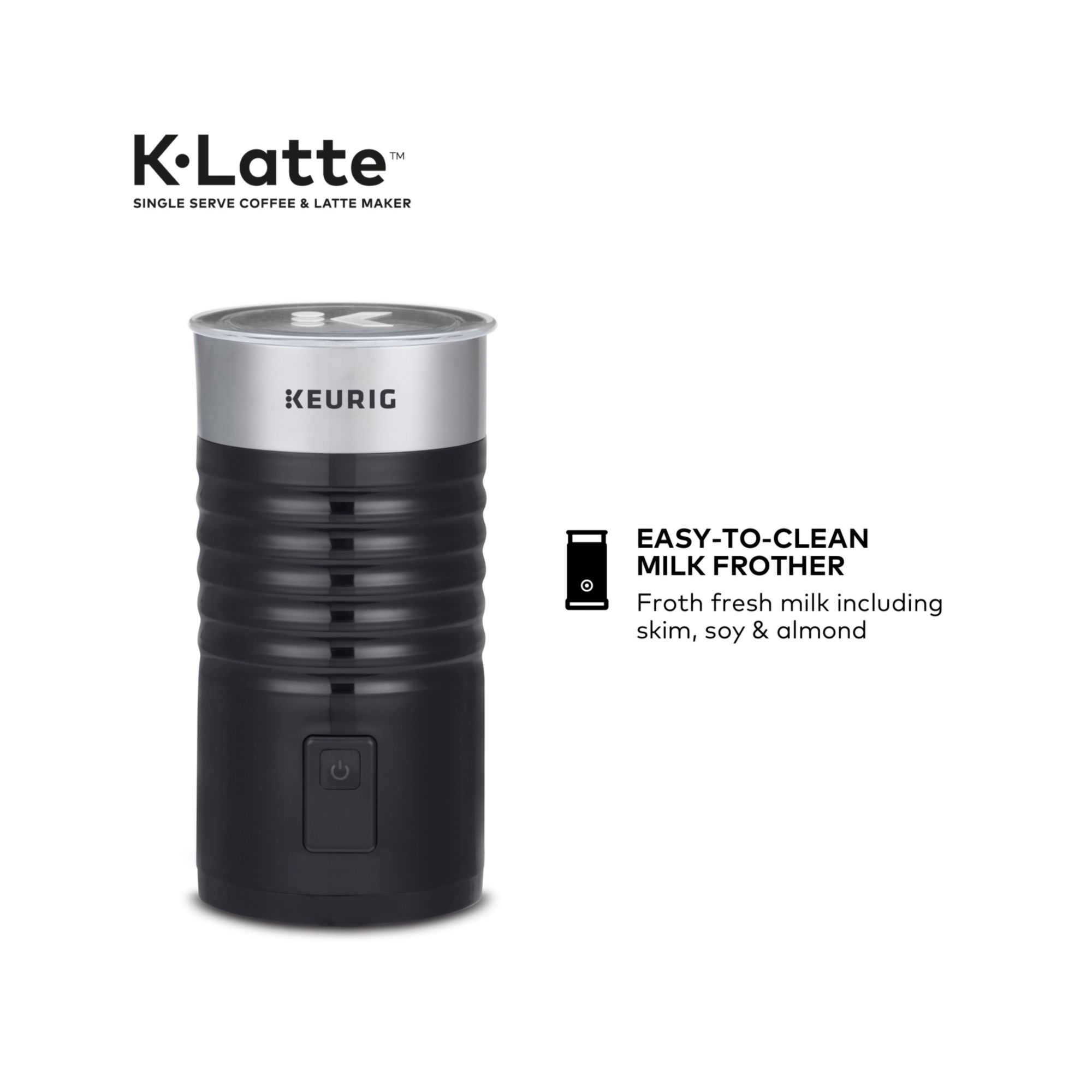 Versatility meets simplicity with the Keurig K-Latte single-serve coffee and latte maker in Black. Brew rich, full-flavored coffee and enjoy delicious, creamy lattes simply made in minutes. Whether brewing coffee or making lattes, the K-Latte brewer works with any K-Cup pod, so the options are endless. Use the coffee SHOT to brew a concentrated shot of coffee perfect for making lattes. Froth your choice of fresh milk – including skim, soy, and almond – to create delicious, creamy lattes. Or, brew 6, 8, or 10 oz. of your favorite coffee, tea, or cocoa. The frother is designed to be easy-to-clean and the frother base flips up to save counter space. Enjoying your favorite beverages at home has never been so easy - just brew, froth, enjoy! Make a latte in 3 easy steps: 1. BREW a coffee SHOT using any K-Cup pod. 2. FROTH your choice of fresh milk, including skim, soy, and almond. 3. ENJOY your delicious, creamy latte.