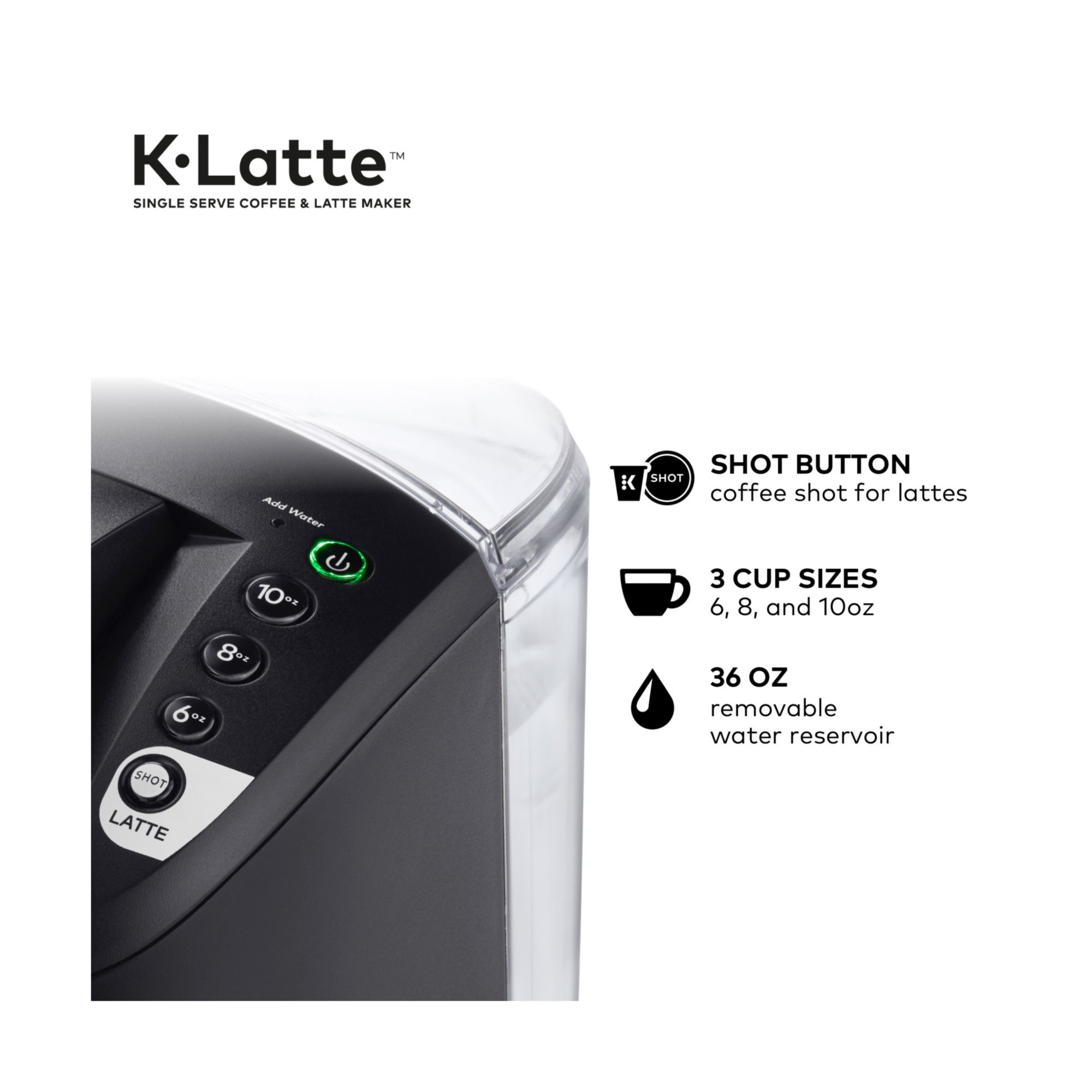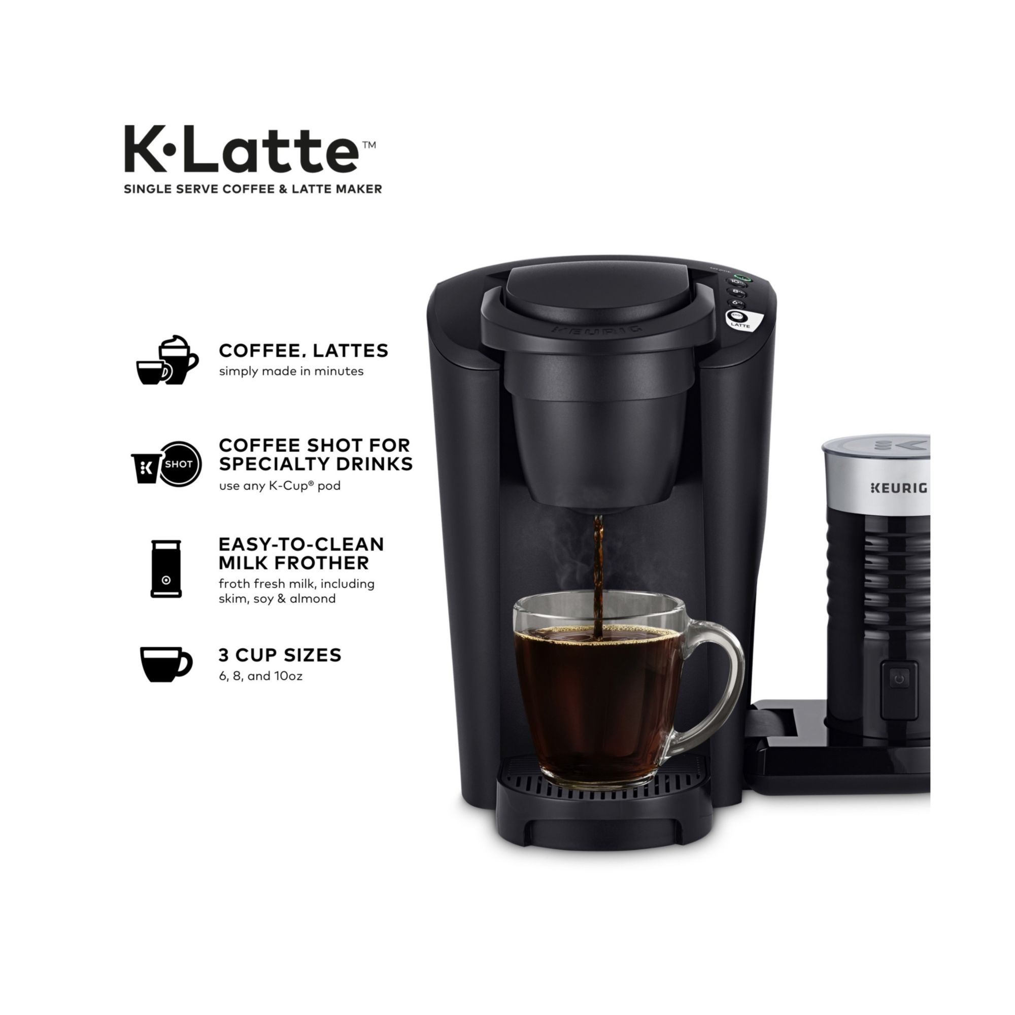 Coffee & Lattes: Use any K-Cup pod to brew coffee or make delicious lattes in minutes Coffee Shots for Specialty Drinks: Press the SHOT button to brew a concentrated shot of coffee from your favorite K-Cup pod to make delicious lattes Easy-to-Clean Frother: Froth fresh milk, including skim, soy, and almond Space-Saving Design: Frother base flips up when not in use to save counter space Brews Multiple Cup Sizes: 6, 8, and 10 oz. Simple Button Controls: Just insert a pod, select your desired cup brew size, and get fast & fresh brewed, delicious coffee in minutes Removable Reservoir: 36 oz. removable reservoir makes refilling easy Smart Start: Your coffee maker heats, then brews in one simple process - no need to wait for it to heat before selecting your cup size Includes one Keurig single-serve coffee and latte maker, plus easy-to-clean milk frother