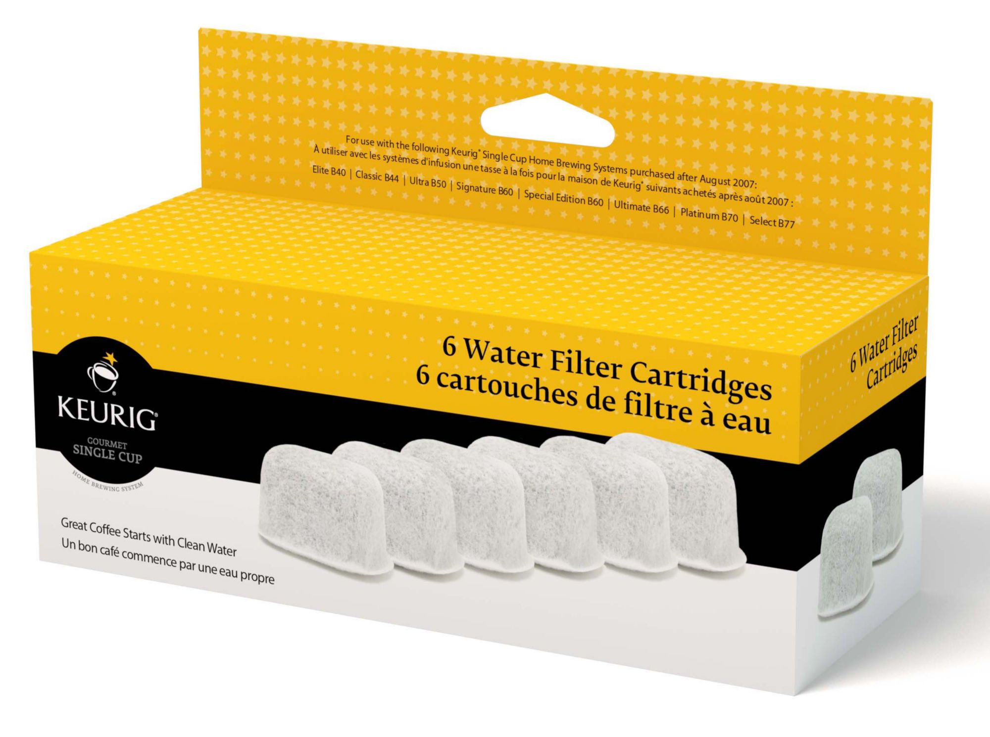 These charcoal filters are designed for use with all Keurig K-Cup reservoir brewers* (sold separately). To use, place a cartridge into the water filter assembly and insert it into your water reservoir. For best results, replace your water filter cartridge every 2 months or 60 tank refills. Includes 6 water filter cartridges.