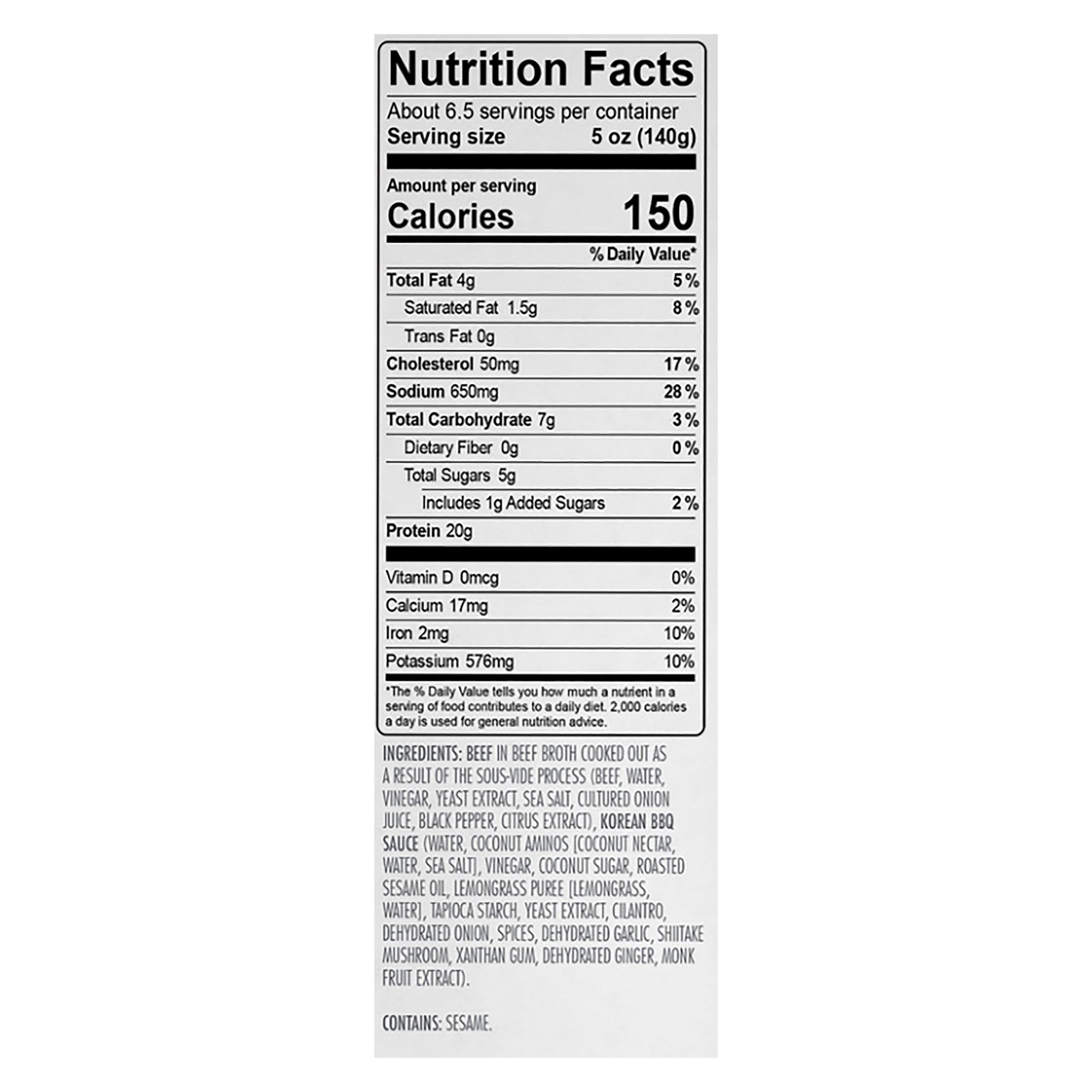 Ingredients: Chicken In Chicken Broth Cooked Out As A Result Of The Sous-vide Process (Boneless Skinless Chicken Breast, Water, Vinegar, Yeast Extract, Sea Salt, Cultured Onion Juice, Black Pepper, Citrus Extract), Korean Bbq Sauce (Water, Coconut Aminos {Coconut Nectar, Water, Sea Salt}, Vinegar, Coconut Sugar, Roasted Sesame Oil, Lemongrass Puree {Lemongrass, Water}, Tapioca Starch, Yeast Extract, Cilantro, Dehydrated Onion, Spices, Dehydrated Garlic, Shitake Mushroom, Xanthan Gum, Dehydrated Ginger, Monk Fruit Extract).