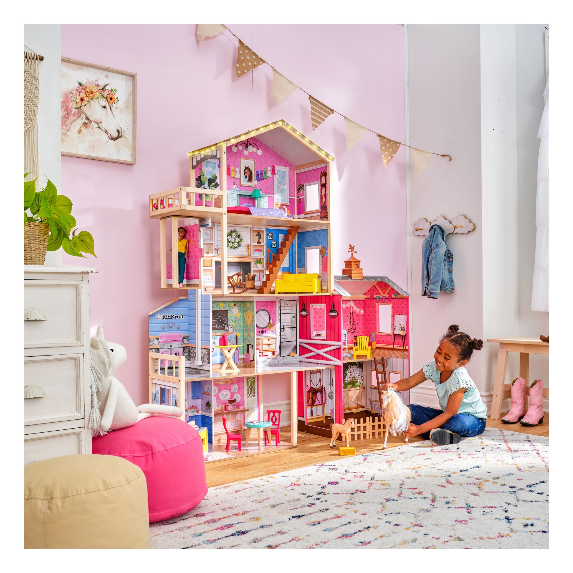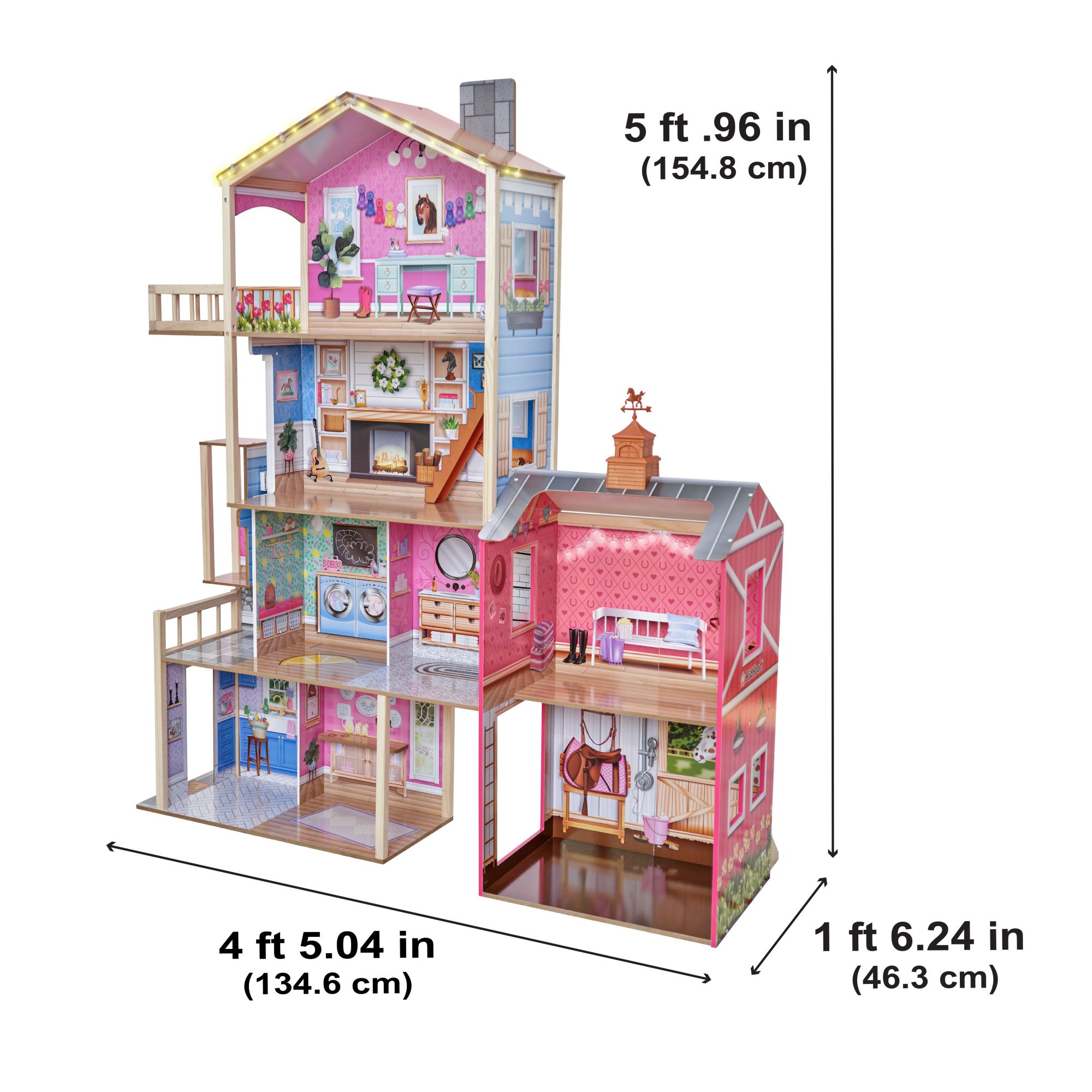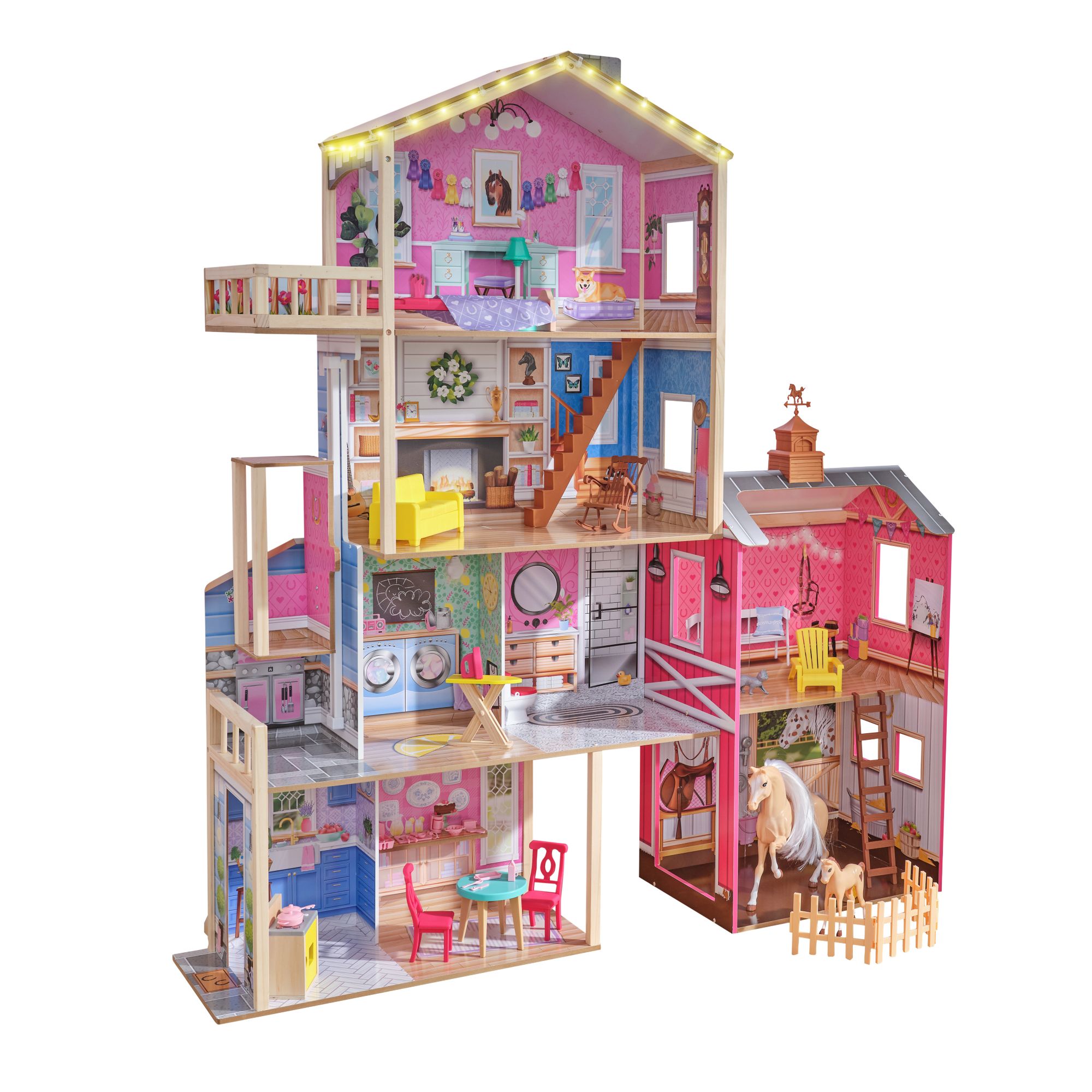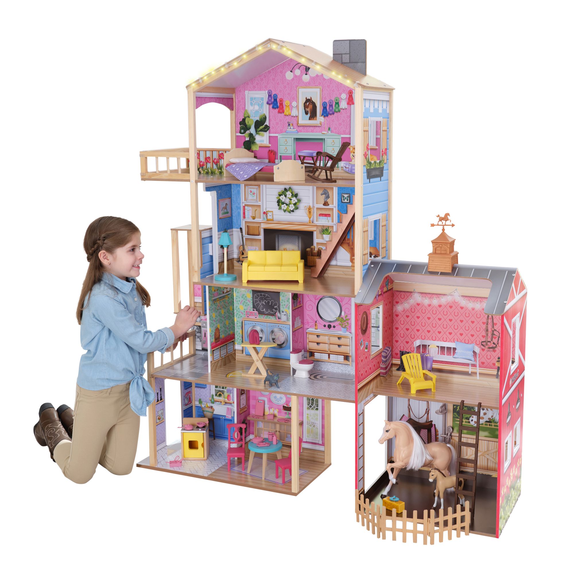 Gallop away with imagination in the impressive KidKraft Champion Wood Dollhouse and Horse Barn. 5' tall, this two-in-one wooden dollhouse features a four-story farmhouse connected to a two-story horse stable for double the fun. It includes two horses (big and small) with lights, sounds, and a full collection of furniture for instant play. From the kitchen to the laundry room to the bedroom, each space has unique furnishings to match. The sofa even opens up to reveal a storage area. Dolls can ride the elevator from the second floor to the third. A balcony floats from the bedroom for an extension of play. Trot over to the barn next door and visit the two horses in the stable. Give their manes a brush or feed them some hay, then head up to the loft via the ladder and soak in that peaceful country vibe with the barn cat close by. A spinning weathervane on top of the roof is the perfect finishing touch. And with 43 accessories, the Champion Wood Dollhouse and Horse Barn from KidKraft is truly a winner for made-to-last play.