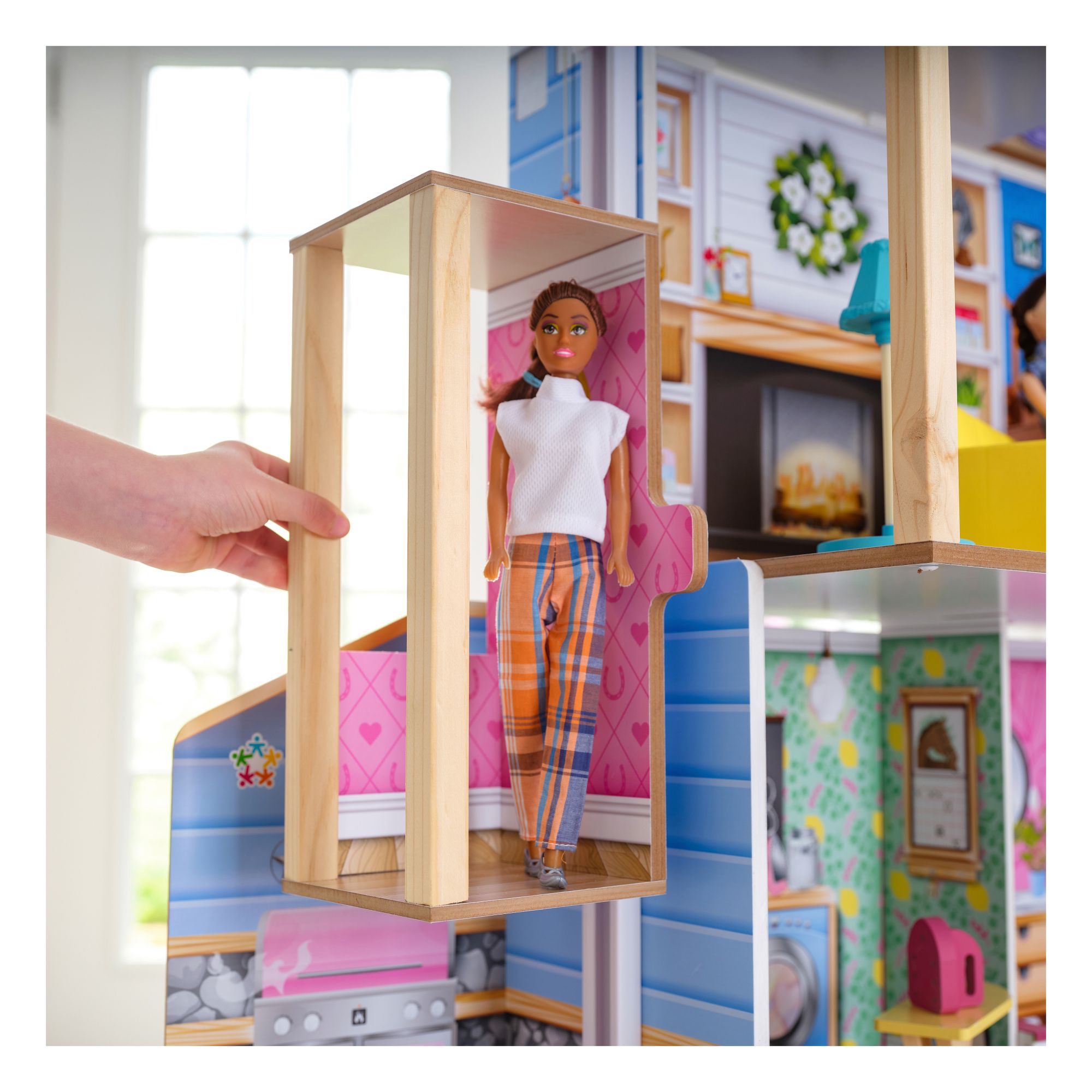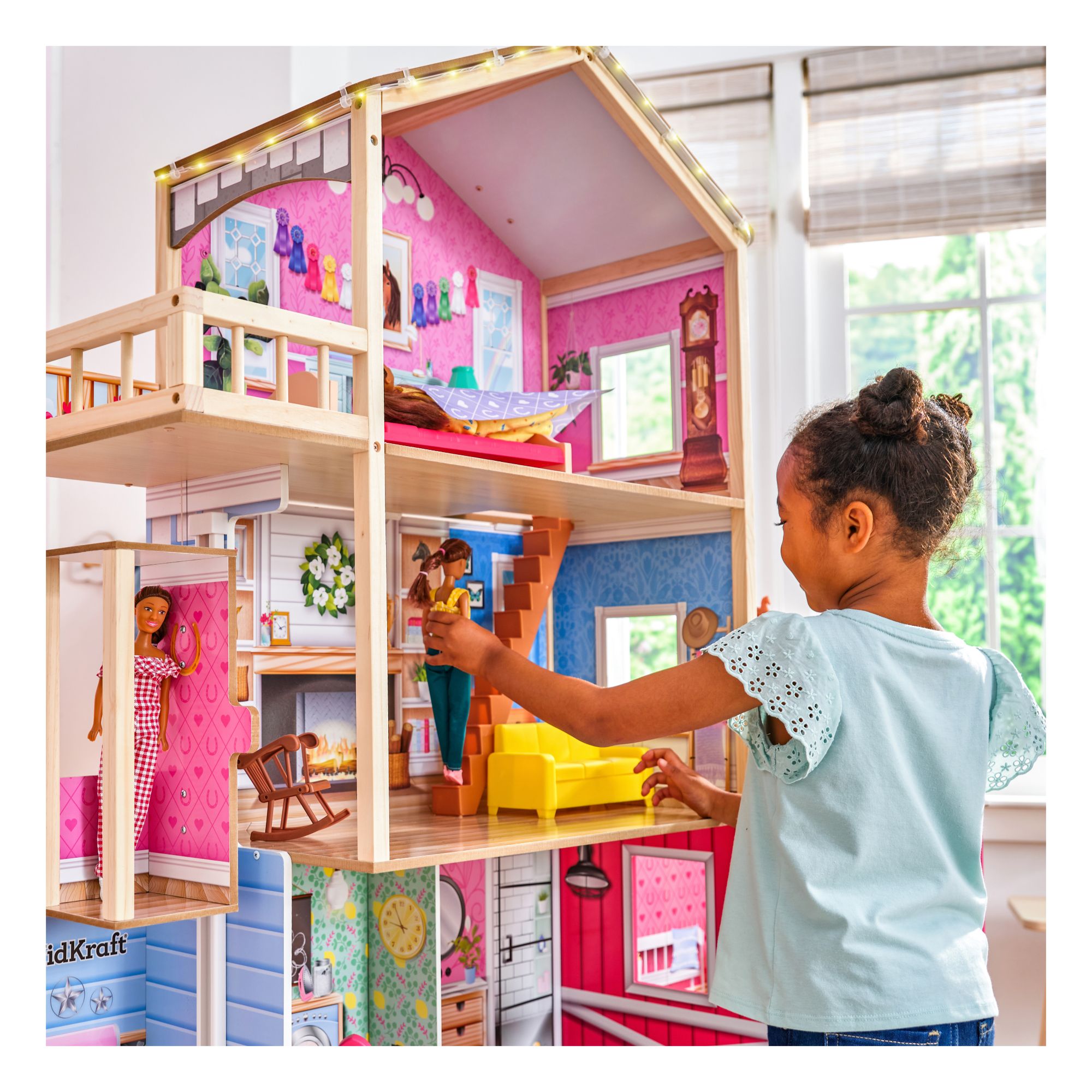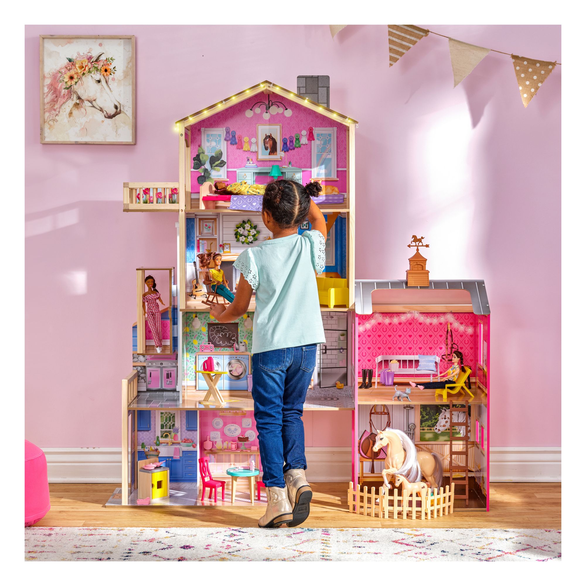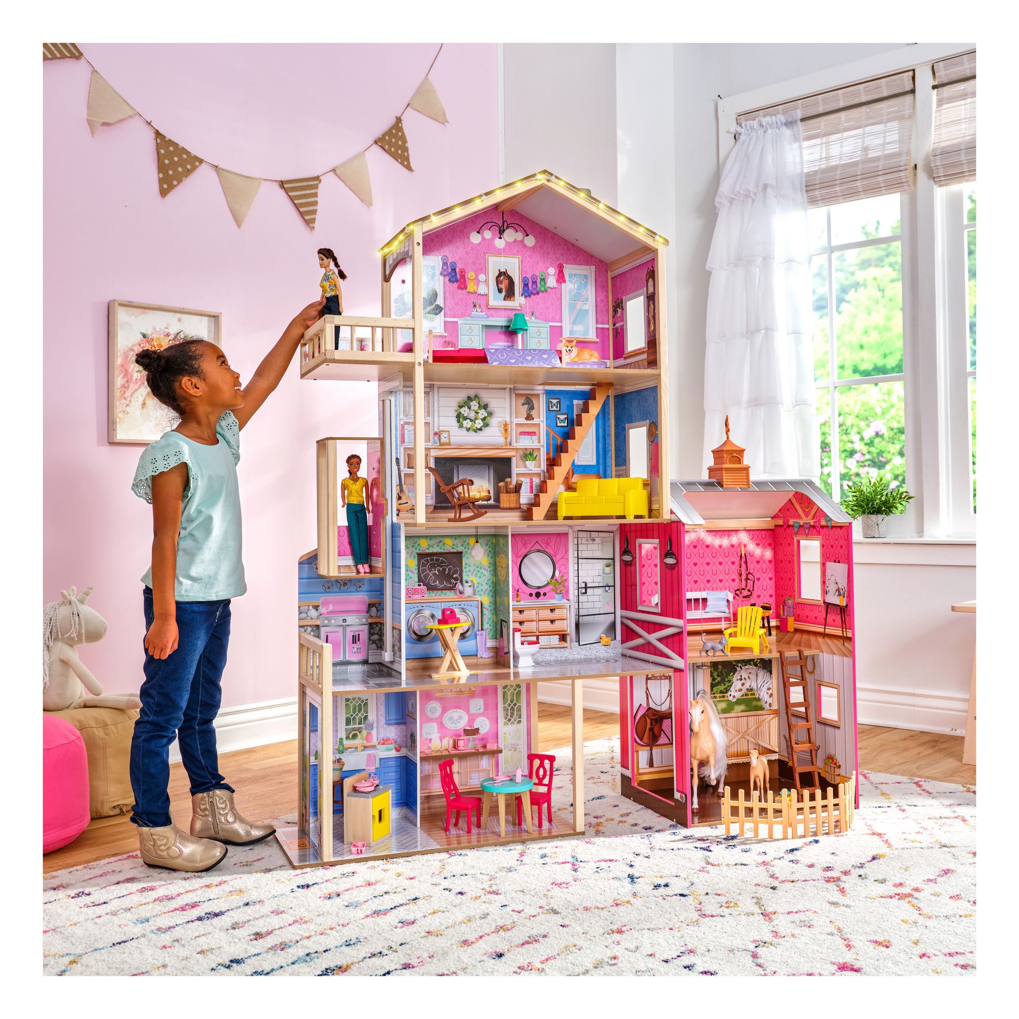 Gallop away with imagination in the impressive KidKraft Champion Wood Dollhouse and Horse Barn. 5' tall, this two-in-one wooden dollhouse features a four-story farmhouse connected to a two-story horse stable for double the fun. It includes two horses (big and small) with lights, sounds, and a full collection of furniture for instant play. From the kitchen to the laundry room to the bedroom, each space has unique furnishings to match. The sofa even opens up to reveal a storage area. Dolls can ride the elevator from the second floor to the third. A balcony floats from the bedroom for an extension of play. Trot over to the barn next door and visit the two horses in the stable. Give their manes a brush or feed them some hay, then head up to the loft via the ladder and soak in that peaceful country vibe with the barn cat close by. A spinning weathervane on top of the roof is the perfect finishing touch. And with 43 accessories, the Champion Wood Dollhouse and Horse Barn from KidKraft is truly a winner for made-to-last play.