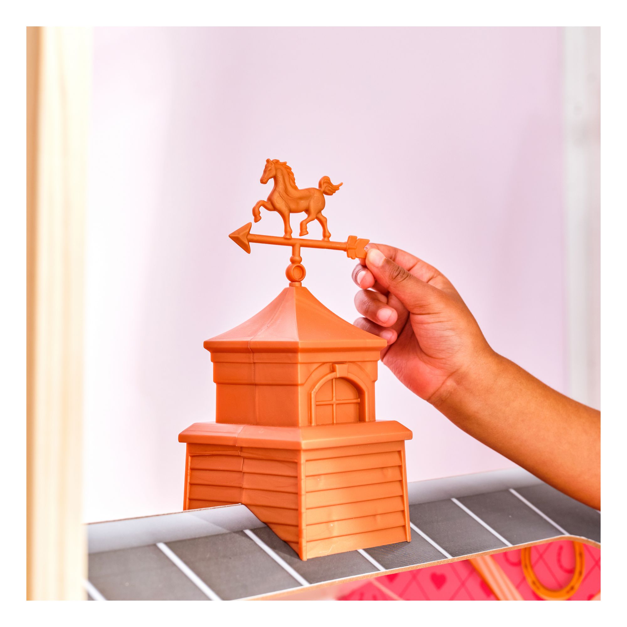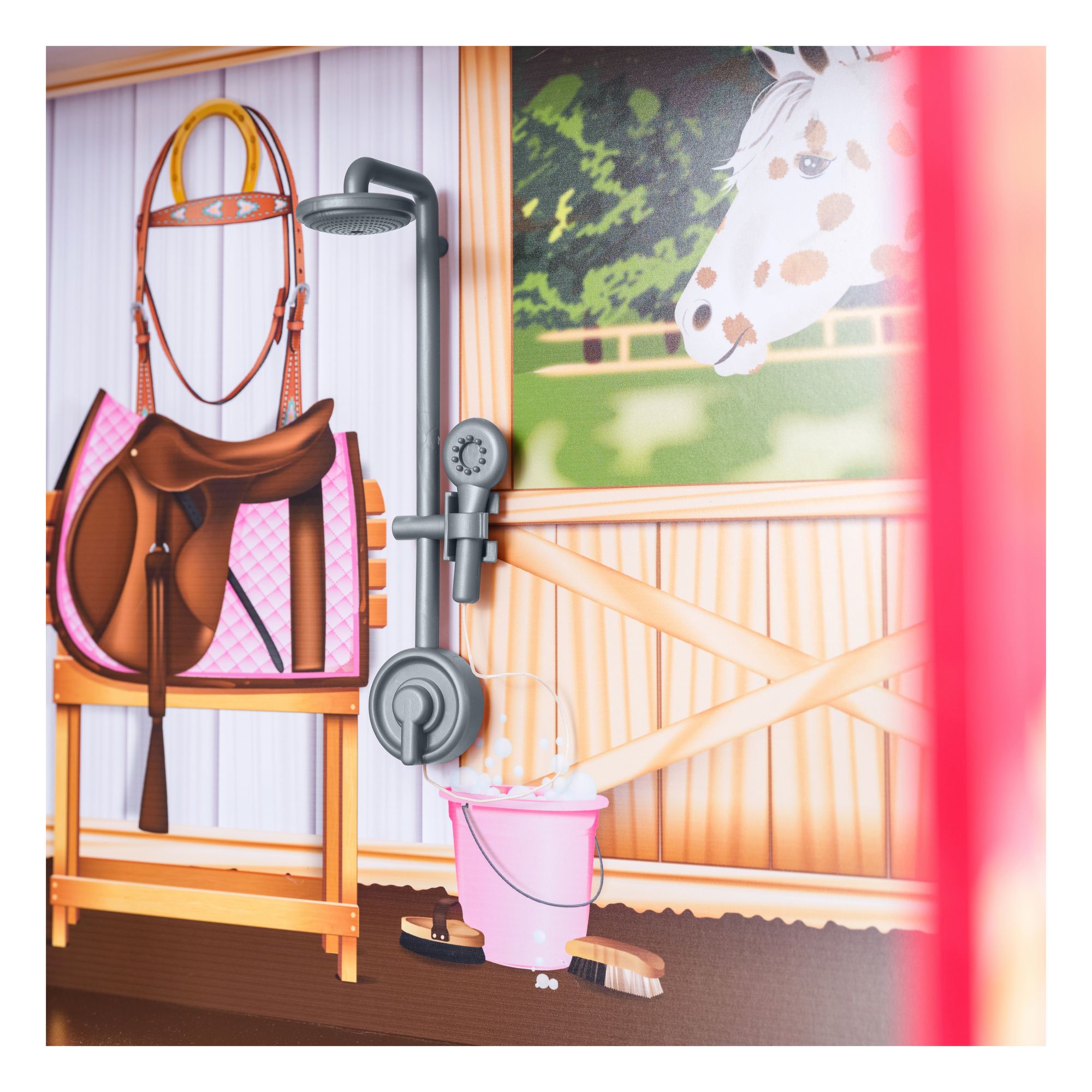 The Barn includes a movable fence, a horse washing station with a showerhead, and a spinning weathervane