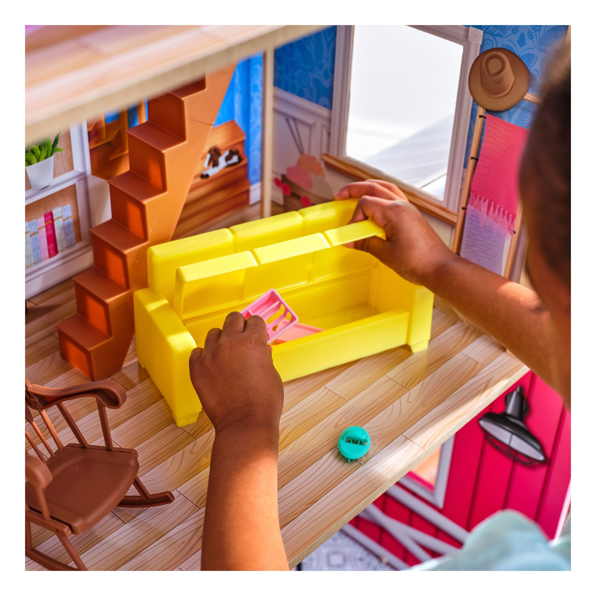 Includes wooden dollhouse, horse, pony, fence, rocking chair, Adirondack chair, sofa, lamp, ladder, stove, ironing board, table-chair set, and kitchen accessories.