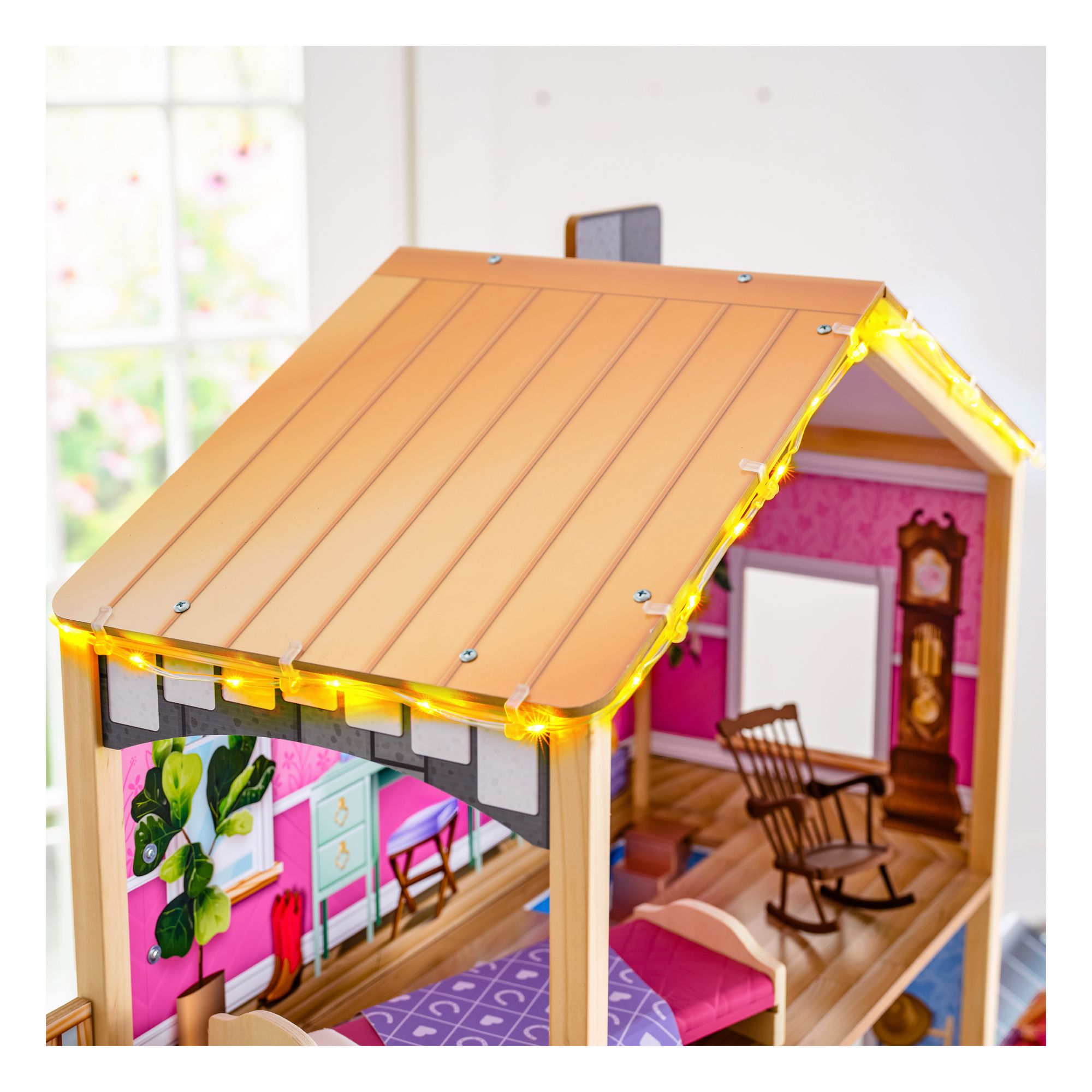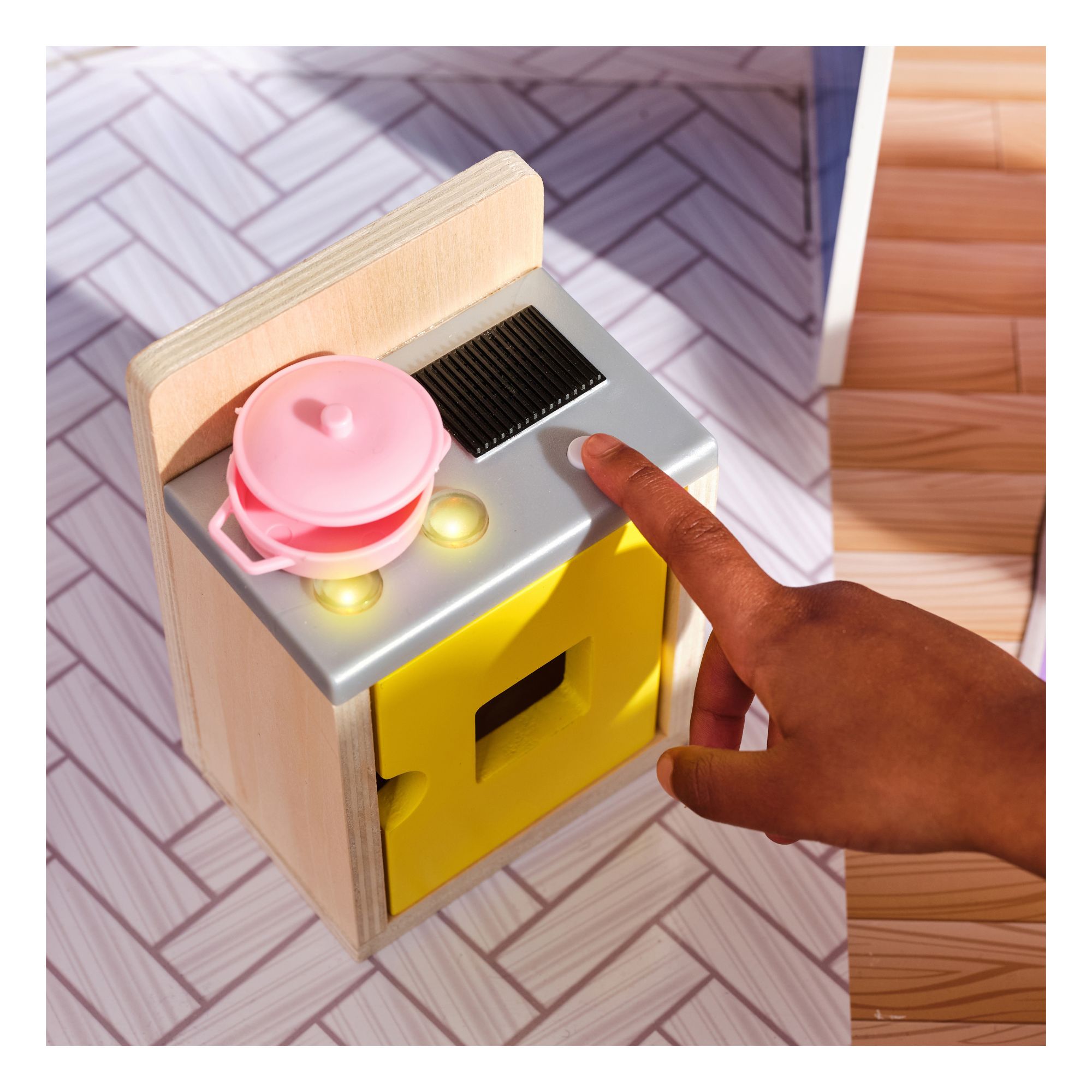 Three lights and sounds: The toilet has a realistic flushing sound. The stove lights up, makes sounds, and rooftop string lights