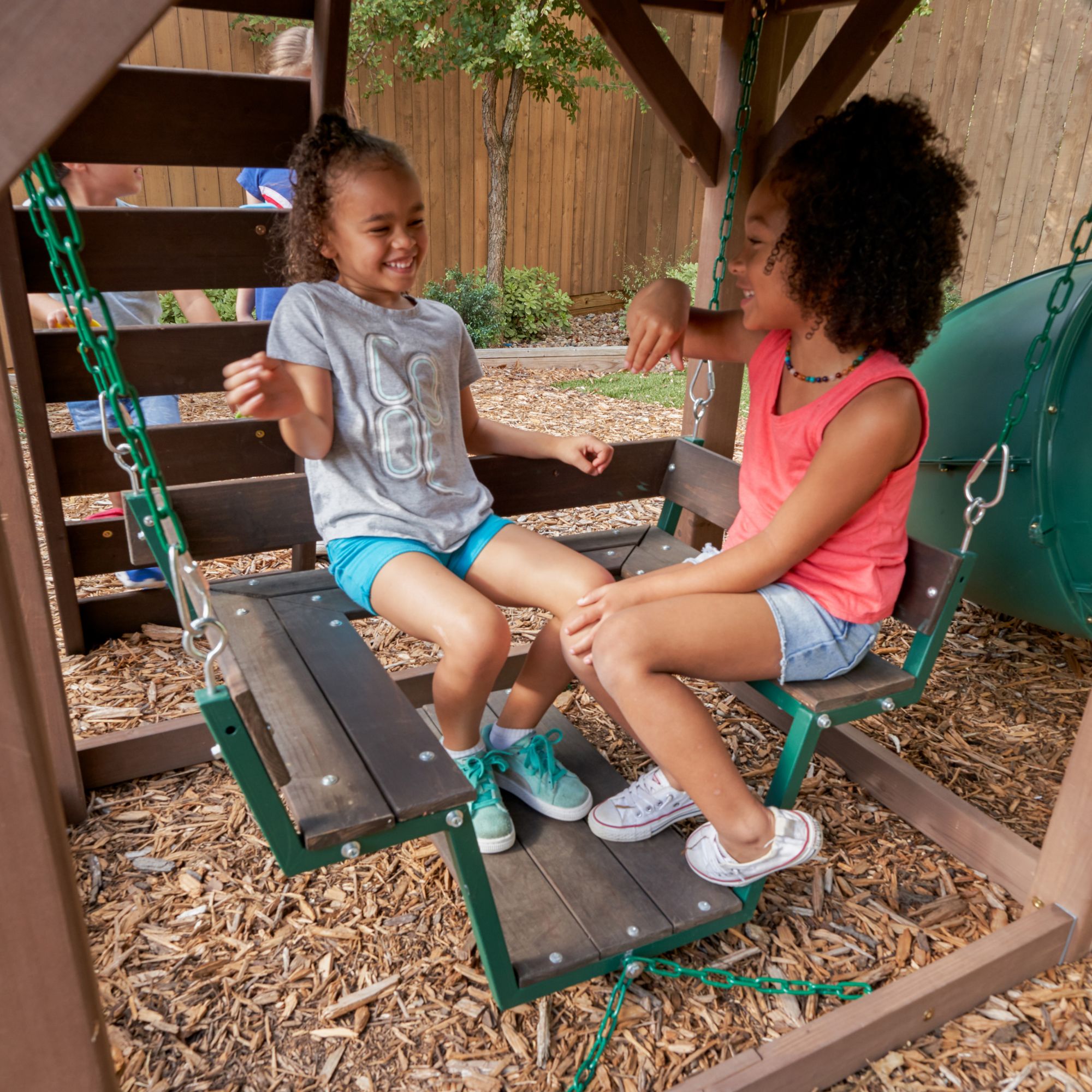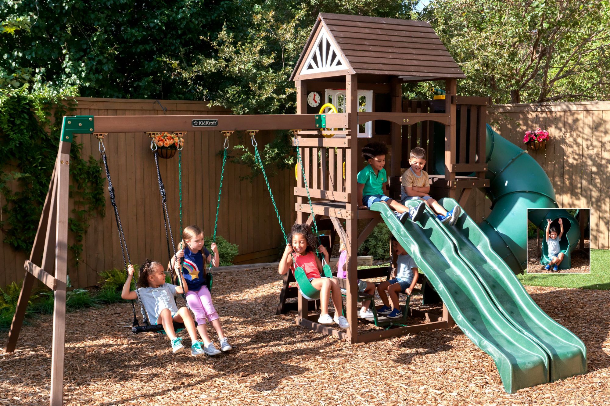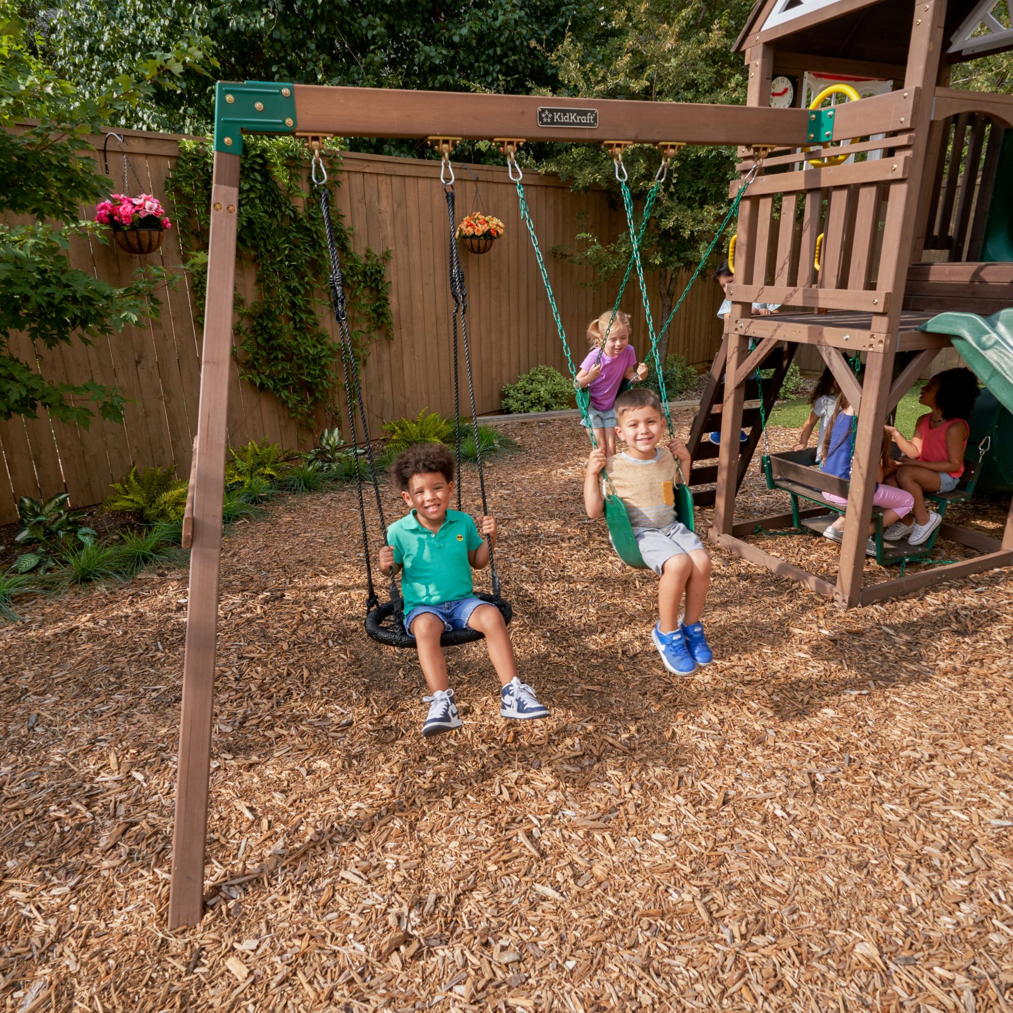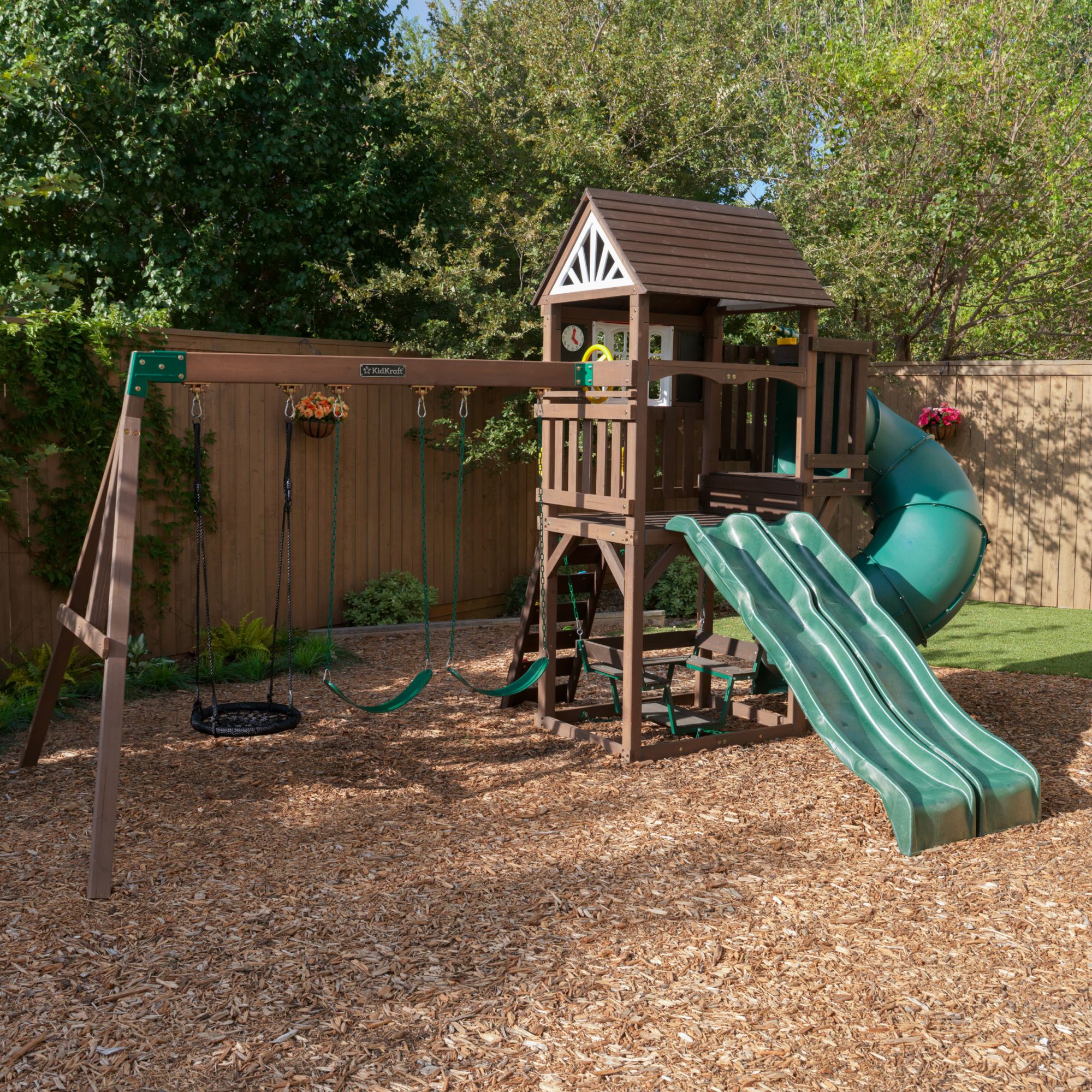 The KidKraft Portland Swing Setwill delight and intrigue kids at every turn, climb and glide. Besides its well-loved belt swings, this set offers up a web swing where kids can sit or stand and enjoy catching the breeze with a different view. Journey to the top of the playset via the colorful rock wall and discover a cozy clubhouse, complete with adventurous crow's nest and telescope that spots fun a mile away. A double slide and a tube slide offer up rounds of excitement. When it's time to take a rest or visit with friend, a chat seat is tucked underneath the clubhouse, and makes for a snug spot for sharing stories and snacks. Extras include built-in chalkboards and clocks to keep minds just as actives as their bodies. Parents will love the playset's durable cedar wood construction, child-friendly, water-based stain and organized hardware boxes for frustration-free assembly.
