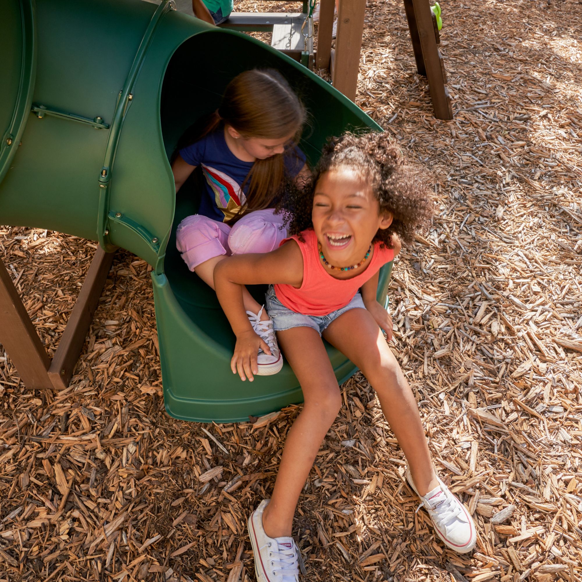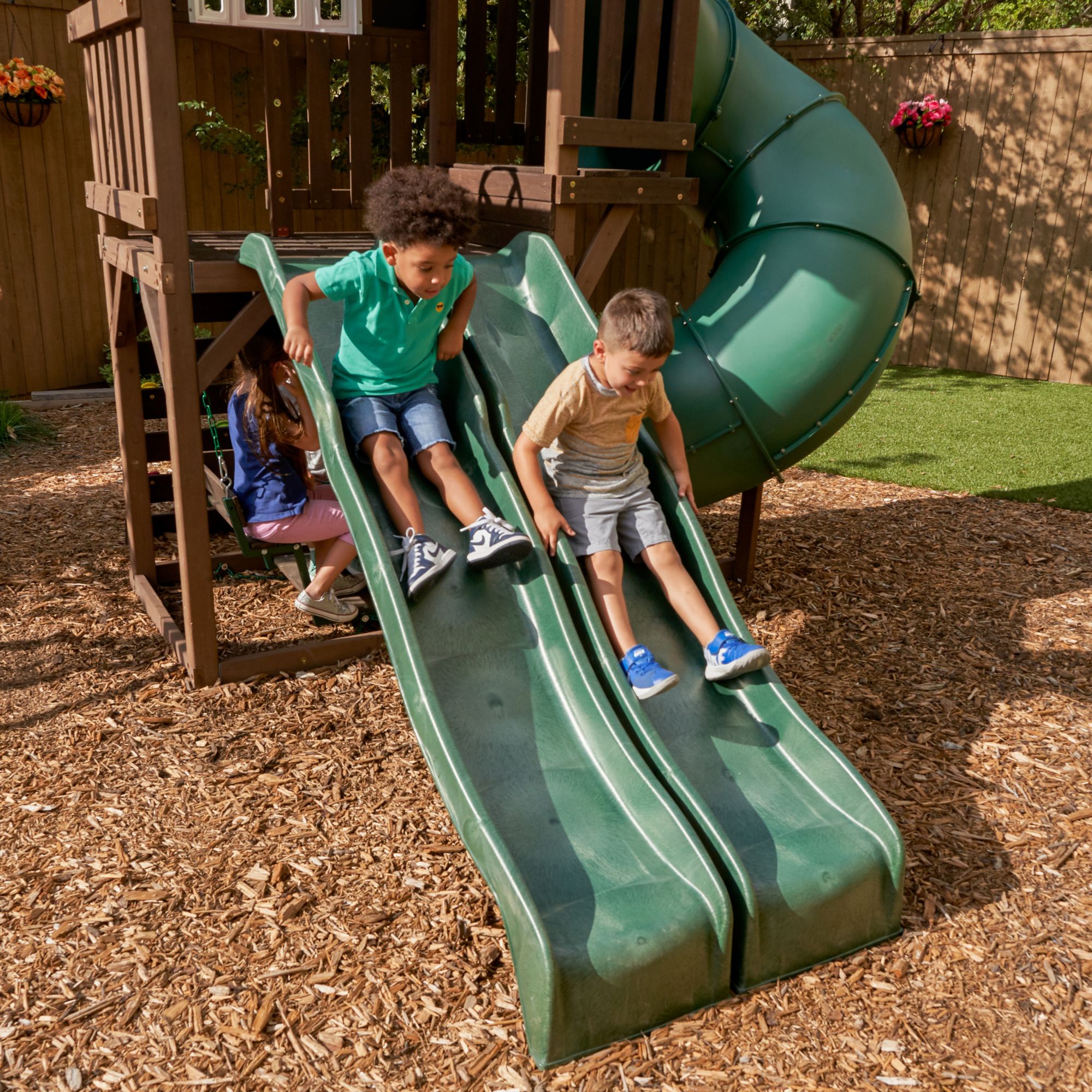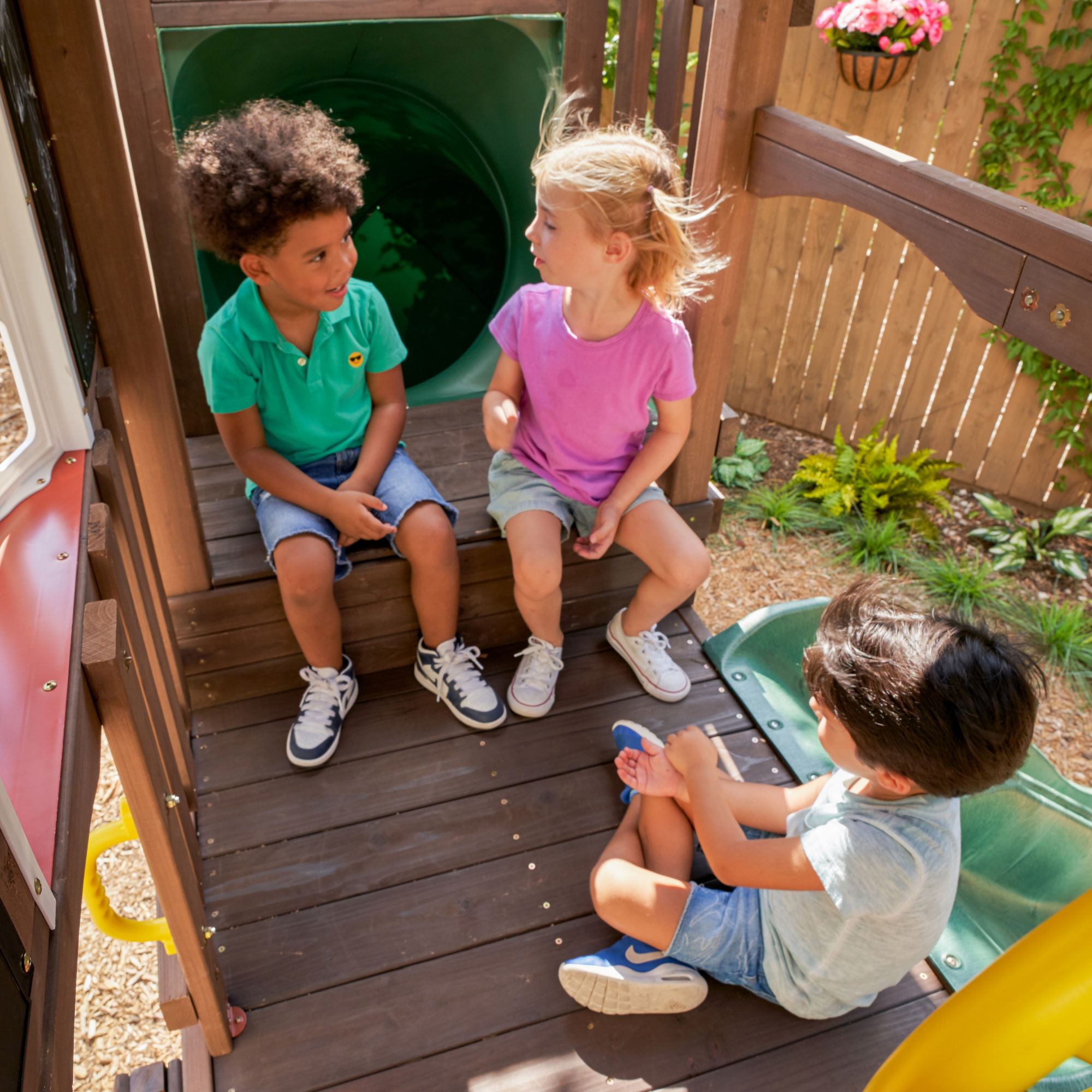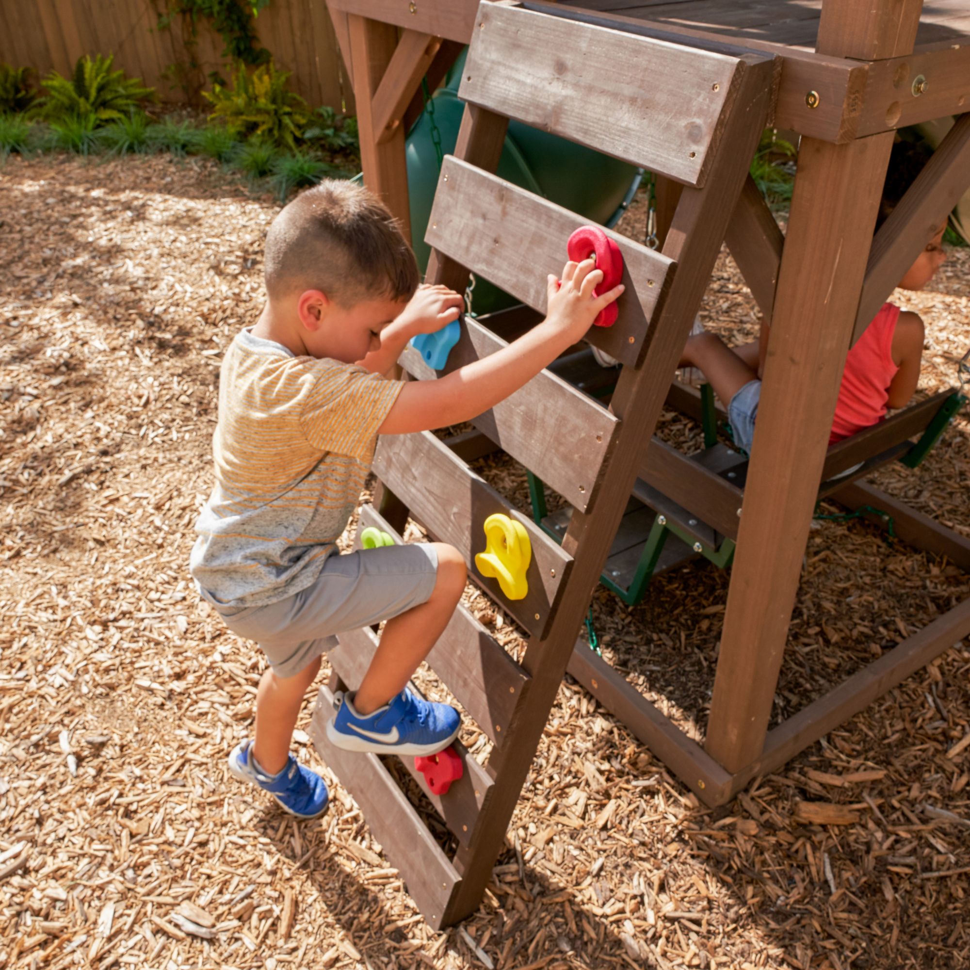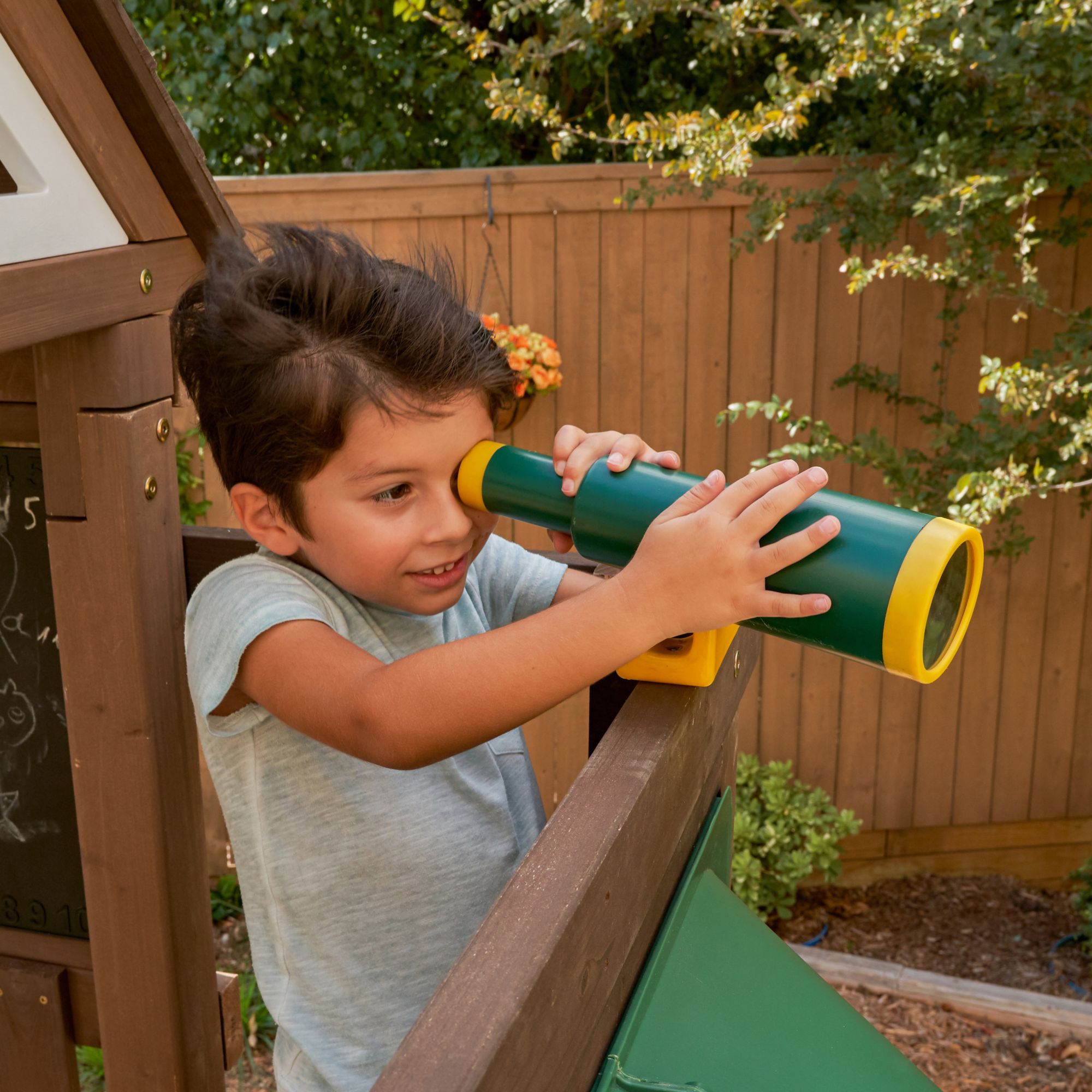 The KidKraft Portland Swing Setwill delight and intrigue kids at every turn, climb and glide. Besides its well-loved belt swings, this set offers up a web swing where kids can sit or stand and enjoy catching the breeze with a different view. Journey to the top of the playset via the colorful rock wall and discover a cozy clubhouse, complete with adventurous crow's nest and telescope that spots fun a mile away. A double slide and a tube slide offer up rounds of excitement. When it's time to take a rest or visit with friend, a chat seat is tucked underneath the clubhouse, and makes for a snug spot for sharing stories and snacks. Extras include built-in chalkboards and clocks to keep minds just as actives as their bodies. Parents will love the playset's durable cedar wood construction, child-friendly, water-based stain and organized hardware boxes for frustration-free assembly.