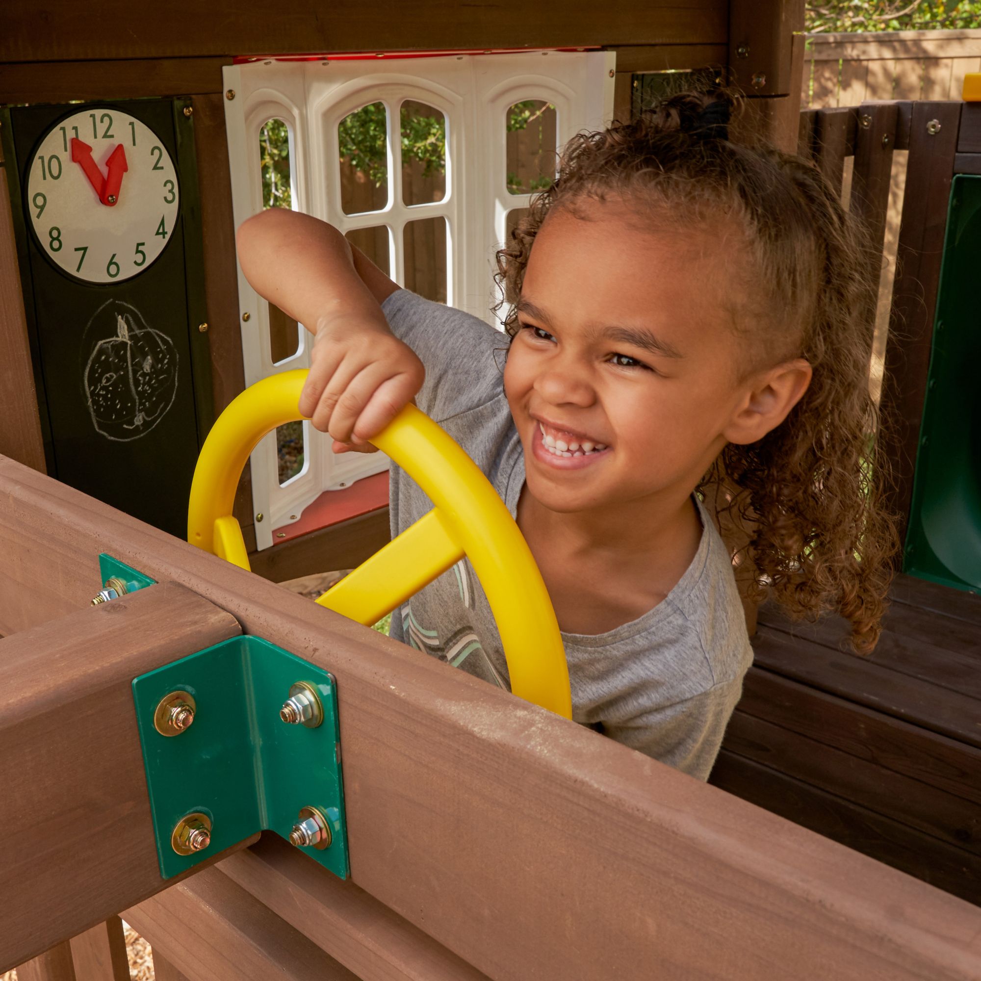 Web swing and two belt swings Two chalkboards with clocks Telescope Steering wheel Rock wall ladder with multicolor rocks EZ Kraft assembly hardware box Double slides Crow's nest with tube slide Chat swing Includes Portland Playset and Swing Set, and assembly instructions Warranty: 5 years limited