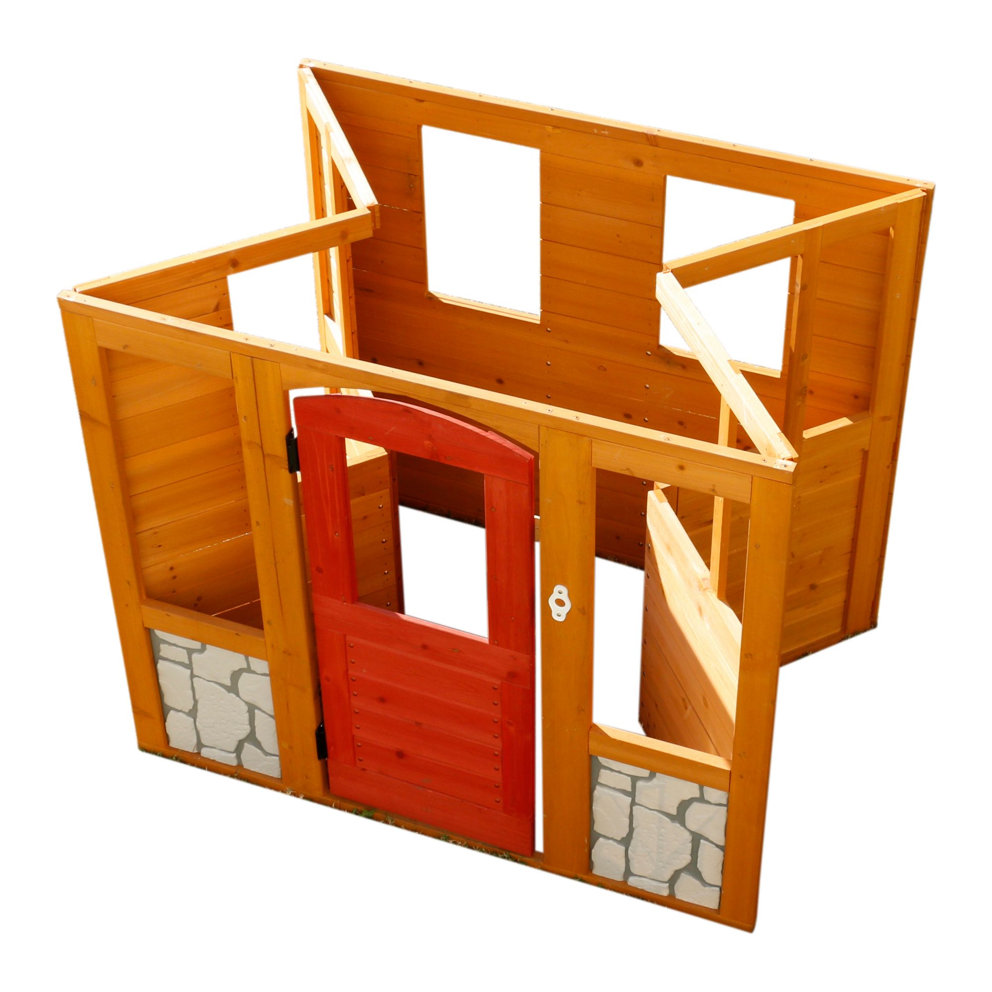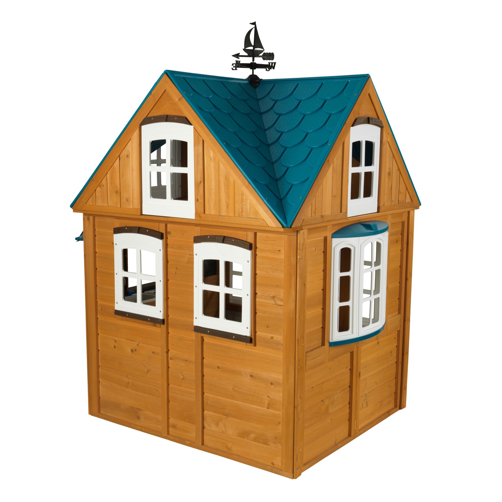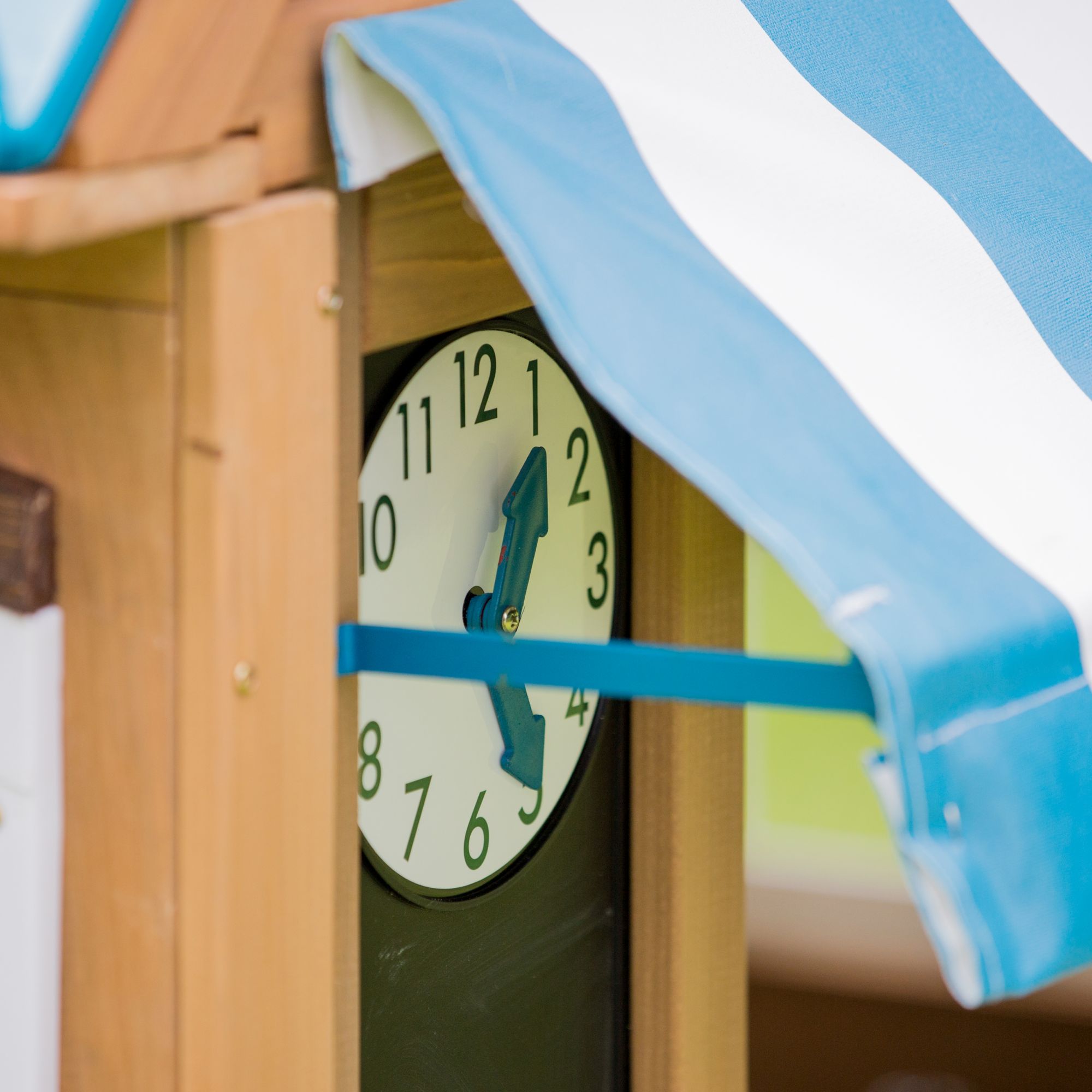 Made with 100% wood materials Plastic molded scalloped roof in a pretty sea blue color Doorbell that rings Play kitchen with an included pot, pan and spatula Premium bay windows and four upper windows Cafe-style striped canopy over open serving window and moveable bench Working front door Functional weather vane with cute sailboat ornament Two play clocks with moveable hands and 2 double-sided chalkboards Includes Seaside Cottage playhouse and applicable assembly instructions Warranty: 90 days limited