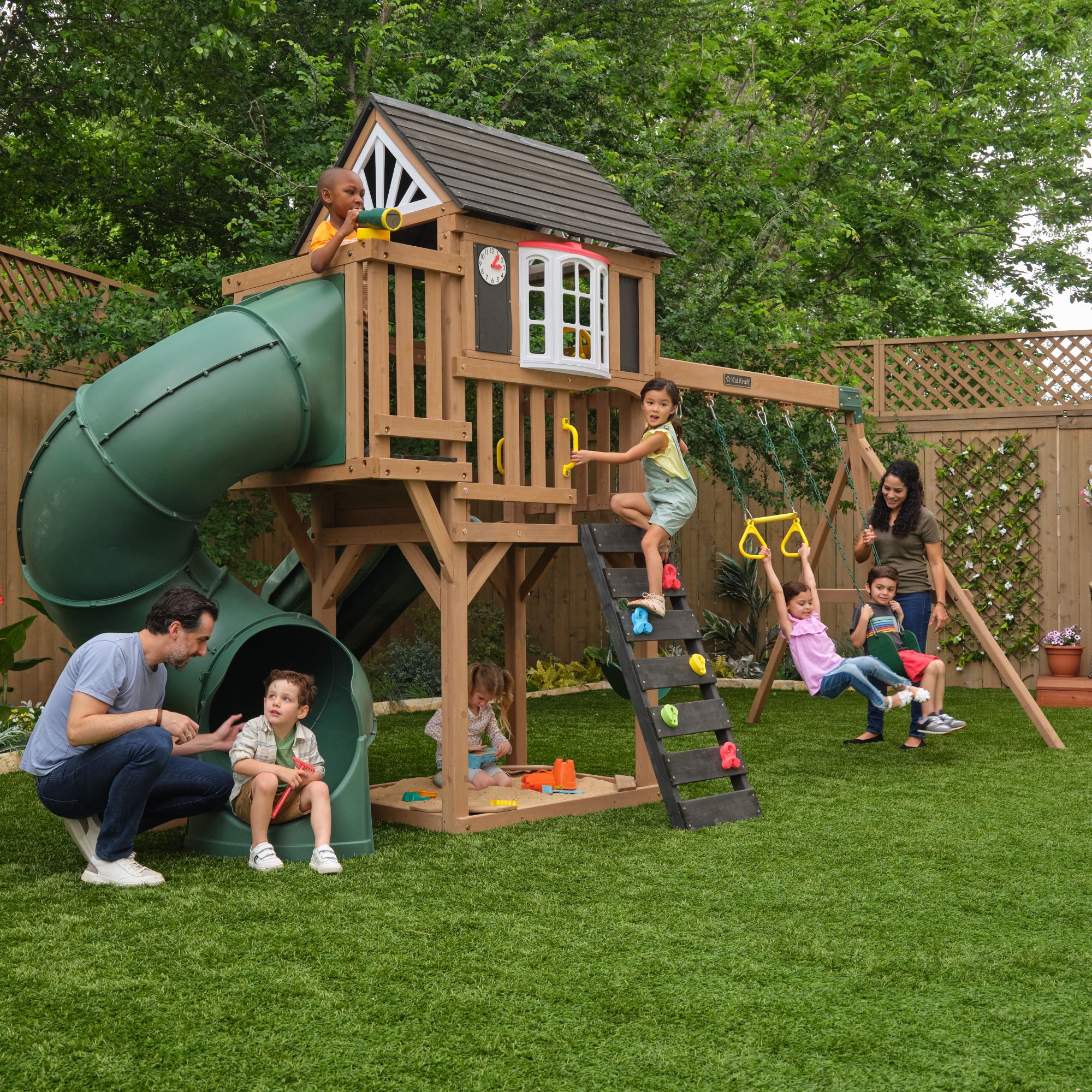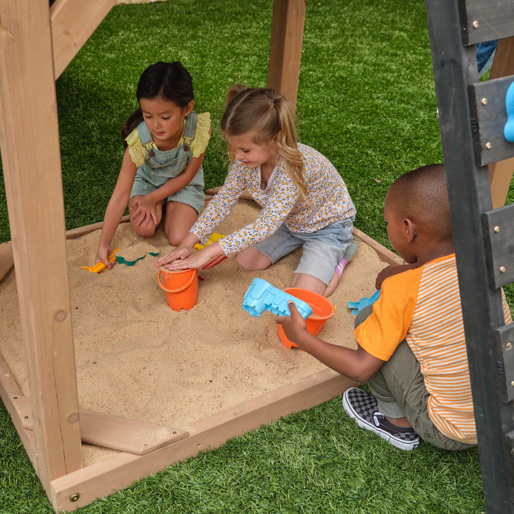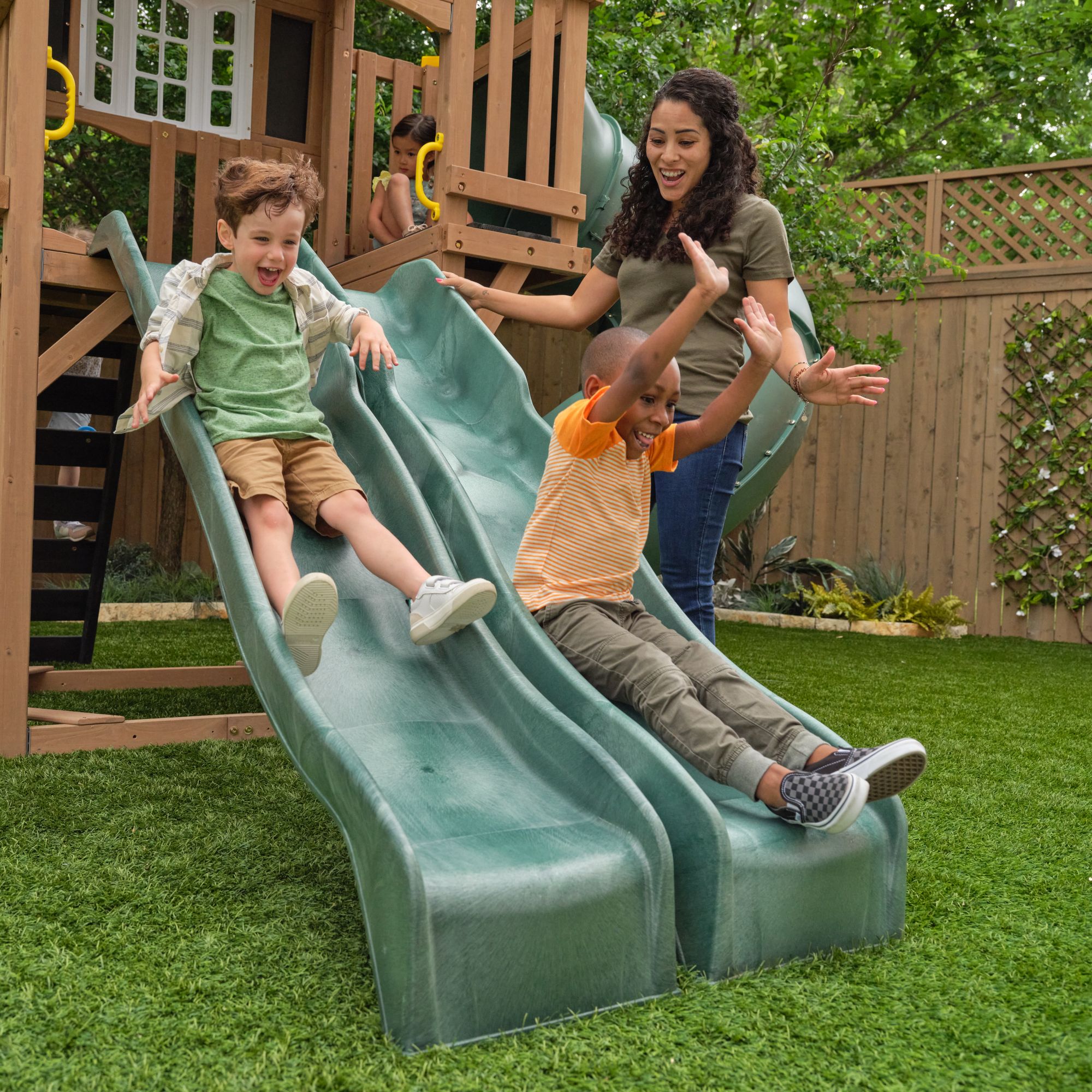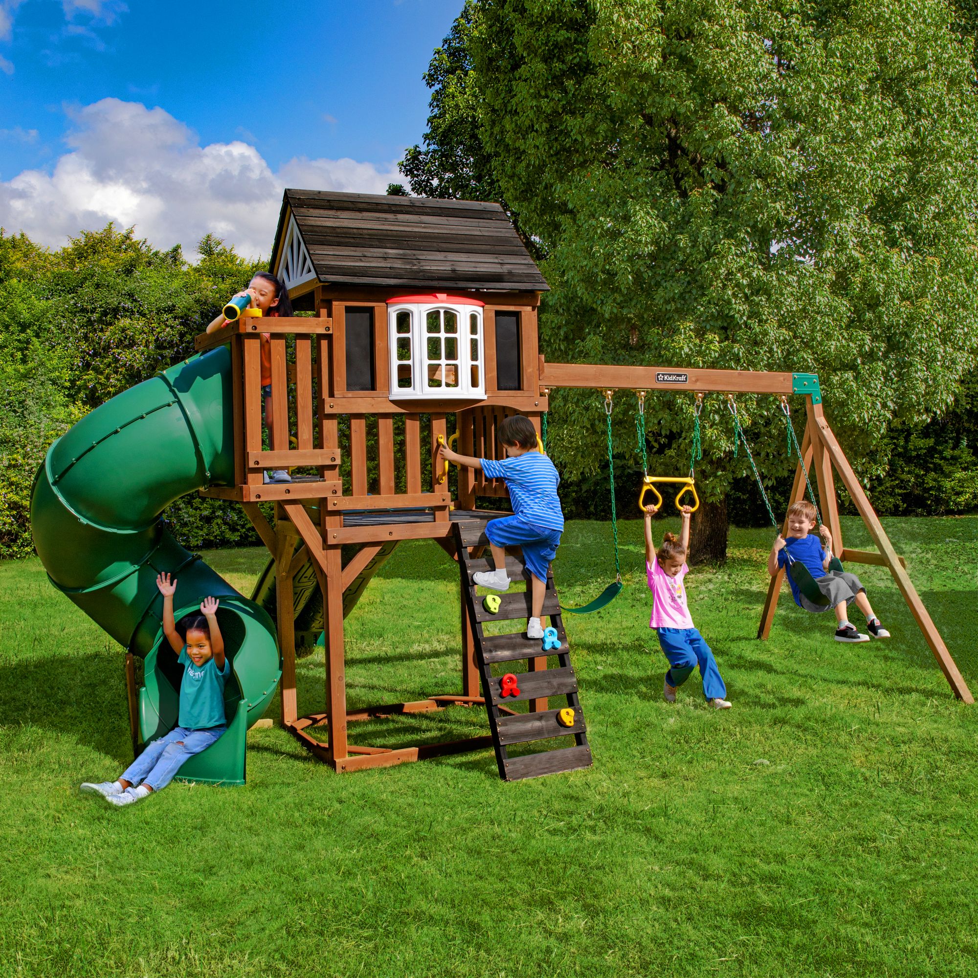 Trying to decide whether to get your kids a swing set or a playhouse? Well, with the KidKraft Timberlake Swing Set, you don't have to compromise. This wooden outdoor playset offers up all the features that both you and your kids want in the backyard. With three swinging options, three slides, rock wall and clubhouse, it'll keep children busy outside from sunup to sundown. Invite friends over even—there's plenty of room for sharing! The two wavy slides even encourage a little friendly racing competition. Ascend to the playhouse via the ladder/rock wall combo and watch imagination come alive. Pretend you're in the jungle researching a new species of monkeys or you're simply living in a remote treehouse. Then, take the twisty wave slide (or pretend it's a waterfall) to the ground and run around to the swings to take to the skies. And, since the structure is made of wood and includes a limited 5-year warranty, you know there'll be plenty of days for even more active fun.