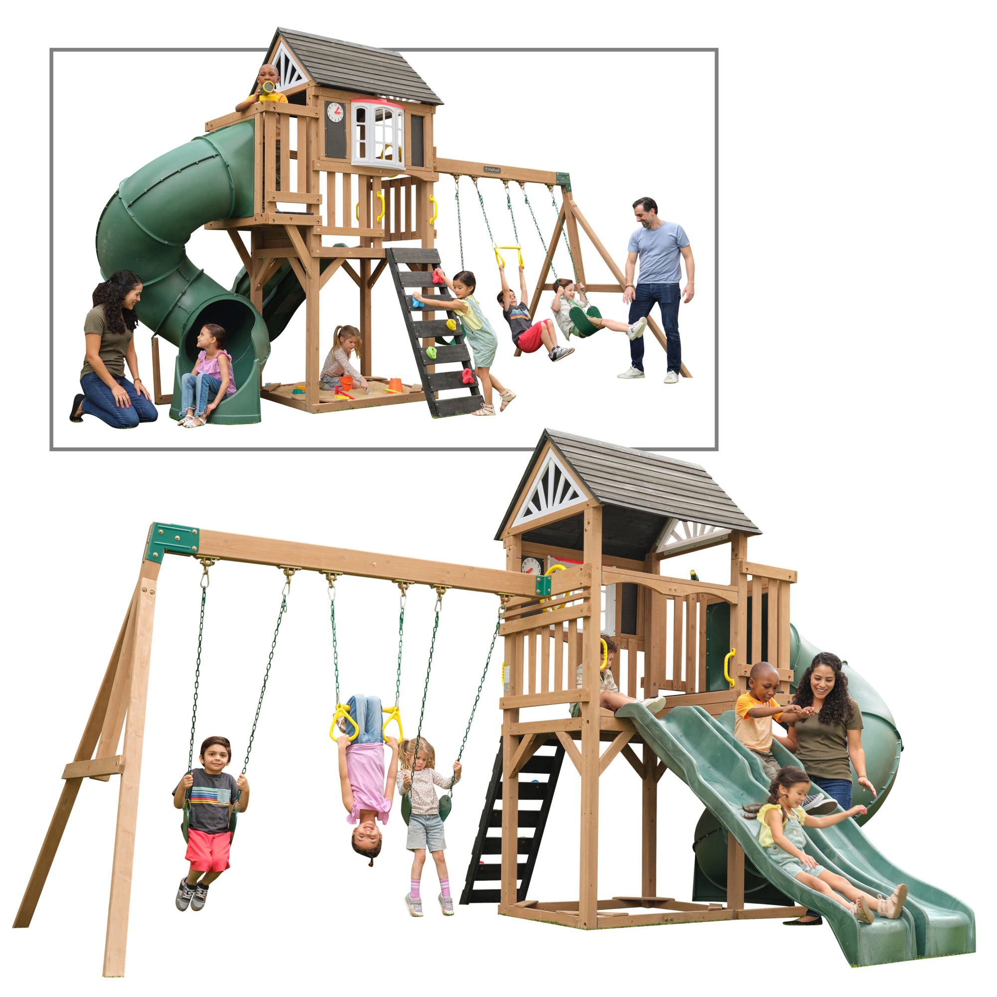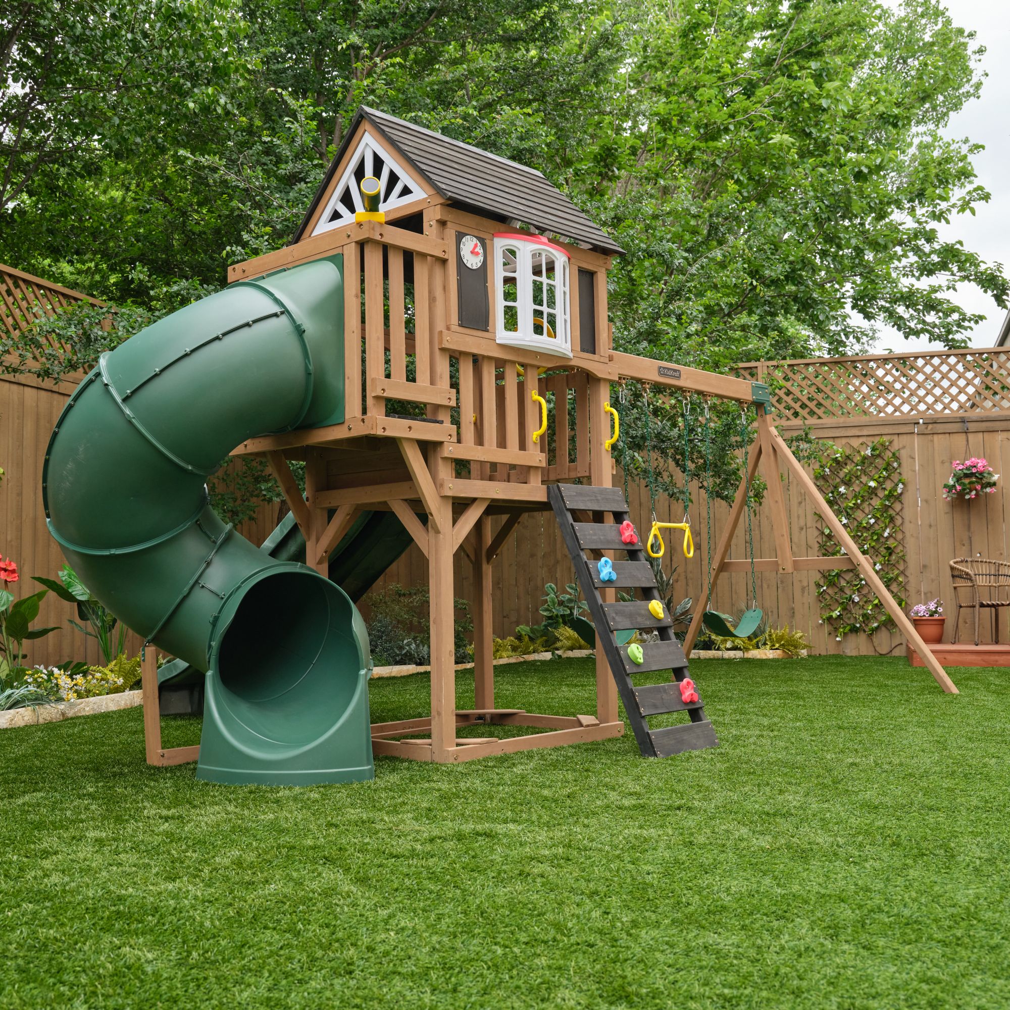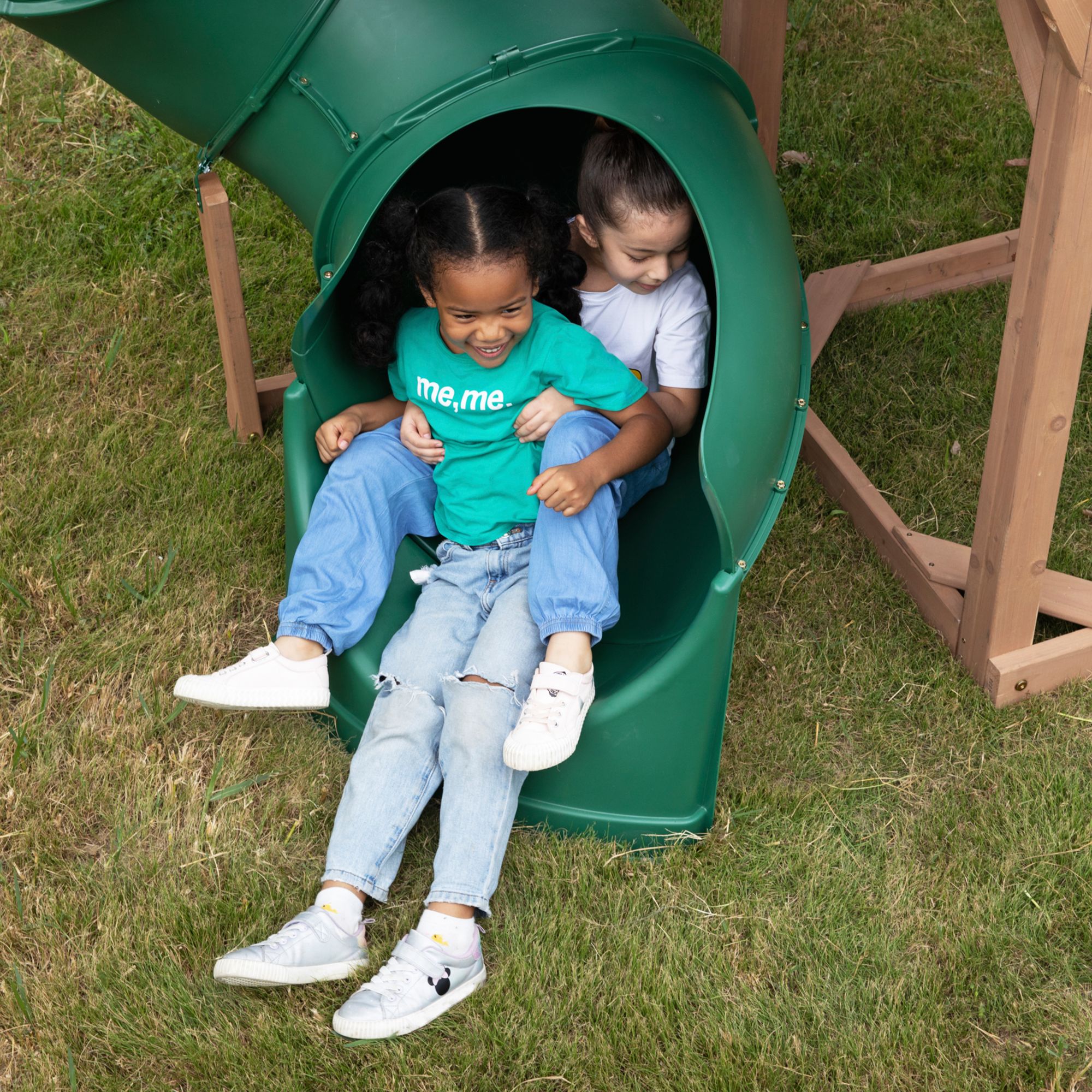 Trying to decide whether to get your kids a swing set or a playhouse? Well, with the KidKraft Timberlake Swing Set, you don't have to compromise. This wooden outdoor playset offers up all the features that both you and your kids want in the backyard. With three swinging options, three slides, rock wall and clubhouse, it'll keep children busy outside from sunup to sundown. Invite friends over even—there's plenty of room for sharing! The two wavy slides even encourage a little friendly racing competition. Ascend to the playhouse via the ladder/rock wall combo and watch imagination come alive. Pretend you're in the jungle researching a new species of monkeys or you're simply living in a remote treehouse. Then, take the twisty wave slide (or pretend it's a waterfall) to the ground and run around to the swings to take to the skies. And, since the structure is made of wood and includes a limited 5-year warranty, you know there'll be plenty of days for even more active fun.