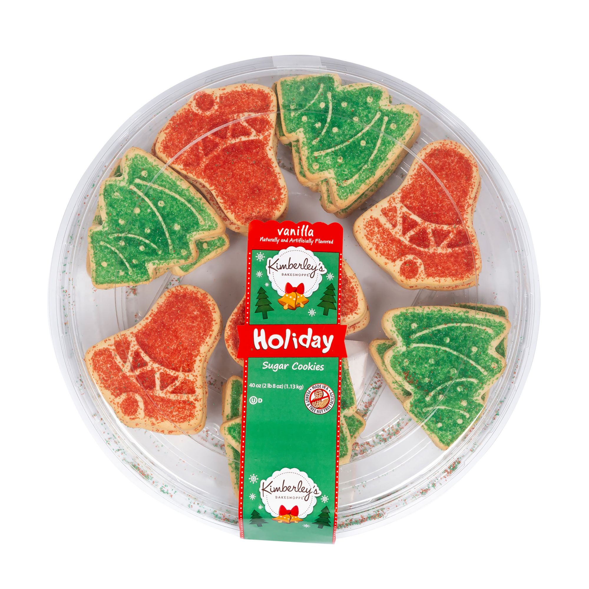 Kimberley's Bakeshoppe Bell And Tree Sugar Cookies are perfect for your next festive occasion. Enjoy these classic sugar cookies in red holiday bell and green tree shapes. This cookie platter is ready to serve, and easy to bring to your next gathering.
