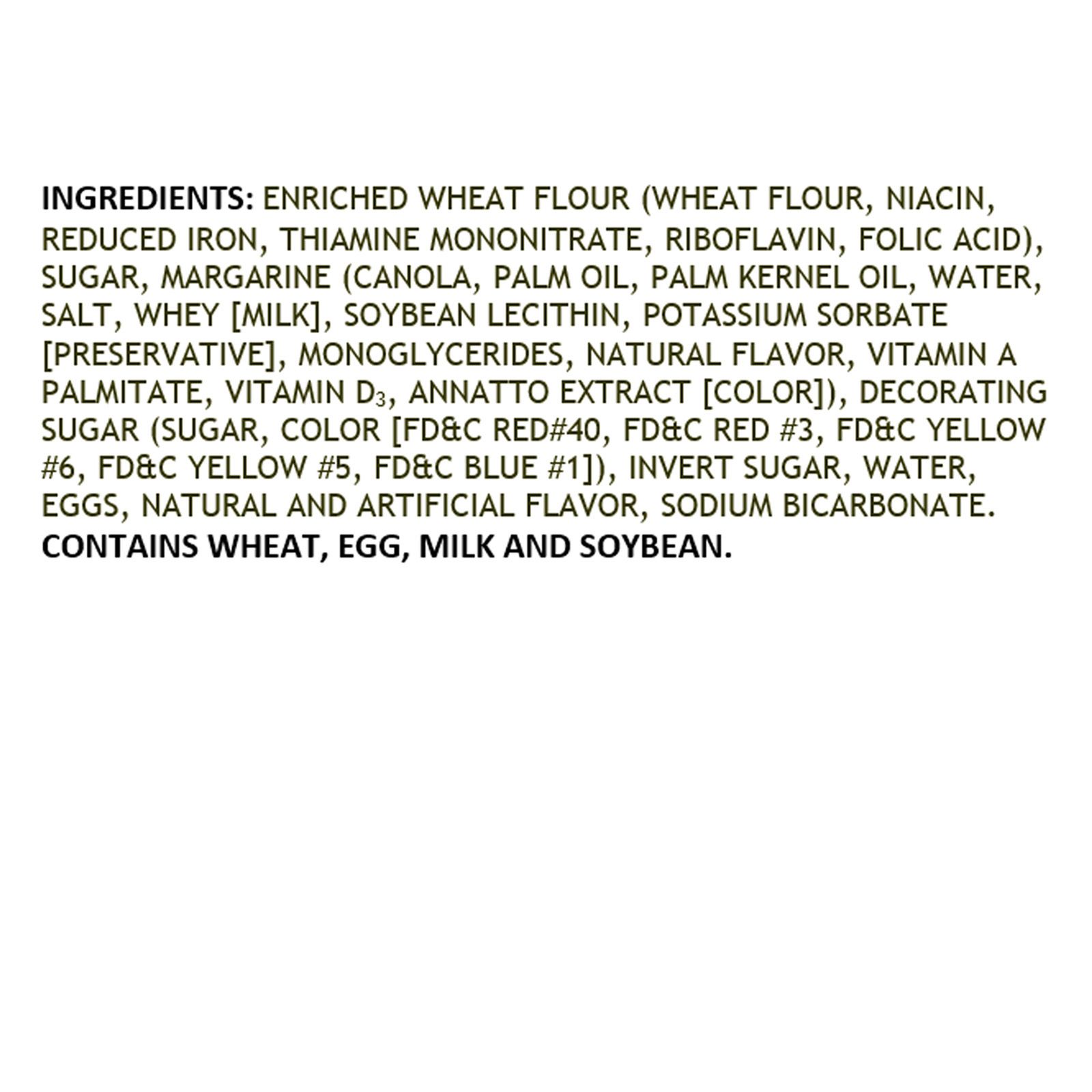 Ingredients: Enriched Wheat Flour (Wheat Flour, Niacin, Reduced Iron, Thiamine Mononitrate, Riboflavin, Folic Acid), Sugar, Margarine (Canola, Palm Oil, Palm Kernel Oil, Water, Salt, Whey [Milk], Soybean Lecithin, Potassium Sorbate [Preservative], Monoglycerides, Natural Flavor, Vitamin A Palmitate, Vitamin D3, Annatto Extract [Color]), Decorating Sugar (Sugar, Color [Fd&c Red#40, Fd&c Red #3, Fd&c Yellow #6, Fd&c Yellow #5, Fd&c Blue #1]), Invert Sugar, Water, Eggs, Natural And Artificial Flavor, Sodium Bicarbonate.