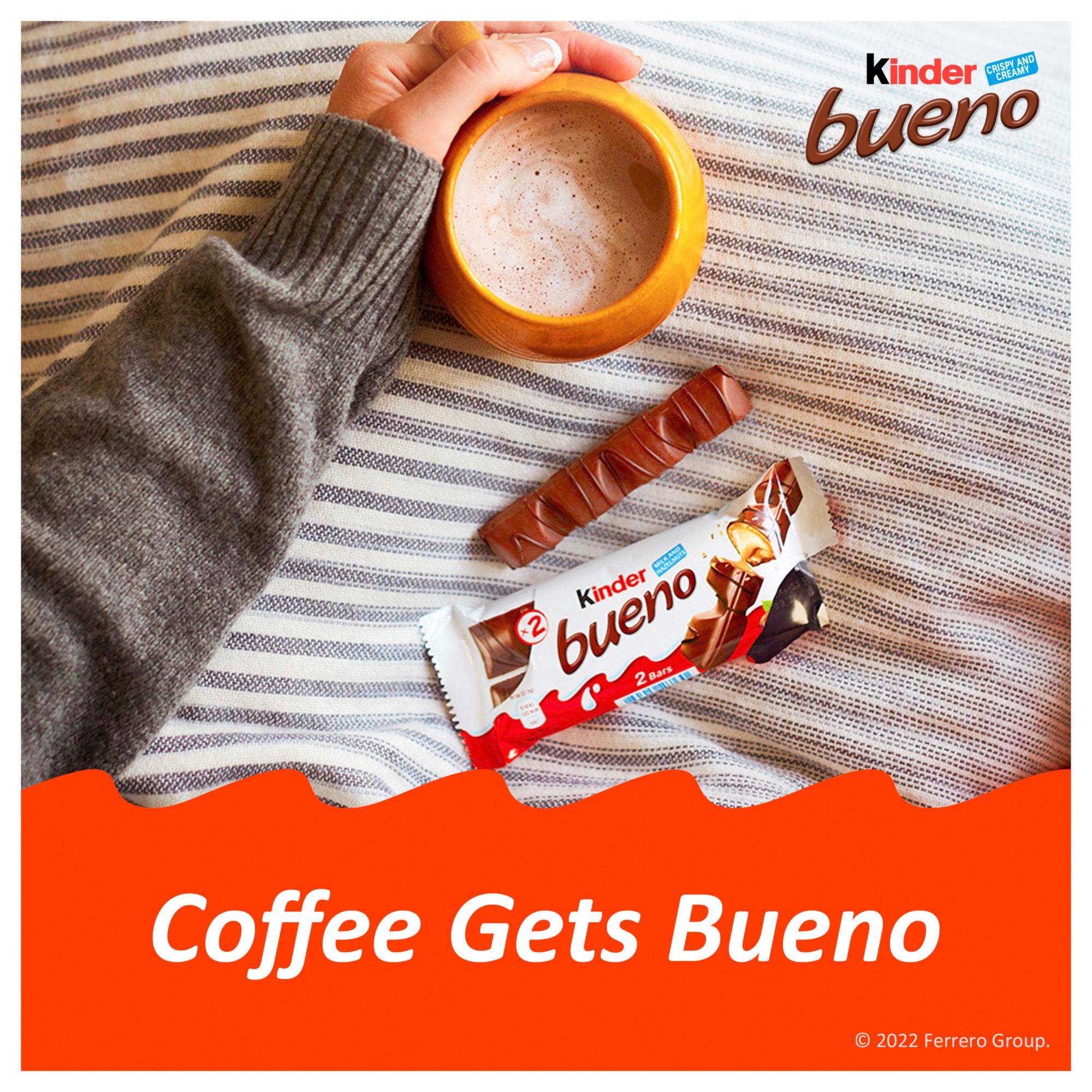 Treat yourself: Make an ordinary moment extraordinary by adding the crispy, creamy deliciousness of a Kinder Bueno milk chocolate bar to your coffee moment or movie night. You can also make your desserts and baked goods more delicious by topping them with Kinder Bueno