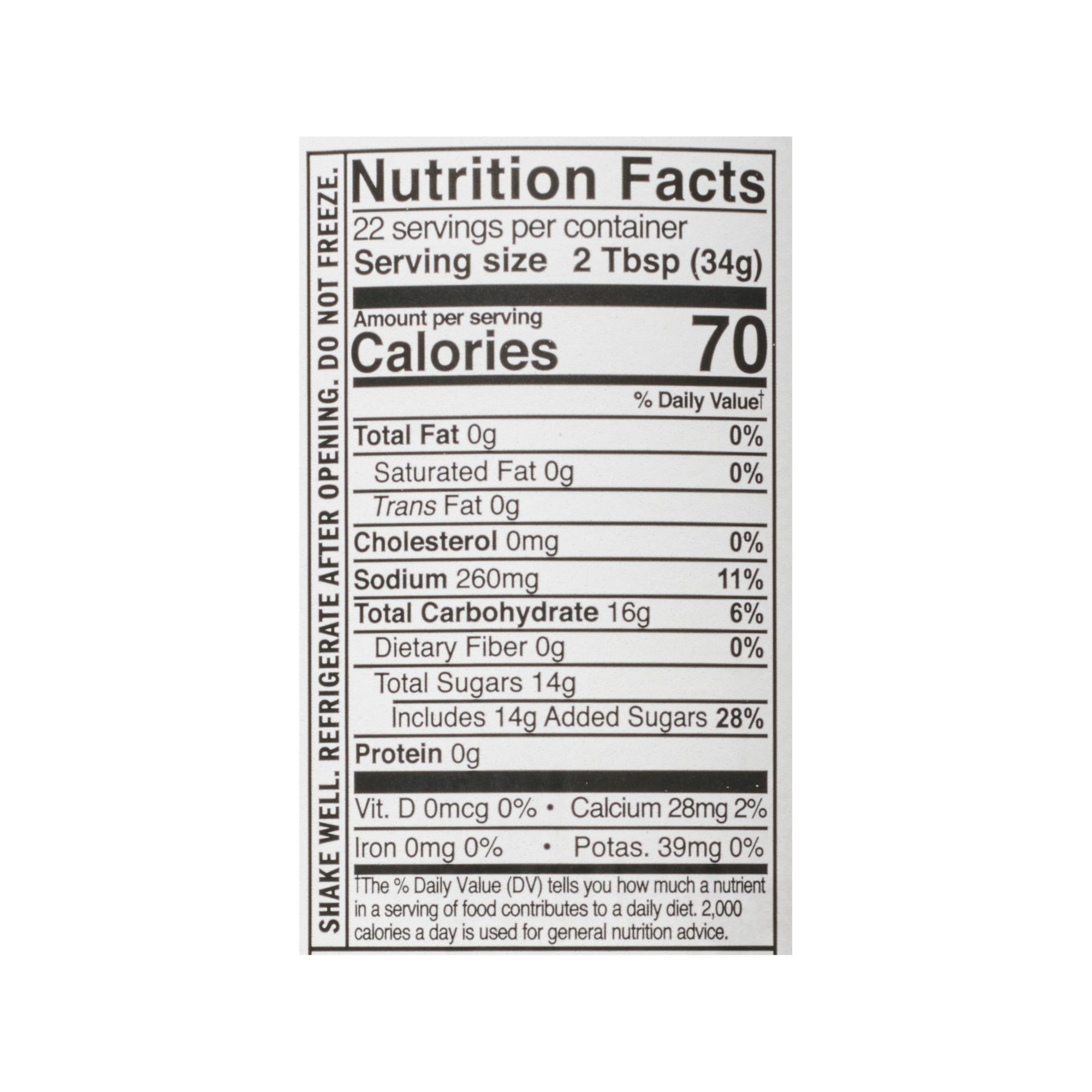 Ingredients: Tomato Puree (Water, Tomato Paste), Brown Sugar, Molasses, Vinegar, Sugar, Corn Starch, Salt, Worcestershire Sauce (Vinegar, Molasses, Corn Syrup, Water, Salt, Caramel Color, Garlic Powder, Sugar, Spices, Tamarind, Natural Flavor), Natural Smoke Flavor (Includes Natural Hickory Smoke Flavor), Garlic Powder, Onion Powder, Caramel Color, Ground Red Pepper, Xanthan Gum.