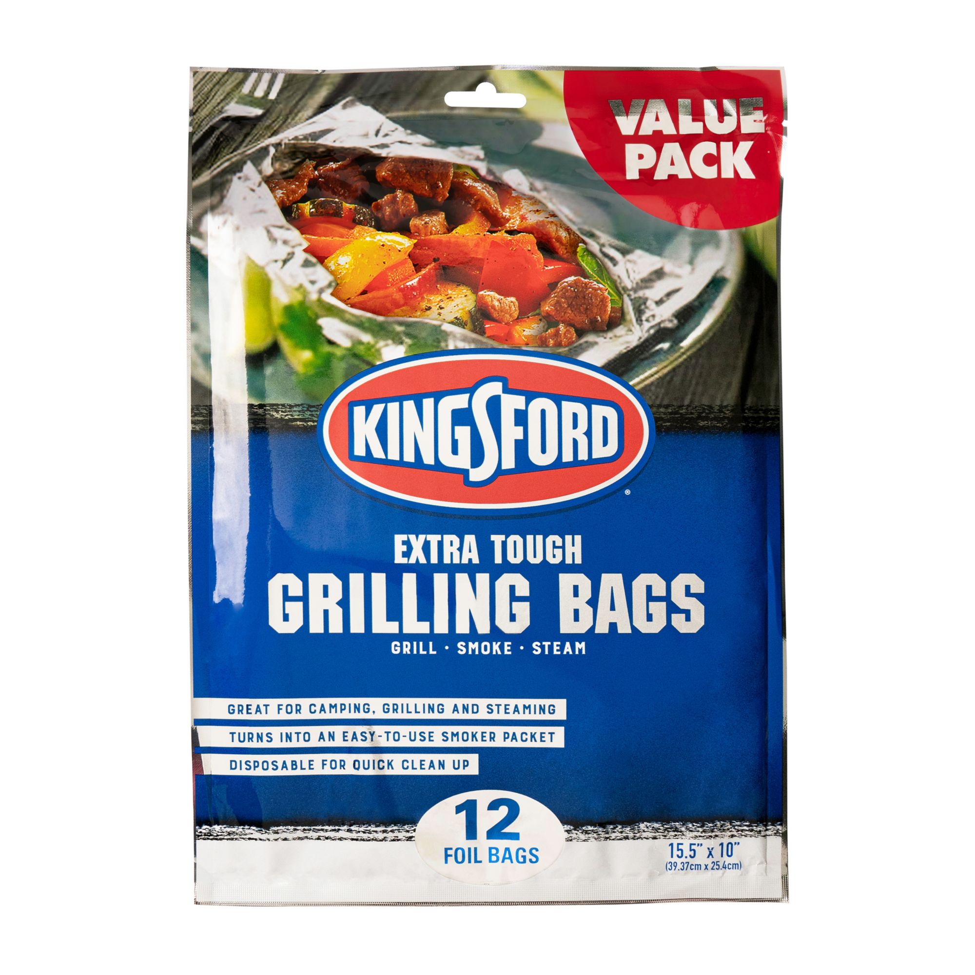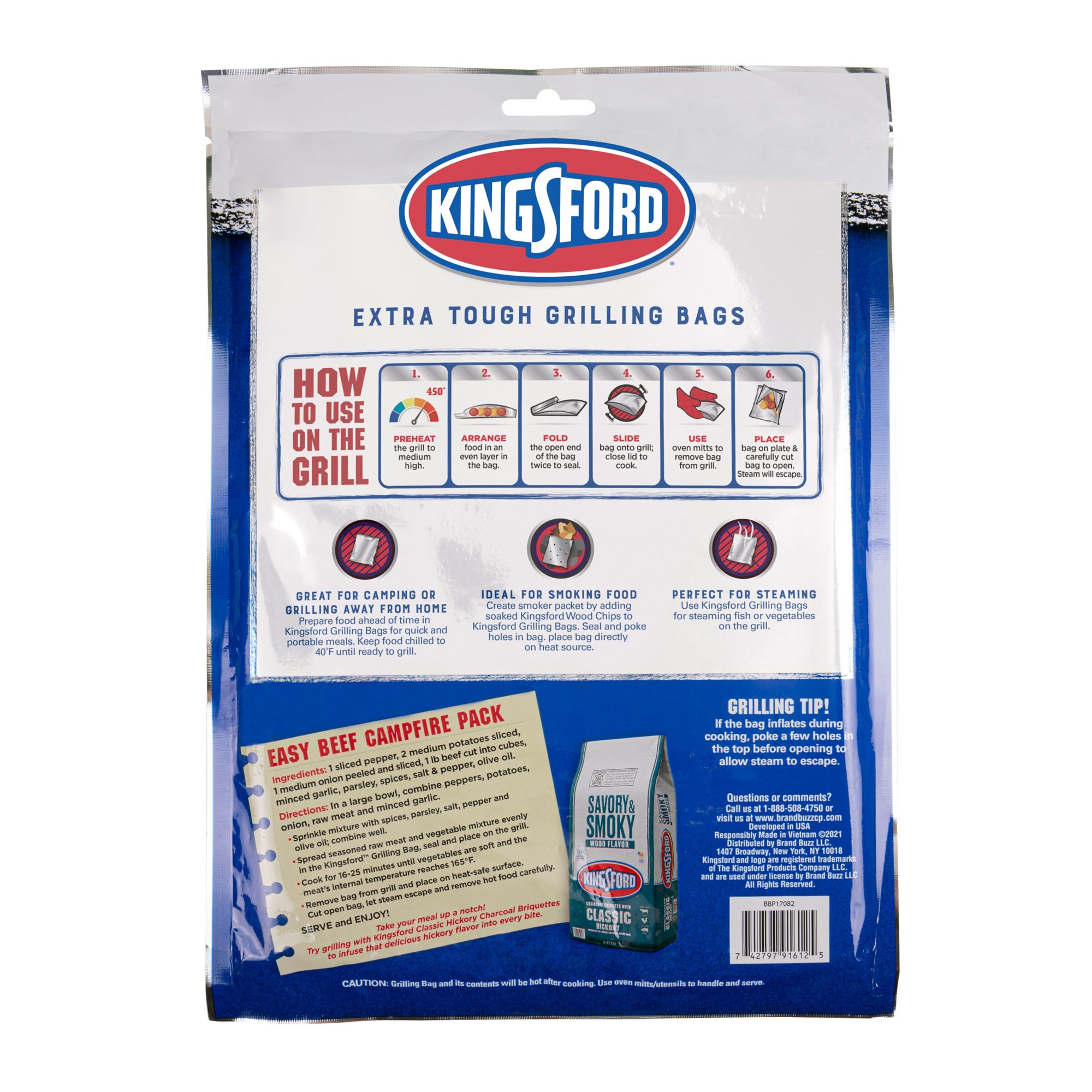 Kingsford high quality aluminum grill bags can be used for cooking, steaming, & smoking foods at low or high temperatures Kingsford grill bags are easy to use Heavy duty grill bags are great for camping, tailgating, or any grilling Prep food ahead of time in the Kingsford grilling bags for portable meals Keep food chilled to 40 degrees Fahrenheit until ready to grill