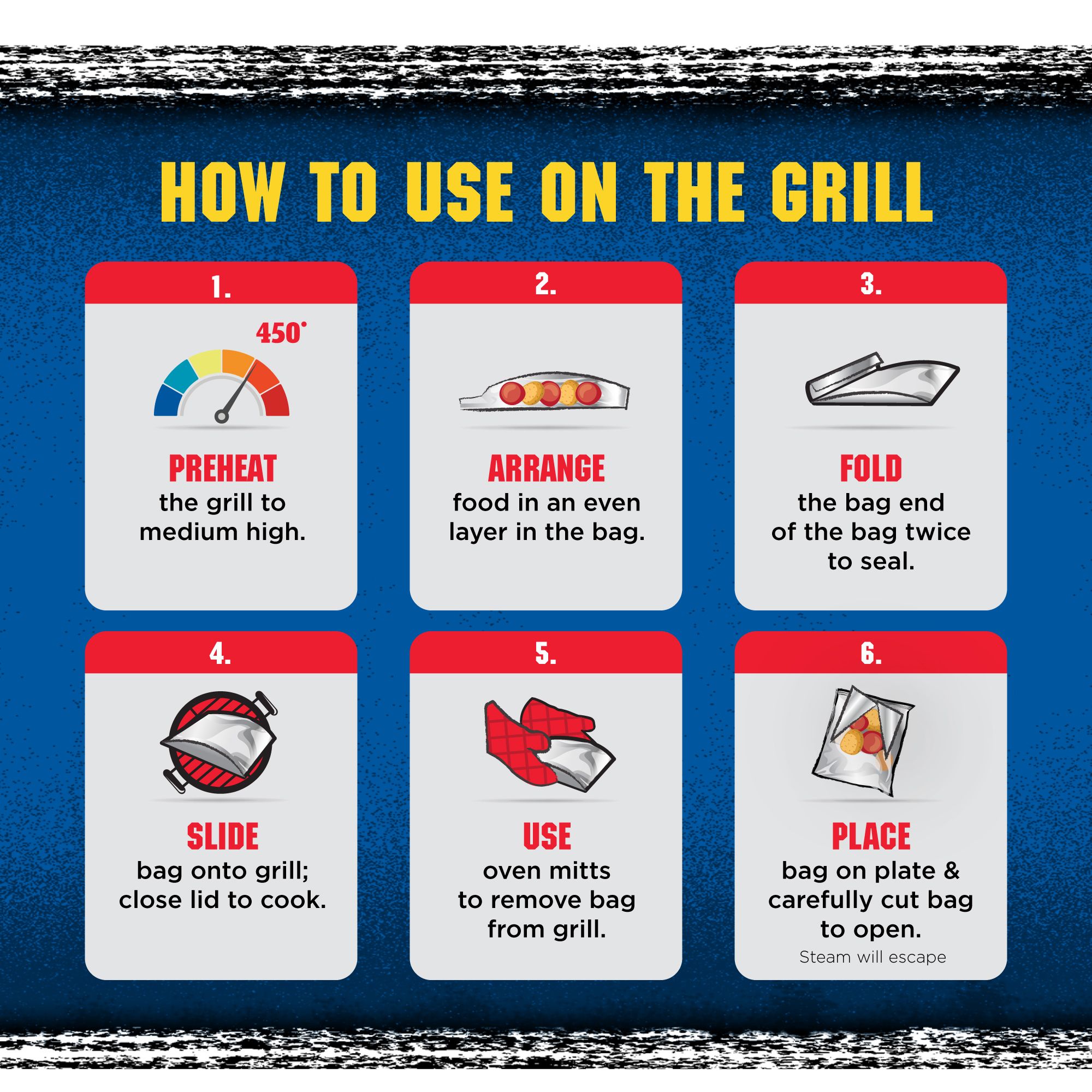Ideal for those looking to prep first and cook later, the Kingsford Grilling Bags are great for grilling on-the-go. Once you're ready to use, slide the bag directly onto the grill to cook. Once food is ready, use oven mitts to carefully remove the bag from the grill. Then place the bag on a heat-resistant plate and carefully cut it to open. These grilling bags are recyclable and disposable. They measure 15.5 inches x 10 inches and come in a pack of 12 grilling bags.