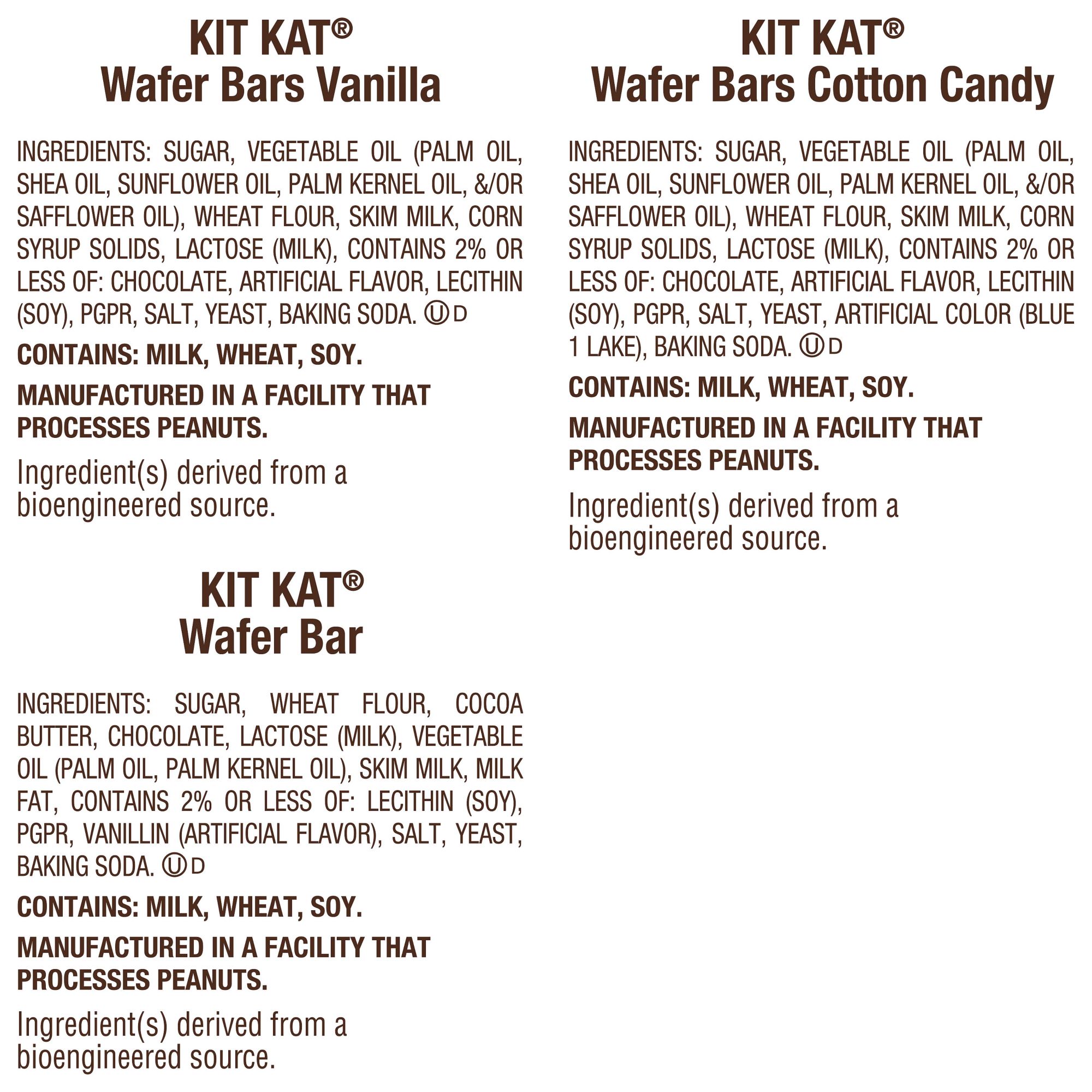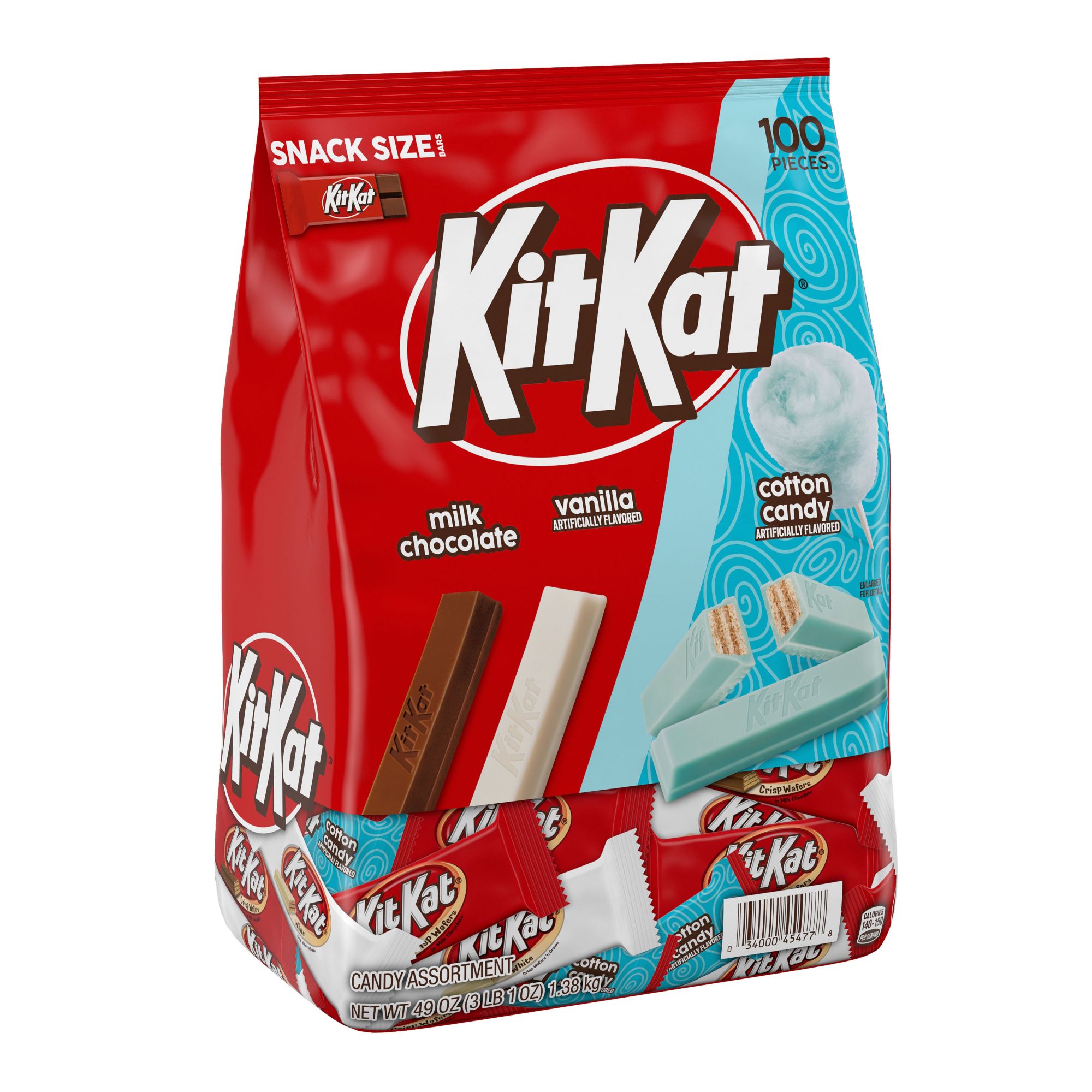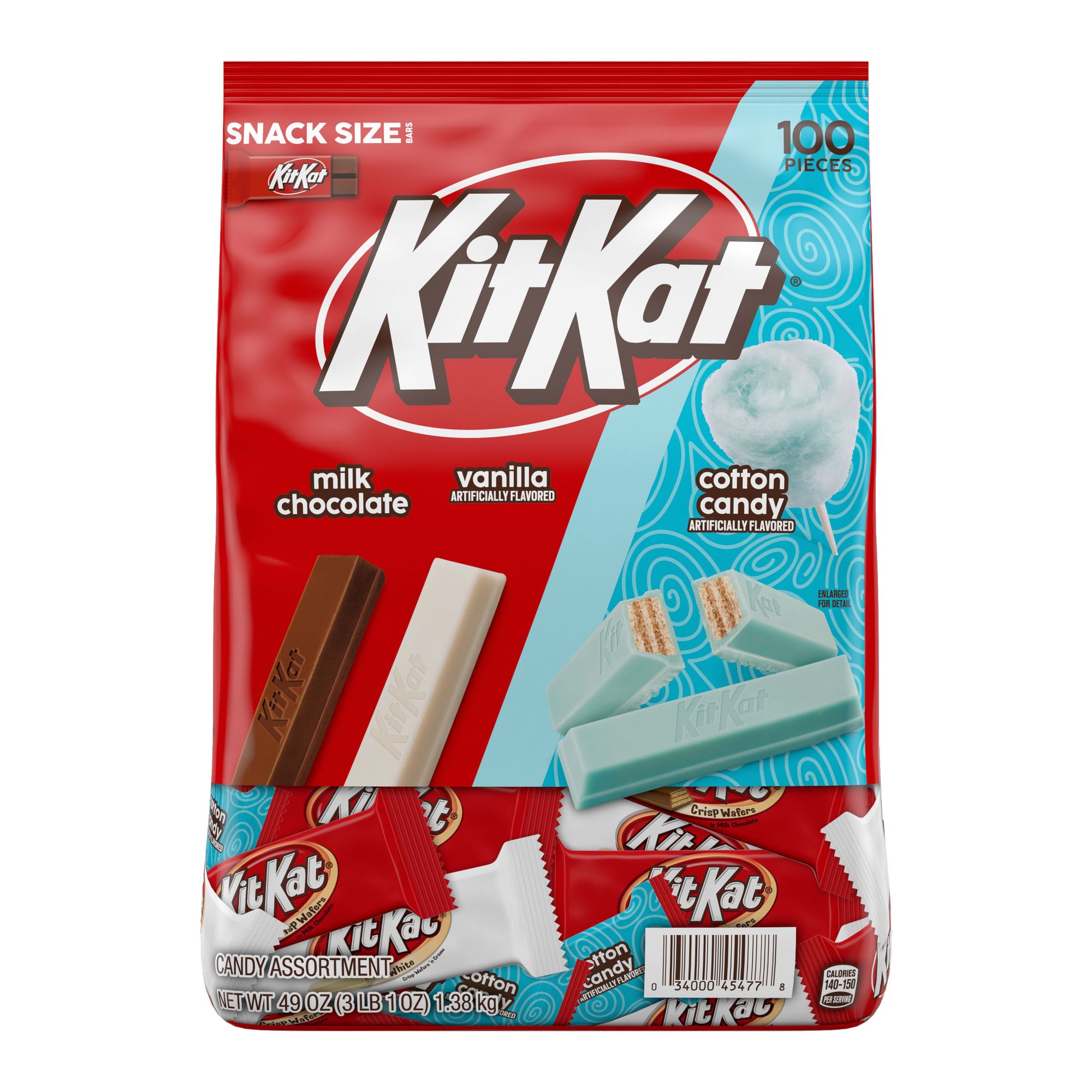 Contains one (1) 49-ounce, 100-piece bulk bag of Kit Kat Assorted Milk Chocolate, Vanilla and Cotton Candy Flavored Wafer Snack Size Candy Bars