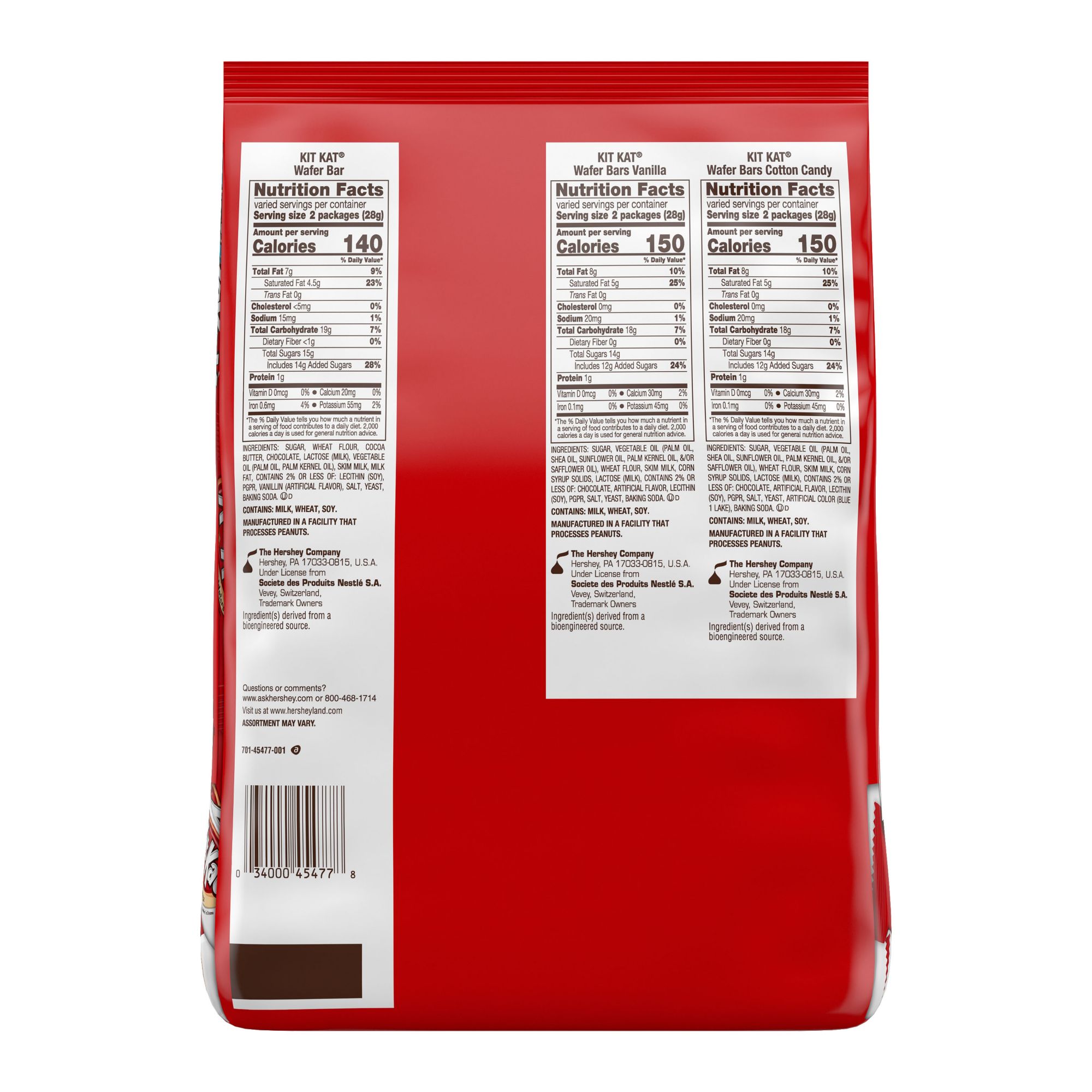 Ready for a classic everyone hopes to find in the candy dish? These assorted snack size Kit Kat candy bars are individually wrapped for optimal convenience, easy sharing and lasting freshness. Whether you gift them to friends, pass them out in the office or hold onto them for snacking moments, you can expect a delicious treat in the perfect on-the-go size. This assortment bag includes Kit Kat milk chocolate wafer bars, Kit Kat vanilla wafer bars and Kit Kat cotton candy flavored wafer bars. Throw a few in your lunch box to treat yourself to a sweet dessert, or stock your home and office candy bowls with an easy snacking classic. Preparing for a specific occasion? Whether you need to put Easter baskets together, stuff holiday stockings, fill Valentine's Day party favors or treat Halloween trick-or-treaters, Kit Kat candy is the way to go. Getting ready for your next movie night? Add a mix of crispy wafers for an extra special touch that satisfies the whole crowd. You can snack on these assorted flavored bars straight from the wrapper, chill them in the fridge for a cold treat or top your best baked goods with them to show off your culinary genius.