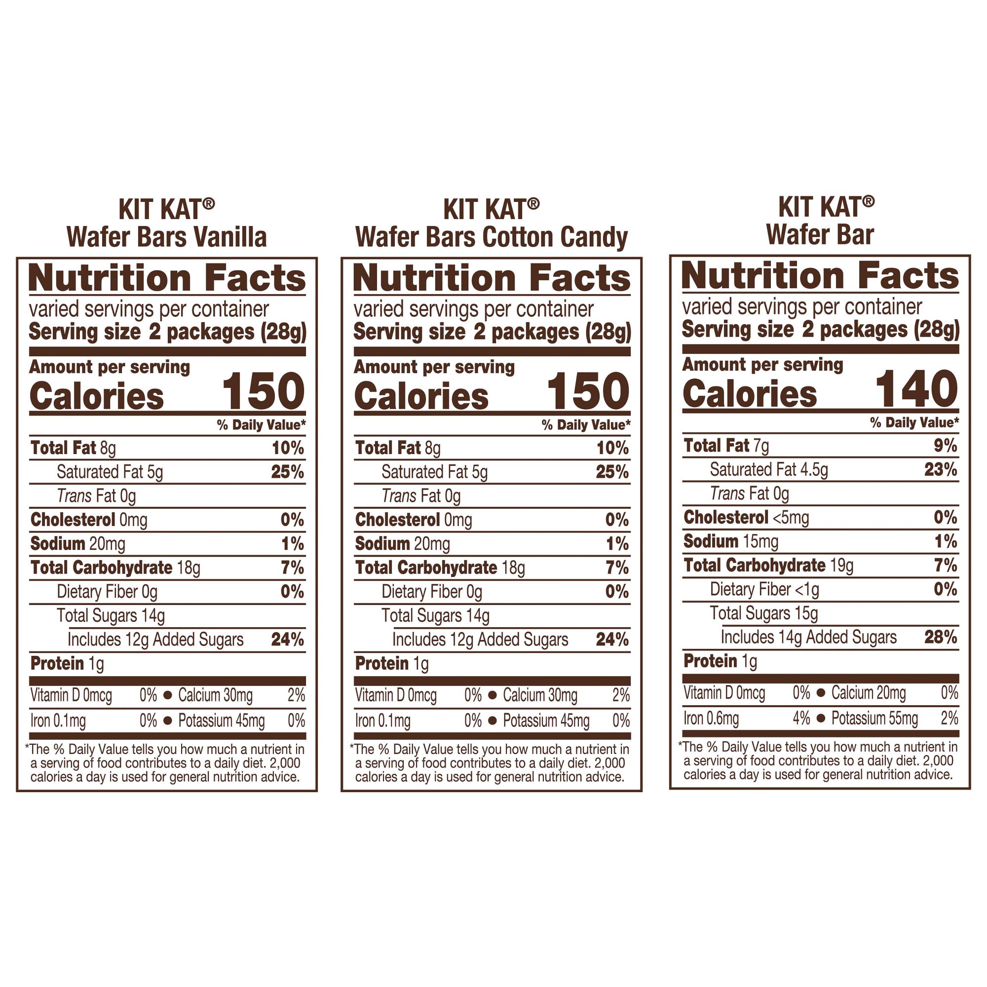 Fill snack drawers, lunch boxes and candy dishes all year long with milk chocolate, vanilla and cotton candy flavored wafer Kit Kat candy bars
