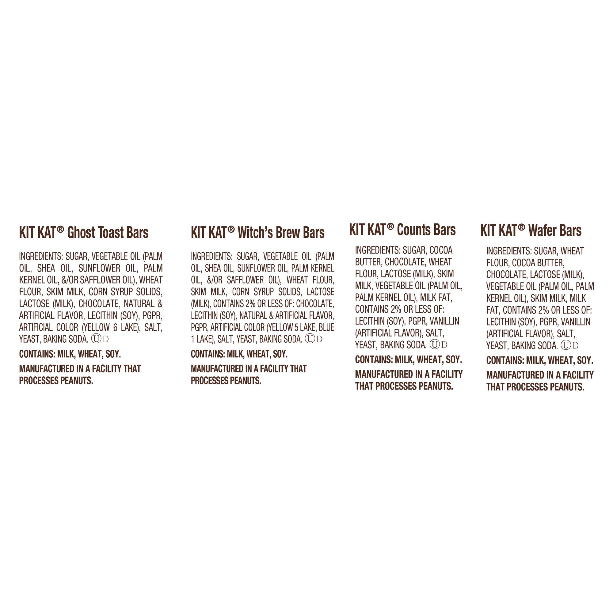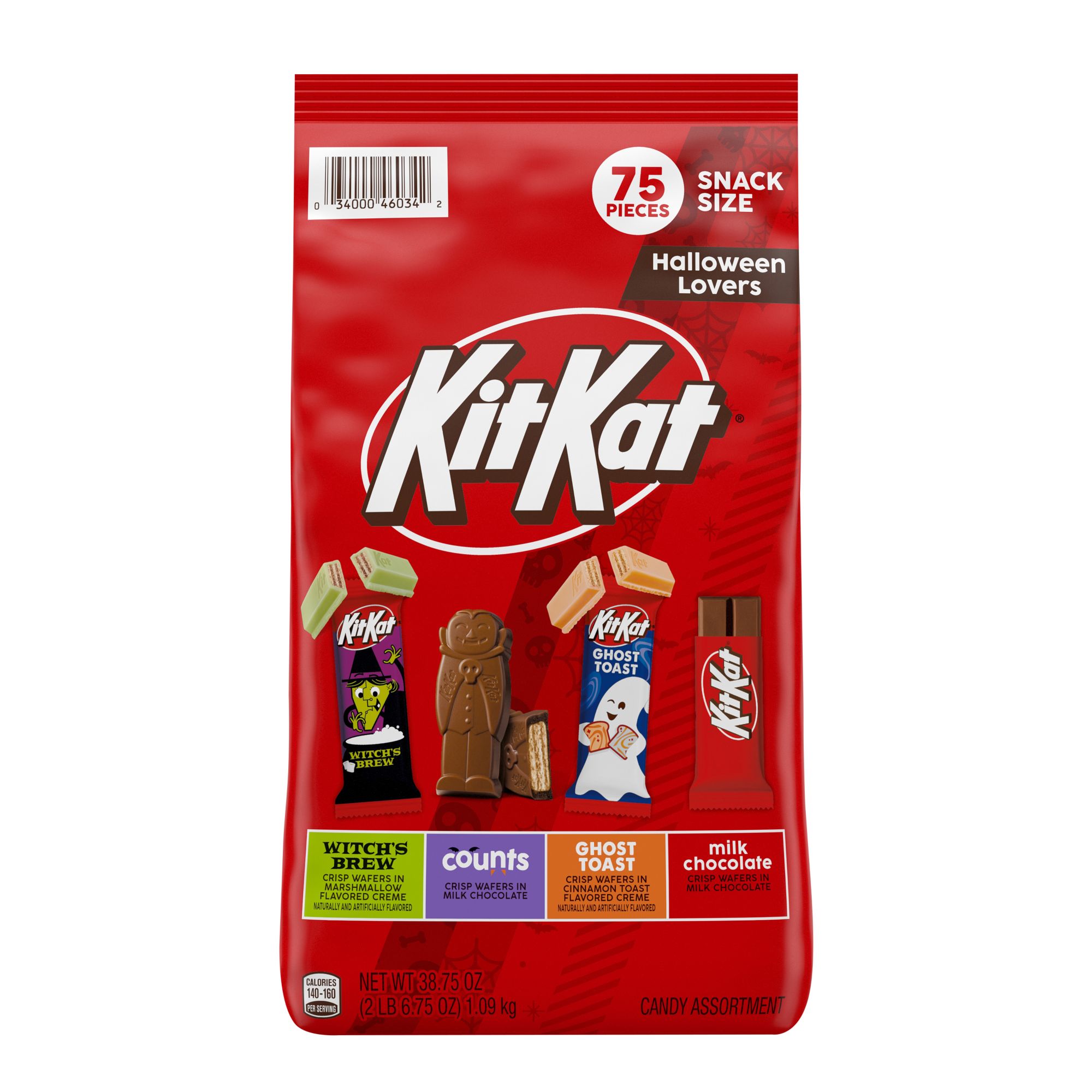 Includes snack size Kit Kat Witch’s Brew marshmallow flavored creme wafer candy bars, Kit Kat milk chocolate wafer counts candy, Kit Kat Ghost Toast cinnamon toast flavored creme wafer candy bars and Kit Kat milk chocolate wafer candy bars, 75 ct.