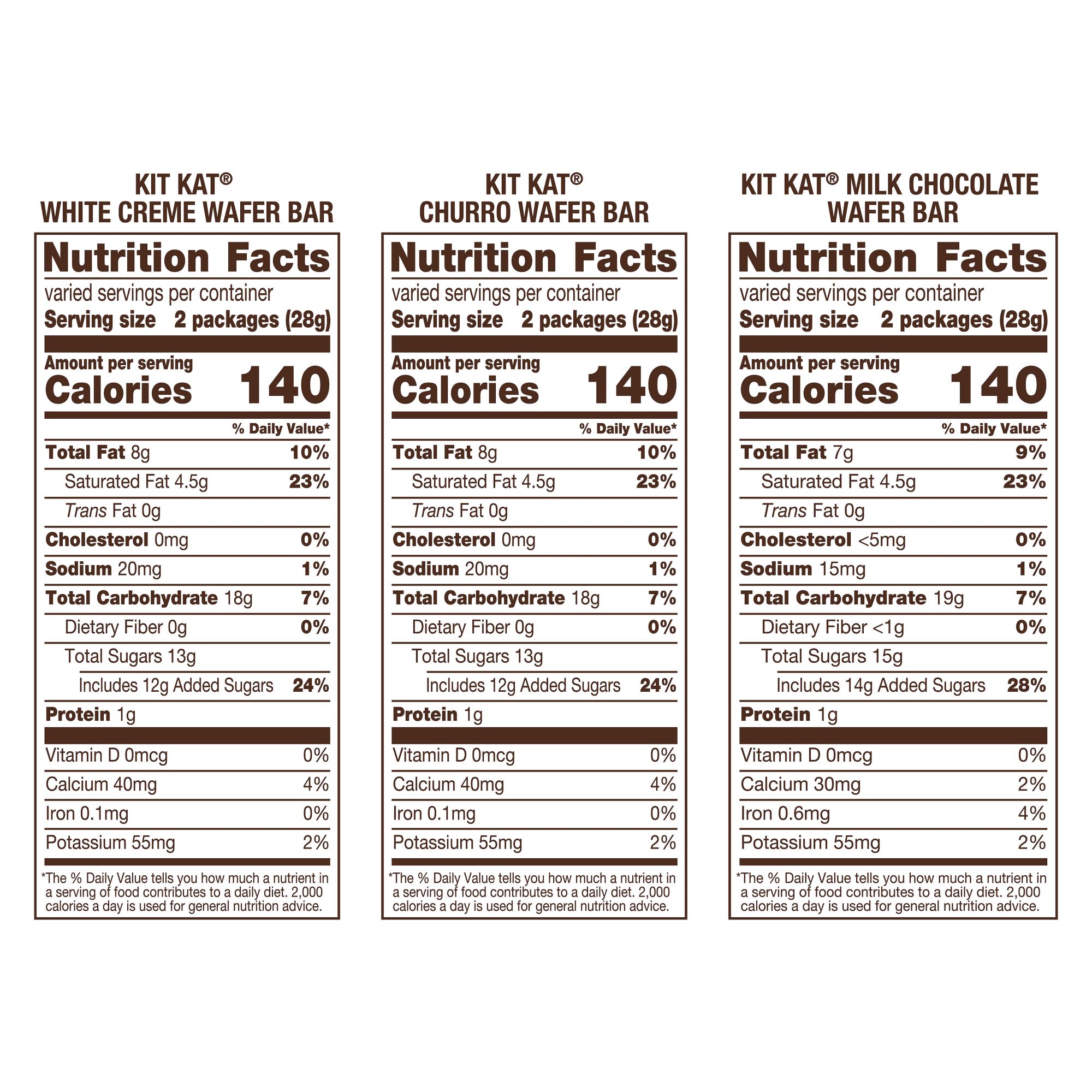 Ingredients: Kit Kat White Crème Wafer Bar: Sugar, Vegetable Oil (Palm Oil, Shea Oil, Sunflower Oil, Palm Kernel Oil, &/Or Safflower Oil), Wheat Flour, Skim Milk, Corn Syrup Solids, Lactose (Milk), Contains 2% or Less of: Chocolate, Lecithin (Soy), PGPR, Salt, Yeast, Vanillin (Artificial Flavor), Baking Soda. Contains: Milk, Wheat, Soy. Manufactured In A Facility That Processes Peanuts. Ingredient(s) derived from a bioengineered source. Kit Kat Churro Wafer Bar: Sugar, Vegetable Oil (Palm Oil, Shea Oil, Sunflower Oil, Palm Kernel Oil, &/Or Safflower Oil), Wheat Flour, Skim Milk, Corn Syrup Solids, Lactose (Milk), Contains 2% or Less of: Chocolate, Lecithin (Soy), Natural & Artificial Flavor, Artificial Color (Yellow 5 Lake, Blue 2 Lake, Red 40 Lake), PGPR, Salt, Yeast, Baking Soda. Contains: Milk, Wheat, Soy. Manufactured In A Facility That Processes Peanuts. Ingredient(s) derived from a bioengineered source. Kit Kat Milk Chocolate Wafer Bar: Sugar, Wheat Flour, Cocoa Butter, Chocolate, Lactose (Milk), Vegetable Oil (Palm Oil, Palm Kernel Oil), Skim Milk, Milk Fat, Contains 2% or Less of: Lecithin (Soy), PGPR, Vanillin (Artificial Flavor), Salt, Yeast, Baking Soda. Contains: Milk, Wheat, Soy. Manufactured In A Facility That Processes Peanuts. Ingredient(s) derived from a bioengineered source.