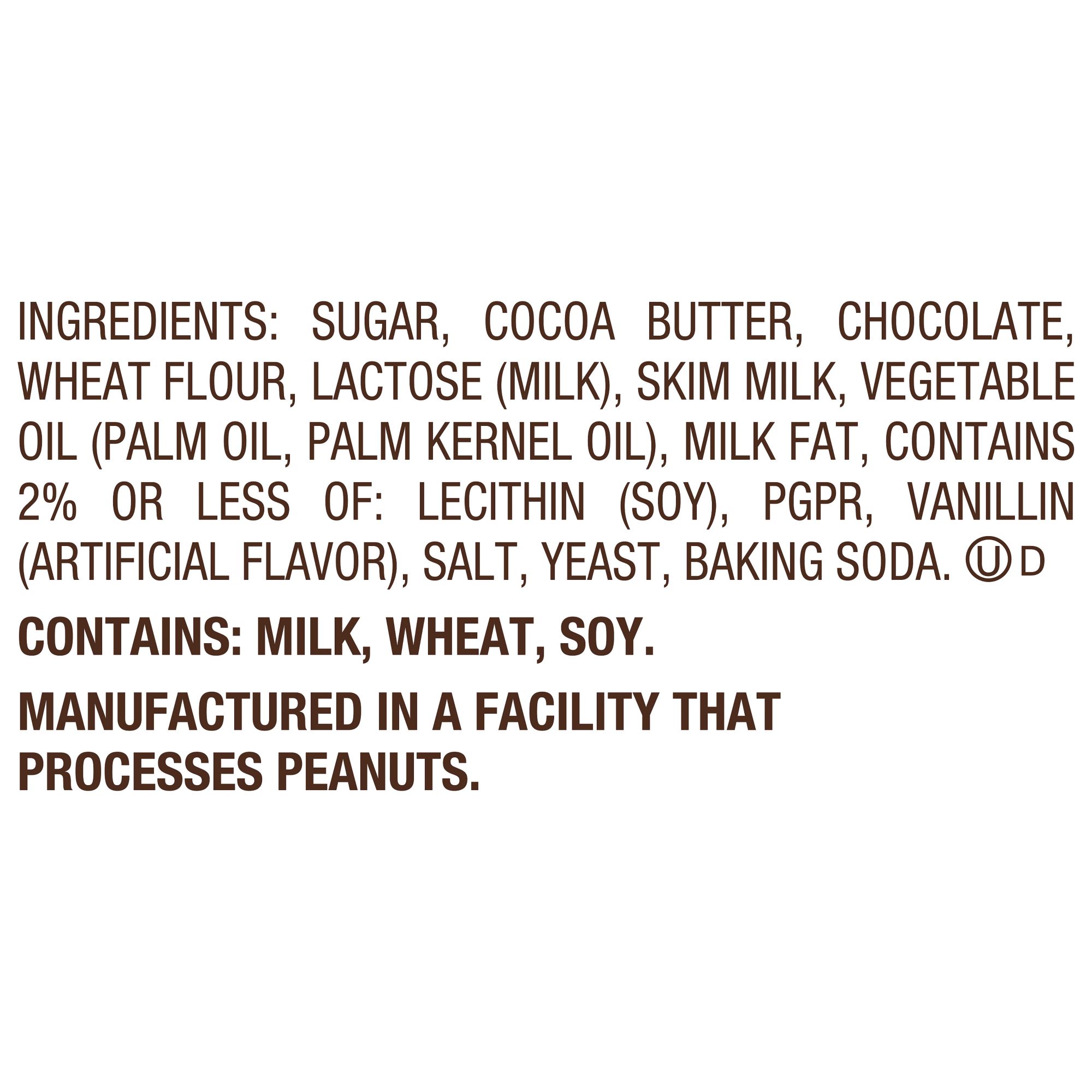 Ingredients: Sugar, Cocoa Butter, Chocolate, Wheat Flour, Lactose (Milk), Skim Milk, Vegetable Oil (Palm Oil, Palm Kernel Oil), Milk Fat, Contains 2% Or Less Of: Lecithin (Soy), Pgpr, Vanillin (Artificial Flavor), Salt, Yeast, Baking Soda.