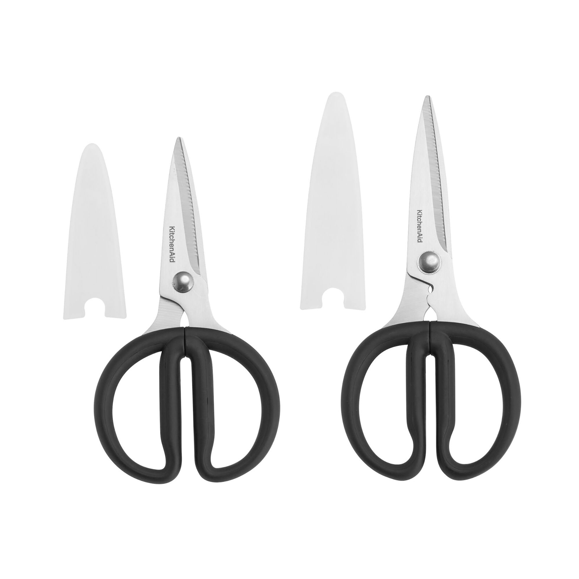 This set of two shears from KitchenAid includes All-Purpose Shears and Utility Shears. The blade edges feature micro serrations to provide a superior cutting experience. Durable and strong, these shears are made from heavy-duty stainless steel that withstands daily use, with soft-grip handles that provide comfort and control while using. The shears each come with a protective blade guard for safe storage.