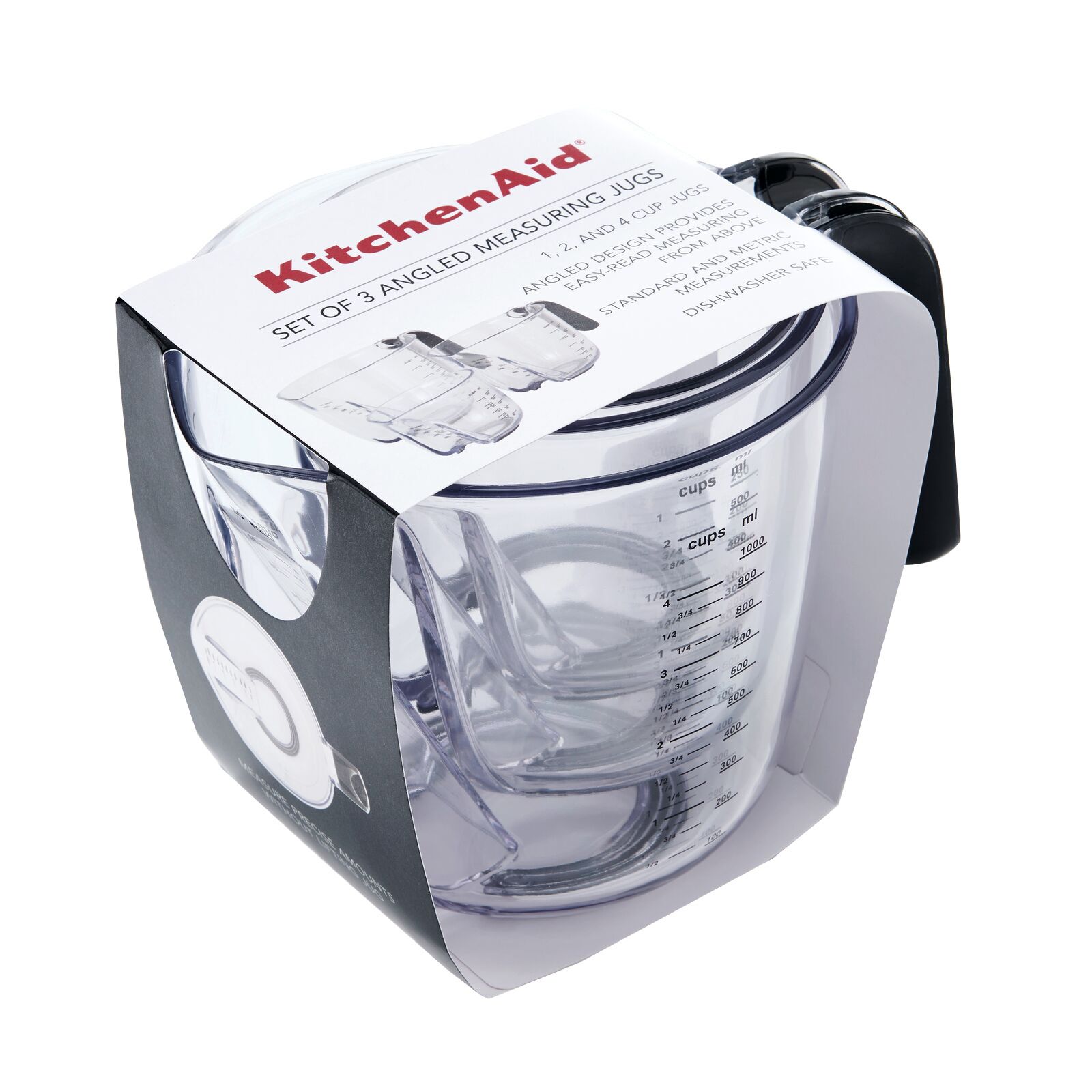 Measure both wet and dry ingredients with this KitchenAid set of three angled measuring jugs. This essential tool features an integrated spout for smooth pouring and a nonslip handle for optimal comfort and control. The angled design allows you to easily view measurements--no lifting required. The set includes three sizes: One-cup, two-cup and four-cup measuring jugs.