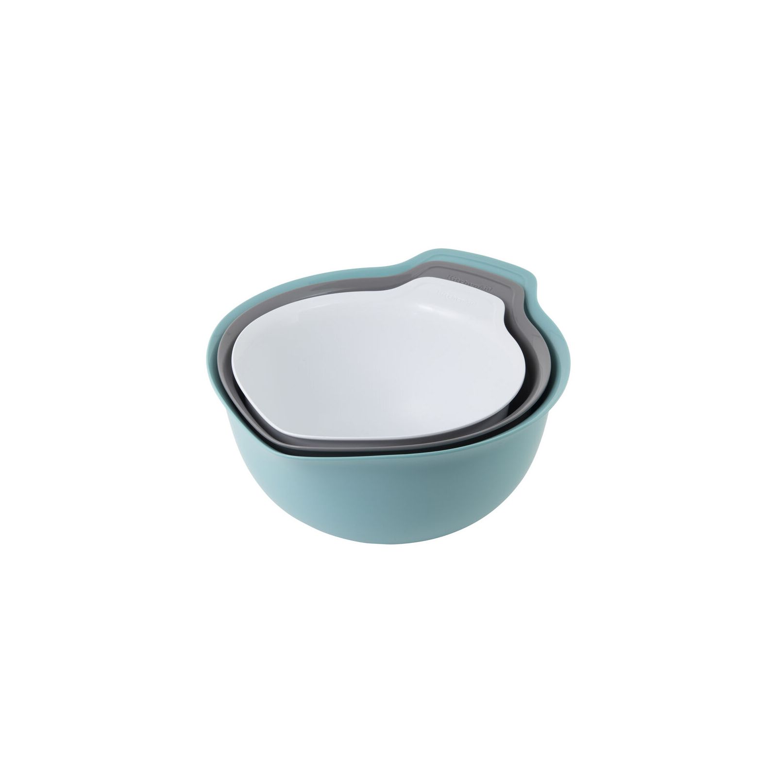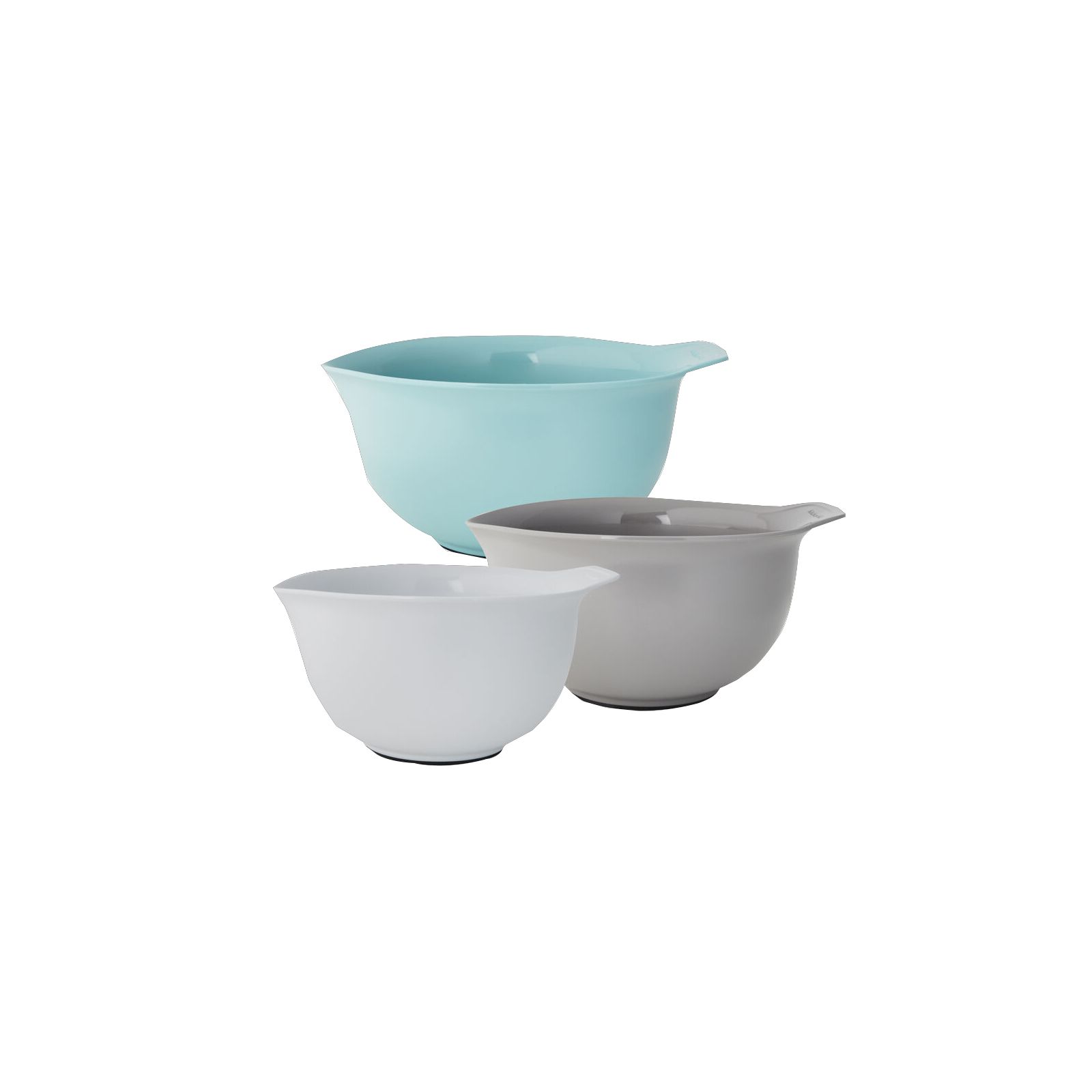 These KitchenAid Mixing Bowls are a kitchen essential. Never worry about the bowls slipping while mixing. They each feature a nonslip base that increases stability while mixing. Each bowl has a pour spout, which helps to reduce the chance of spills when transferring mixes. This set includes 3 sizes: 2.5 qt., 3.5 qt., and 4.5 qt. The bowls nest together when not in use for easy storage. These mixing bowls are dishwasher-safe for fast and easy clean-up. They come with a 1-year hassle-free replacement and Lifetime limited warranty.