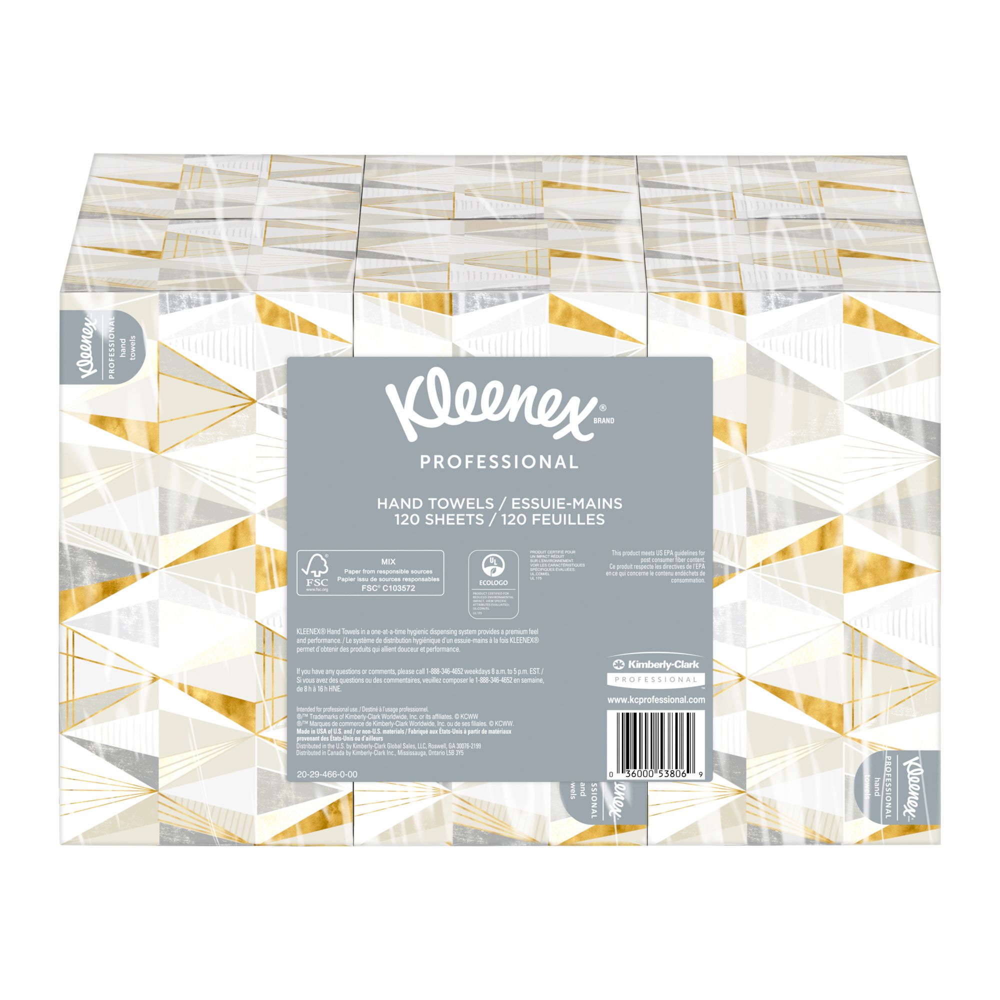 6 boxes of Kleenex Hand Towels per case, 120 hand paper towels per high-capacity box Each soft, absorbent countertop paper towel measures 9.0” x 10.25” These premium folded paper towels feature Absorbency Pockets, which soak up water The convenient Pop-Up box offers hygienic and sanitary one-at-a-time dispensing – so your guests only touch the towel they use Meets EPA minimum standards for post-consumer waste and is ECO Logo and FSC certified