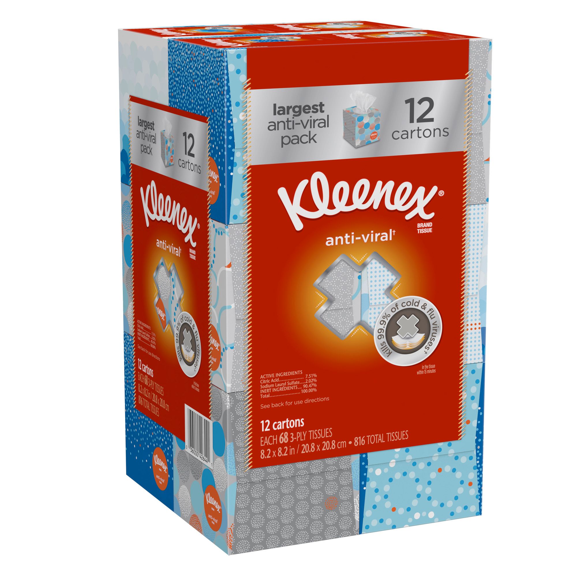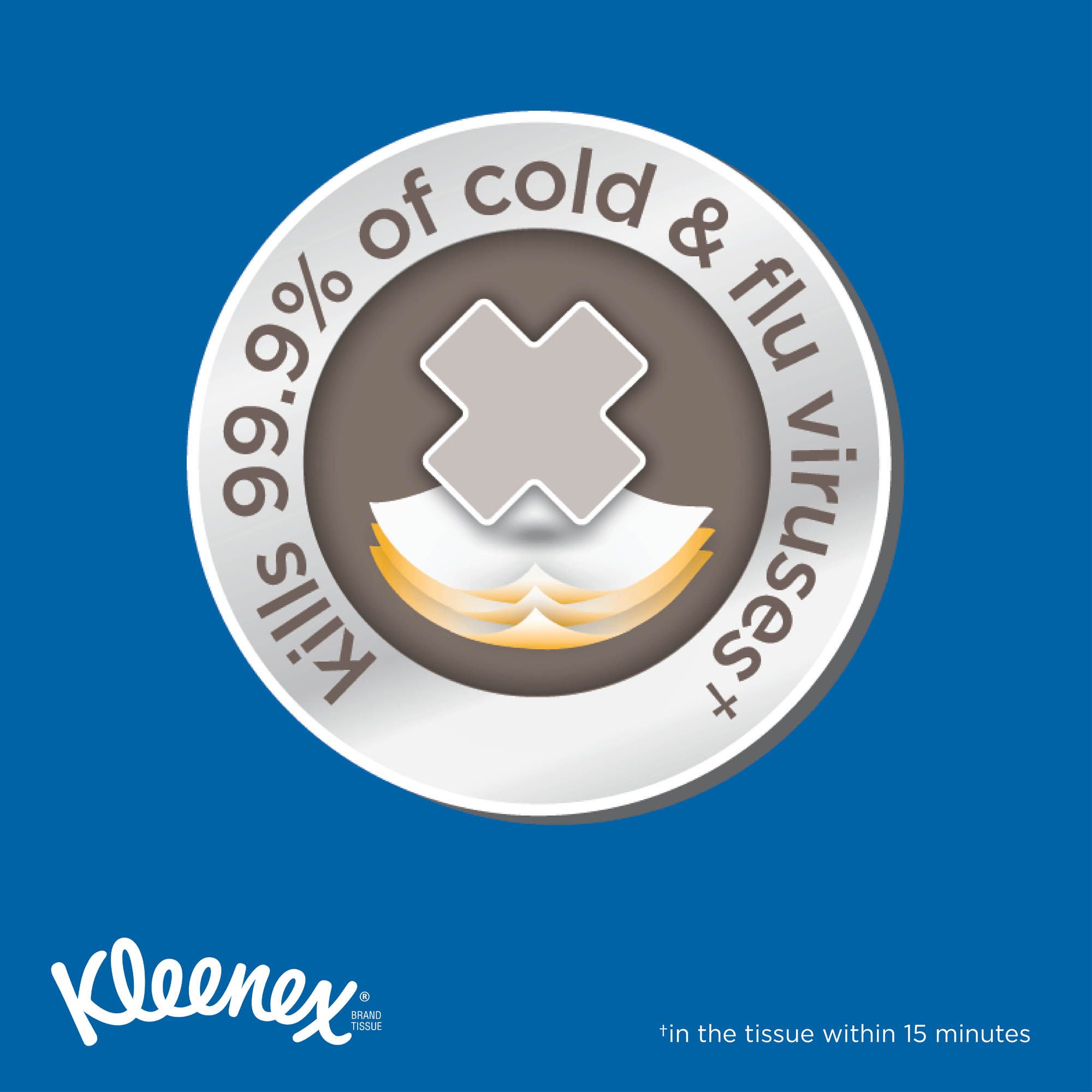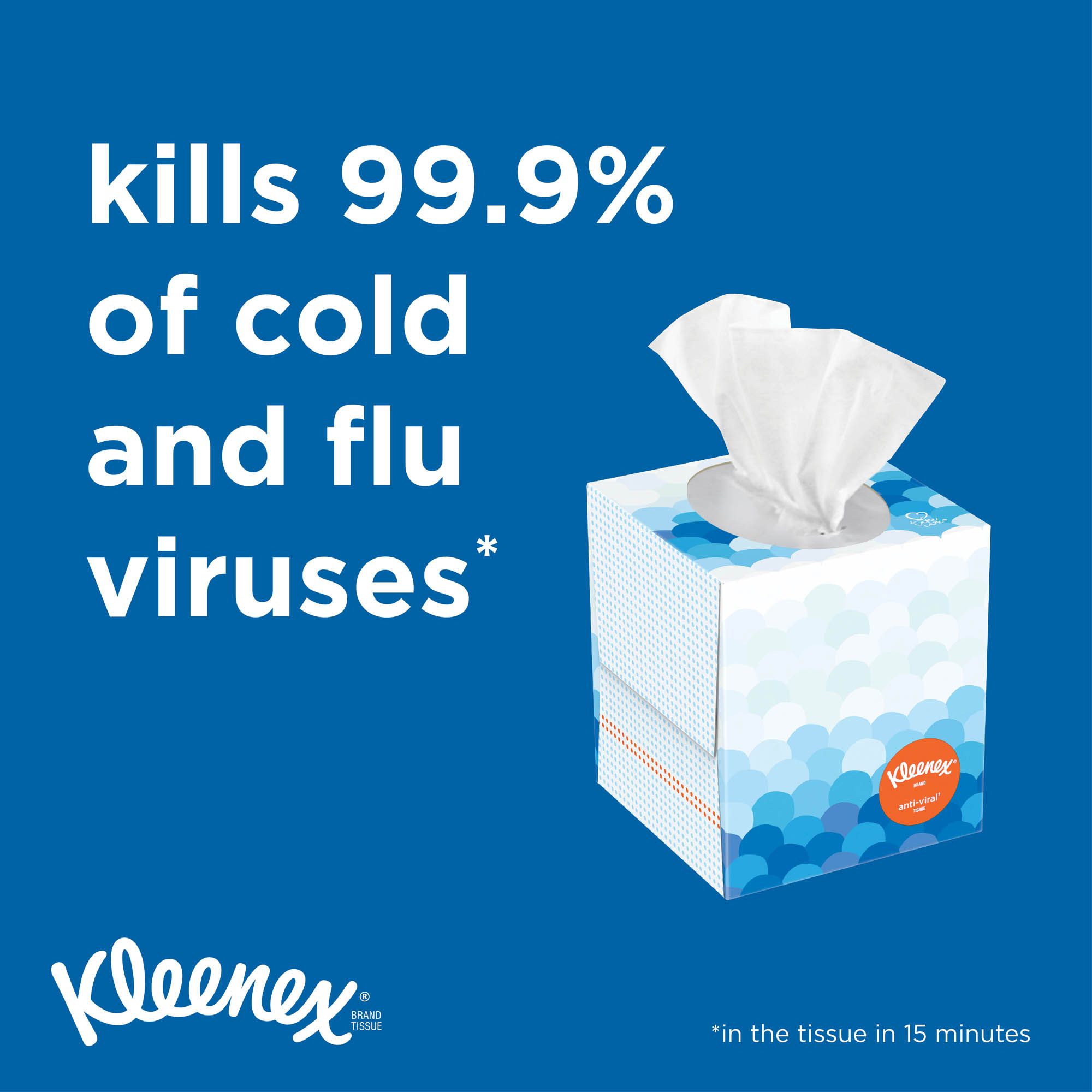 Kleenex Three-Ply Anti-Viral Tissues with a moisture-activated blue-dot layer and a special anti-viral formula kill 99.9% of cold and flu viruses within 15 minutes. With a three-ply thickness, these soft and absorbent tissues easily lock moisture. Keep these on hand to care for your family, friends and yourself during cold and flu season.