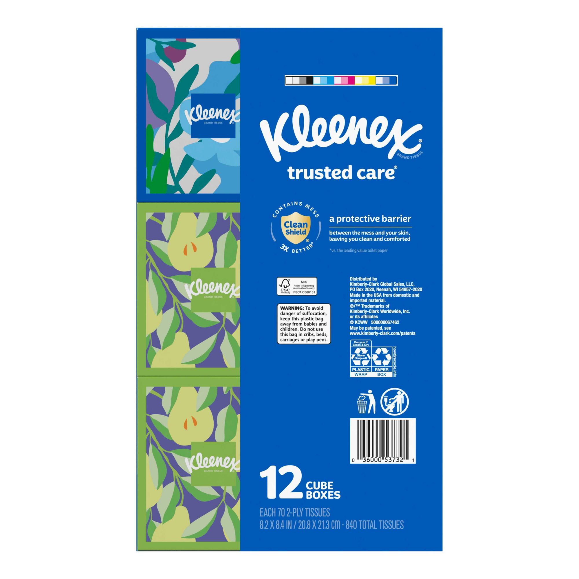 What’s included - 12 cube boxes of Kleenex Trusted Care Facial Tissues, 2-ply, 70 tissues per box (840 tissues total)