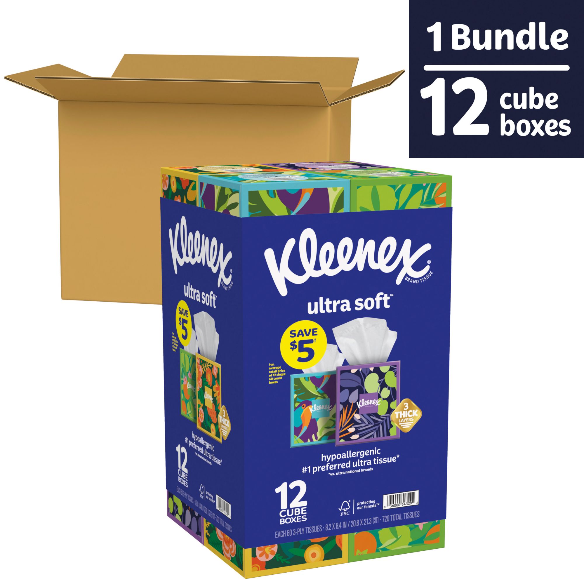 Includes 12 boxes of Kleenex ultra soft facial tissues, 60 tissues per box (720 total tissues)