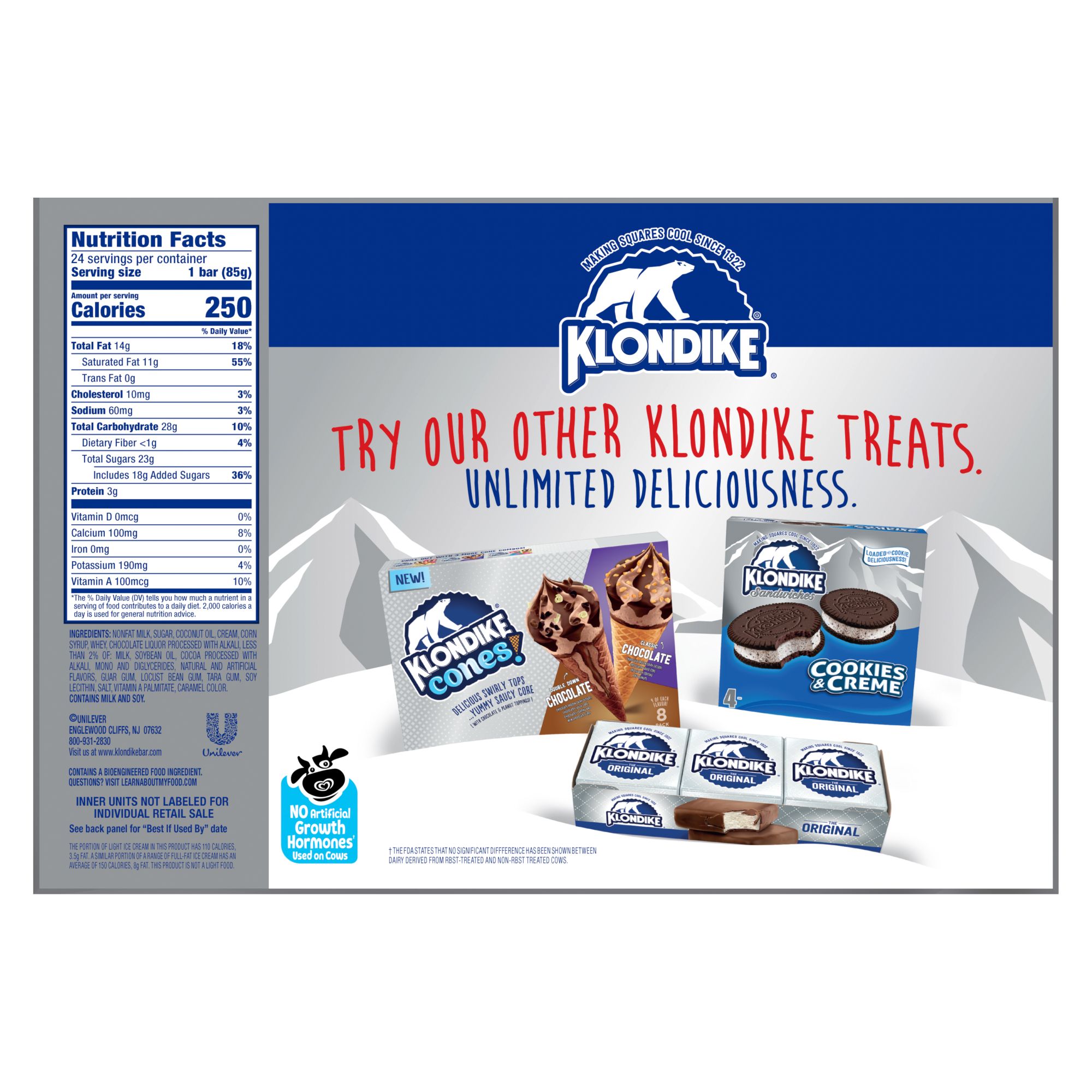 The Klondike Original Ice Cream Bar is a hunk of creamy artificially flavored vanilla light ice cream covered in a thick milk chocolate flavored coating. It is the bar that raised the bar. The best thing to happen to ice cream since, um, the invention of ice cream. For those who prefer simple and classic perfection, this is the ice cream bar for you. You know it’s a Klondike ice cream bar when you hear the “crack†as you bite into its chocolatey shell, which holds in all of that delicious, ice-creamy goodness. This piece of stickless, bowl-and-spoonless perfection lets you enjoy the wonderful wonders of ice cream anytime, anywhere. Take the time to treat yourself. We know that life isn’t always as easy as it should be, so reward yourself for doing that thing you just did. Klondike supports you! Have the Klondike Original Ice Cream Bar as a snack. Have it as a treat. Have it to relax. Just have it…and give your mouth some sweet satisfaction.