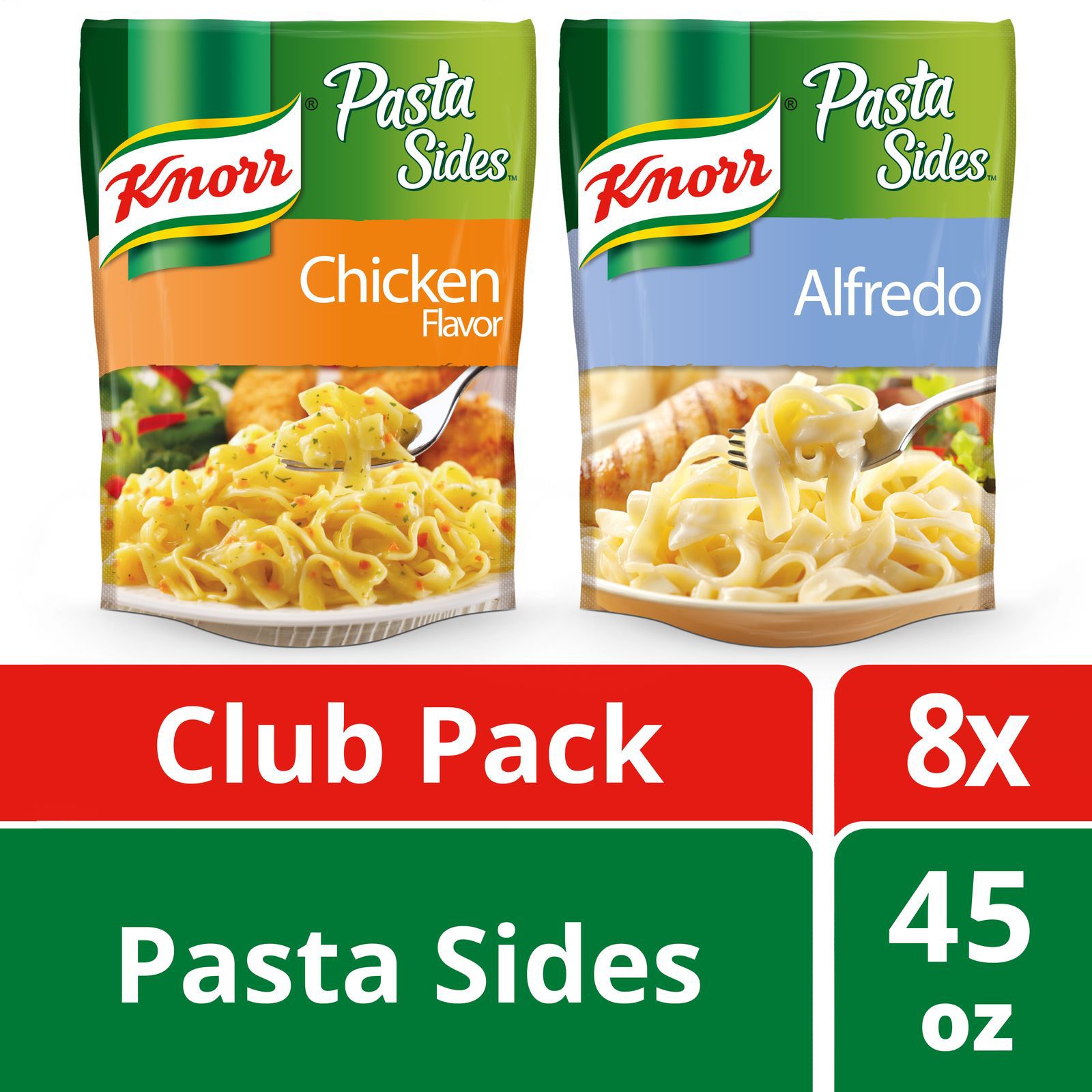 Our deliciously seasoned pasta sides are great as part of a delicious main dish or as a standalone side dish. On top of tasting delicious, our pasta dishes are quick and easy to prepare. Knorr Alfredo and Chicken Pasta Sides 8 ct include our top Knorr Pasta Sides flavors. Knorr Alfredo Pasta Sides combines a traditional favorite with fettuccini pasta tossed in a creamy Parmesan and Romano cheese sauce. Knorr Chicken Pasta Sides expertly combines red bell peppers, onion, garlic and parsley with a savory chicken-flavored sauce.