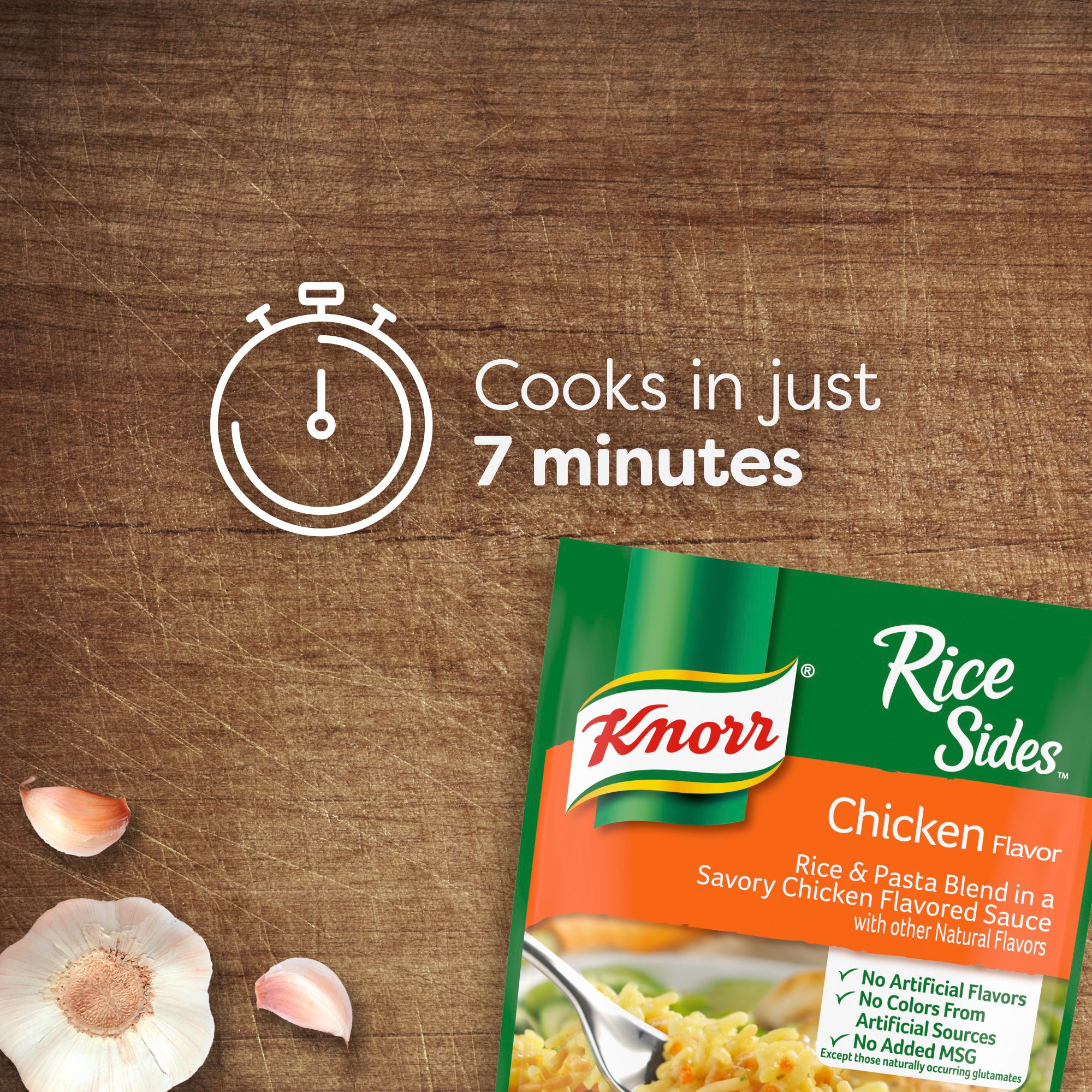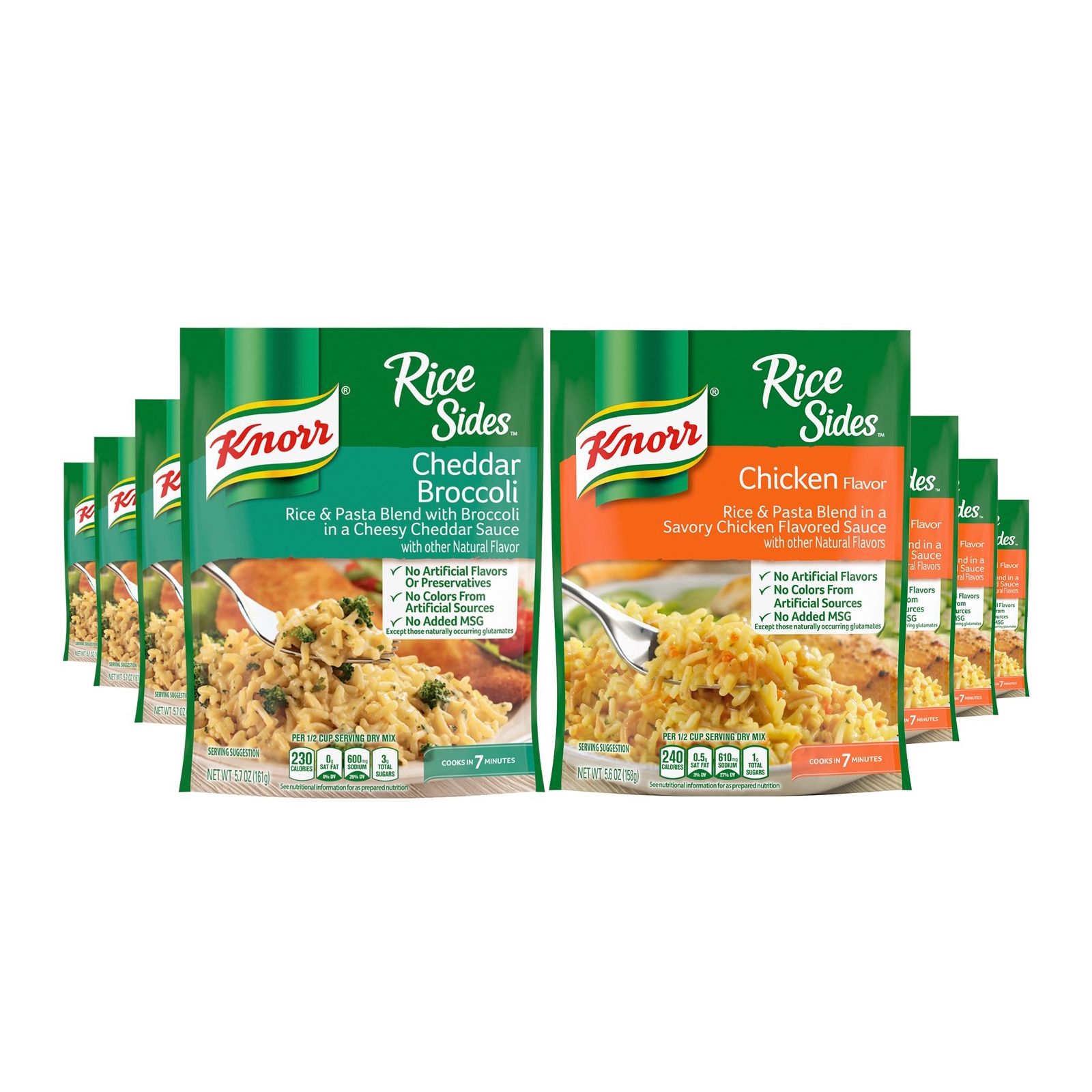 Quick and easy to prepare - Cooks in 7 minutes Stovetop or microwave cooking Quick 7 minute cook time for convenient meals No artificial flavors Includes four Knorr Cheddar Broccoli Rice Sides, and 4 Knorr Chicken Rice Sides, 5.6 oz. each