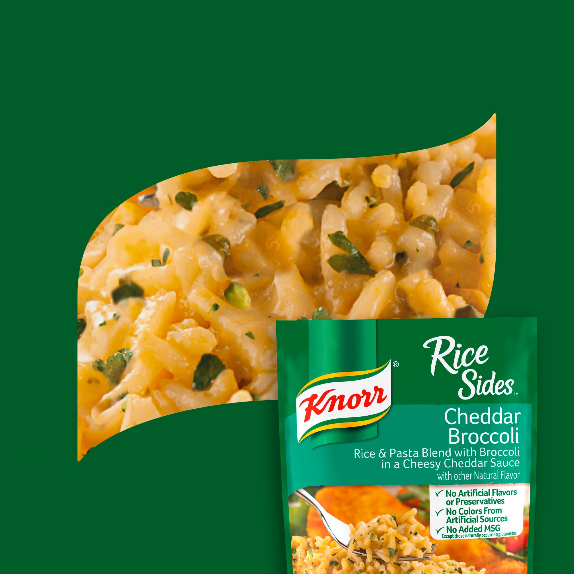 Our deliciously seasoned rice side dishes are great as part of a delicious main dish or as a standalone side dish. On top of tasting delicious, our rice dishes are quick and easy to prepare. Knorr Cheddar Broccoli and Chicken Rice Sides 8 ct. include our top Knorr Rice Sides flavors. Knorr Cheddar Broccoli Rice Sides is a rice & pasta blend, that expertly combines broccoli florets with the creamy goodness of cheddar cheese sauce. Knorr Chicken Rice Sides is a rice & pasta blend, that expertly combines onions, carrots, garlic and parsley beautifully with the mouth-watering, chicken-flavored sauce.