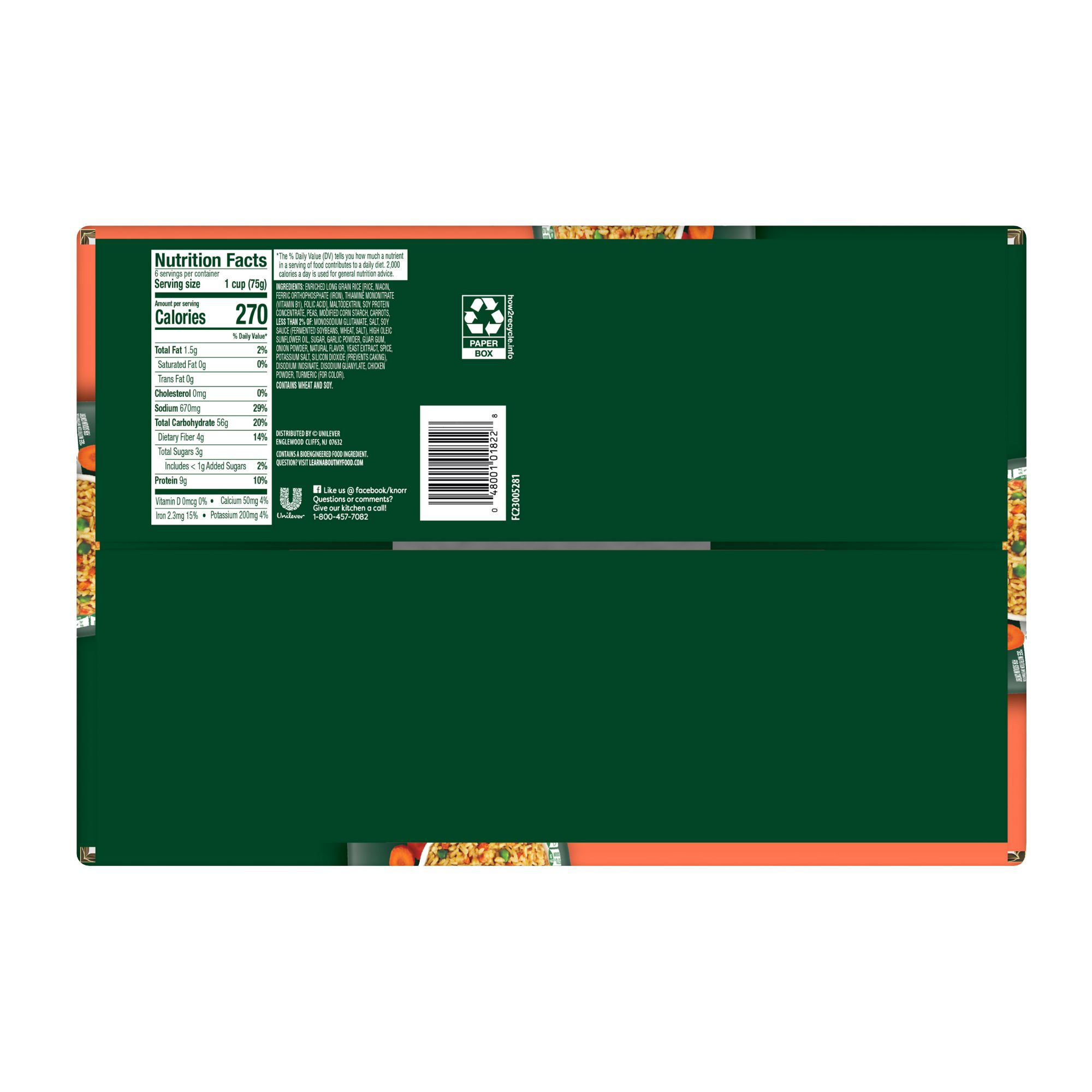 Ingredients: Enriched Long Grain Rice [Rice, Niacin, Ferric Orthophosphate (Iron), Thiamine Mononitrate (Vitamin B1), Folic Acid], Modified Corn Starch, Maltodextrin, Peas, Carrots, Monosodium Glutamate, Soy Sauce (Fermented Soybeans, Wheat, Salt), Salt, Sugar, High Oleic Sunflower Oil, Garlic Powder, Spice, Guar Gum, Onion Powder, Yeast Extract, Natural Flavor, Potassium Salt, Disodium Inosinate, Disodium Guanylate, Chicken Powder, Turmeric (For Color).