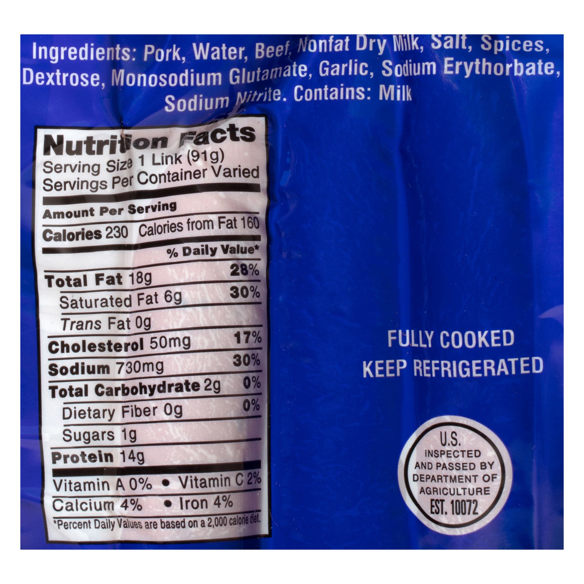 Ingredients: Pork, Water, Beef, Nonfat Dry Milk, Salt, Spics, Dextrose, Monosodium Glutamate, Garlic, Sodium Erythorbate and Sodium Nitrite. In a Hog Casing.