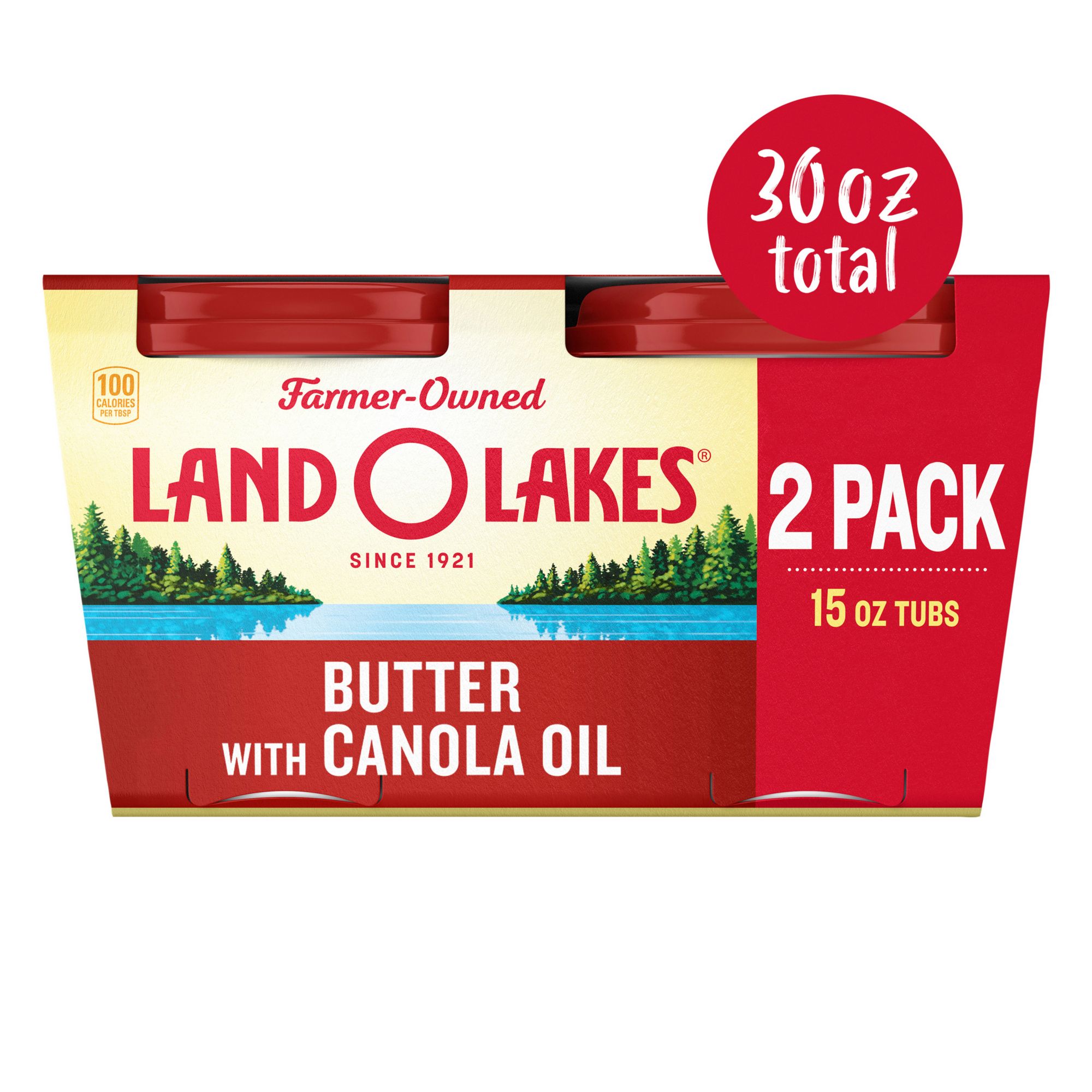 Land O'Lakes Butter with Canola Oil is made with quality ingredients and gives you the taste you love, spreadable right out of the fridge. It provides the butter taste you love with the spreadable convenience you want, straight from the refrigerator and features a resealable top to maintain flavor. Land O'Lakes Butter with Canola Oil is made with sweet cream, canola oil and salt. No matter how you use it, it will take your cooking to a whole new level. Spread it onto warm, fluffy pancakes or spoon it into a hot skillet and give your steak a sizzling golden crust. Stir it into vegetables, or melt it over a bowl of mashed potatoes. You can enjoy it knowing you are supporting farmer-owners in communities like yours all across the country. Contains two 15 oz. tubs in total.