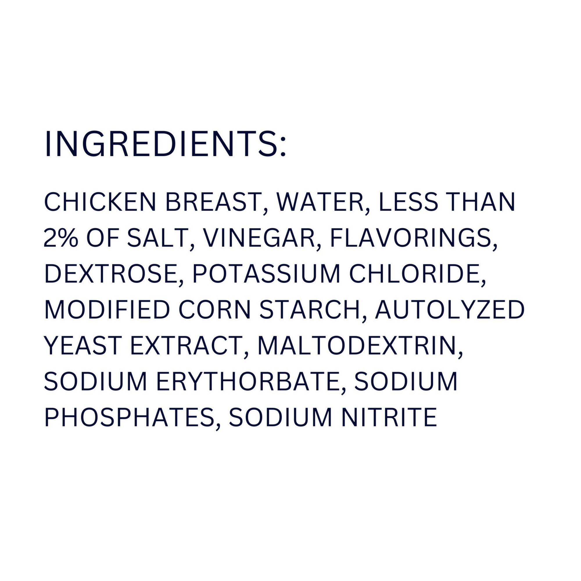 Ingredients: Chicken Breast, Water, Less than 2% of Salt, Vinegar, Flavorings, Dextrose, Potassium Chloride, Modified Corn Starch, Autolyzed Yeast Extract, Maltodextrin, Sodium Erythorbate, Sodium Phosphate, Sodium Nitrite.
