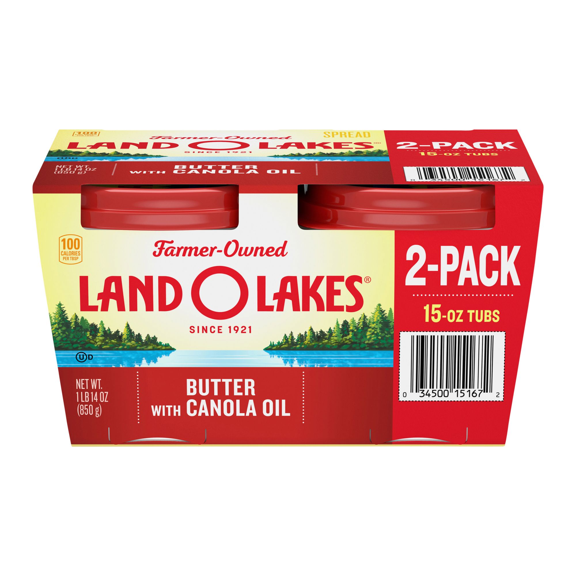 Land O Lakes Butter with Canola Oil is made with quality ingredients and gives you the taste you love, spreadable right out of the fridge. It provides the butter taste you love with the spreadable convenience you want, straight from the refrigerator and features a resealable top to maintain flavor. Land O Lakes Butter with Canola Oil is made with sweet cream, canola oil and salt. No matter how you use it, it will take your cooking to a whole new level. Spread it onto warm, fluffy pancakes or spoon it into a hot skillet and give your steak a sizzling golden crust. Stir it into vegetables, or melt it over a bowl of mashed potatoes. You can enjoy it knowing you are supporting farmer-owners in communities like yours all across the country. Contains two 15 oz. tubs in total.