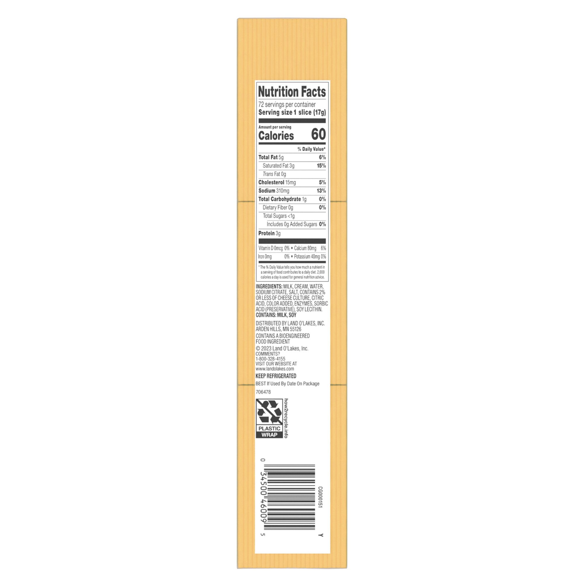 Land O'Lakes Yellow American Cheese, Sliced Cheese, 72 Slices, 2.75 lbs.