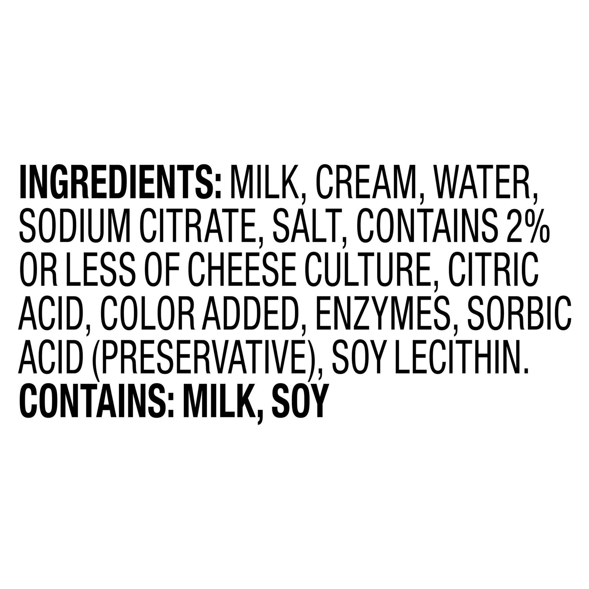 Ingredients: Milk, Cream, Water, Sodium Citrate, Salt, Contains 2% or Less of Cheese Culture, Citric Acid, Color Added, Enzymes, Sorbic Acid (Preservative), Soy Lecithin.