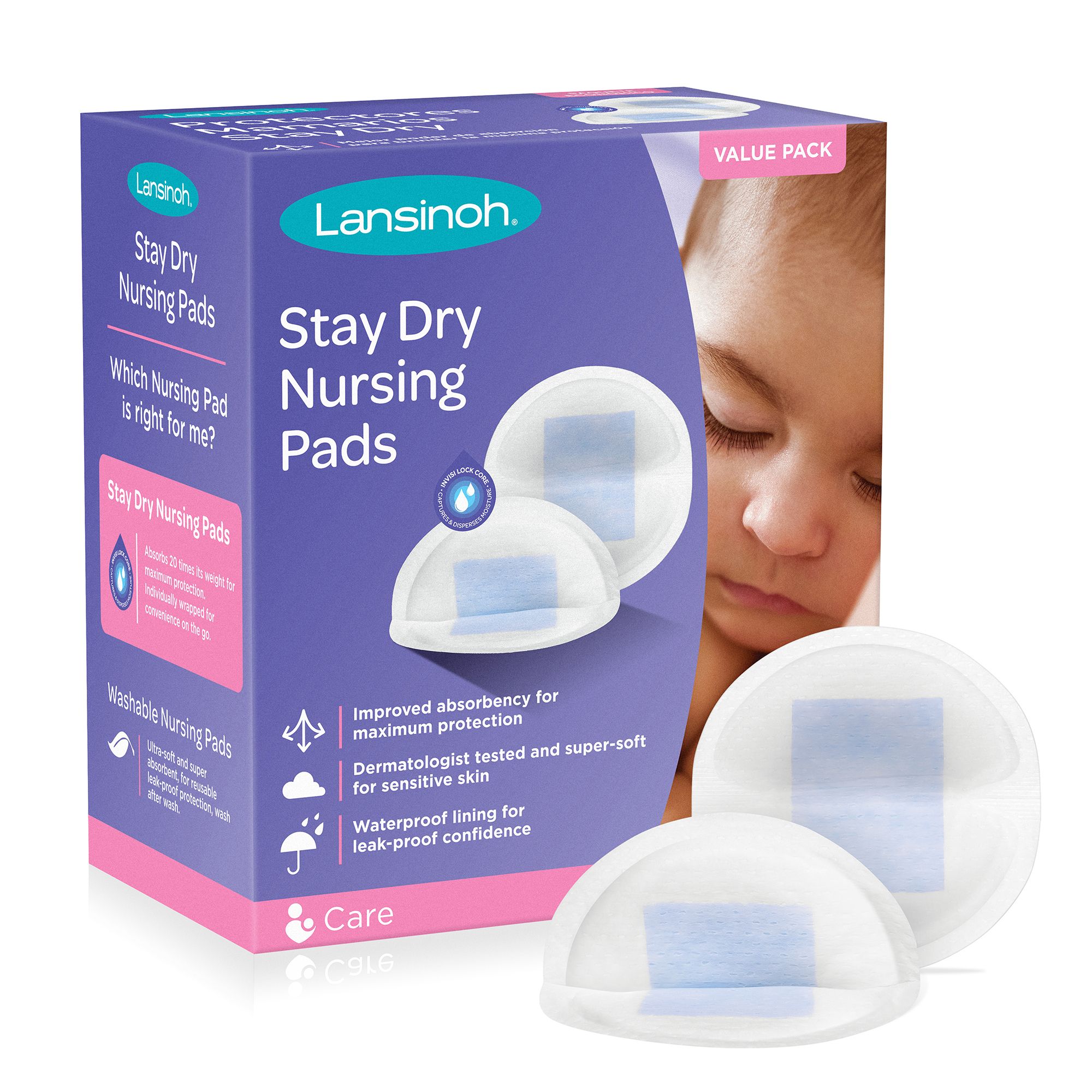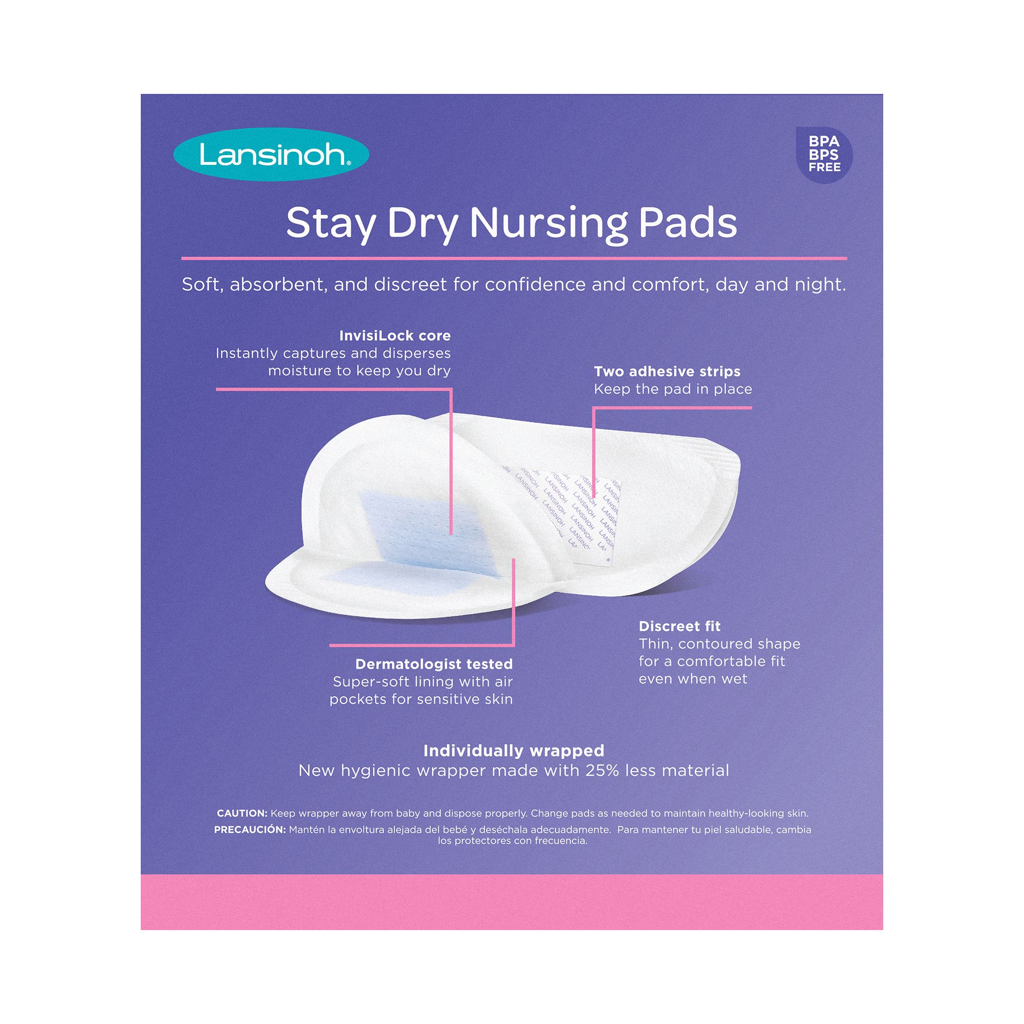 Improved absorbency for maximum protection Dermatologist tested and super-soft for sensitive skin Thin, contoured shape for a discreet fit Individually wrapped for convenience on the go New hygienic wrapper made with 25% less material BPA/BPS free Includes 200 pc. of Lansinoh Disposable Stay Dry Nursing Pads