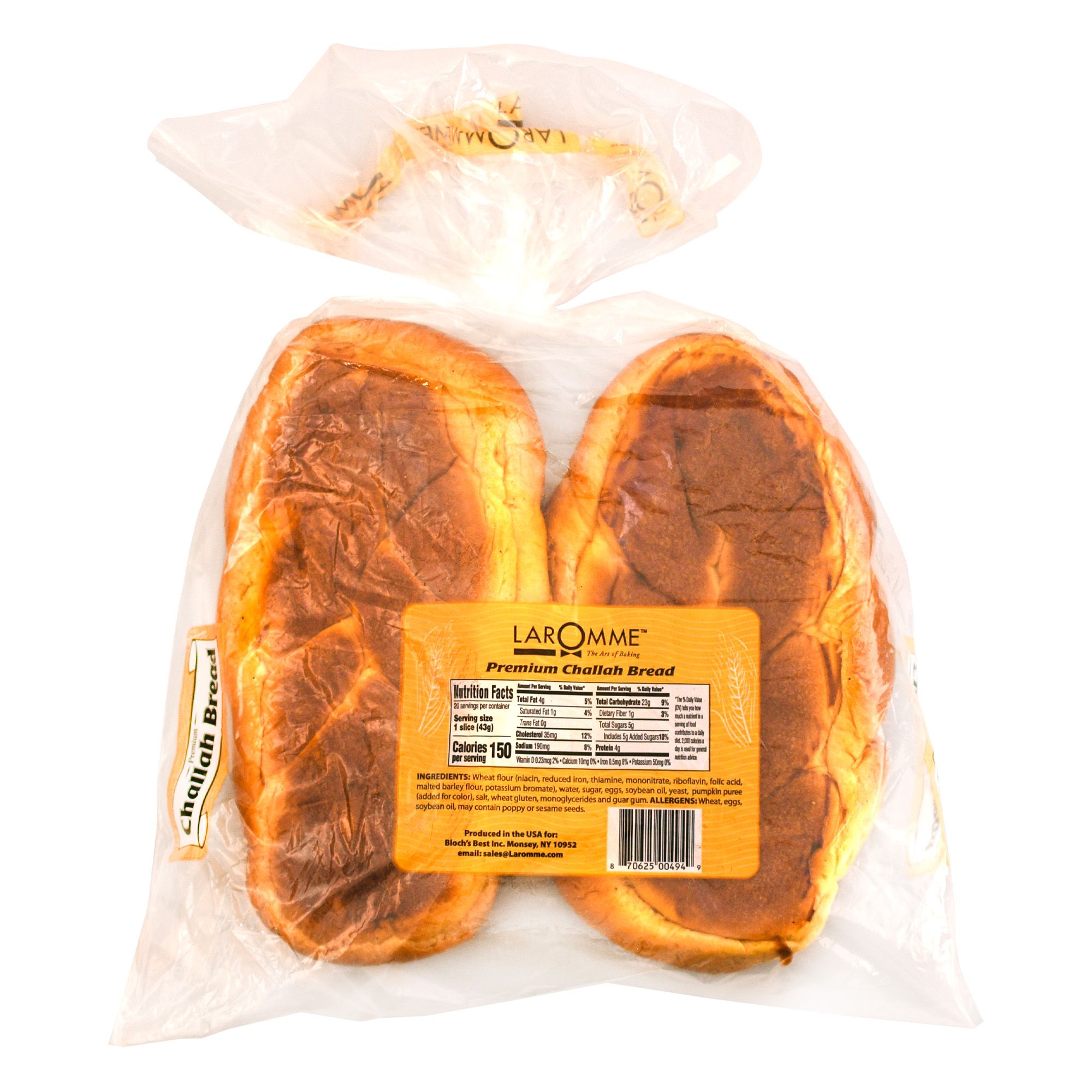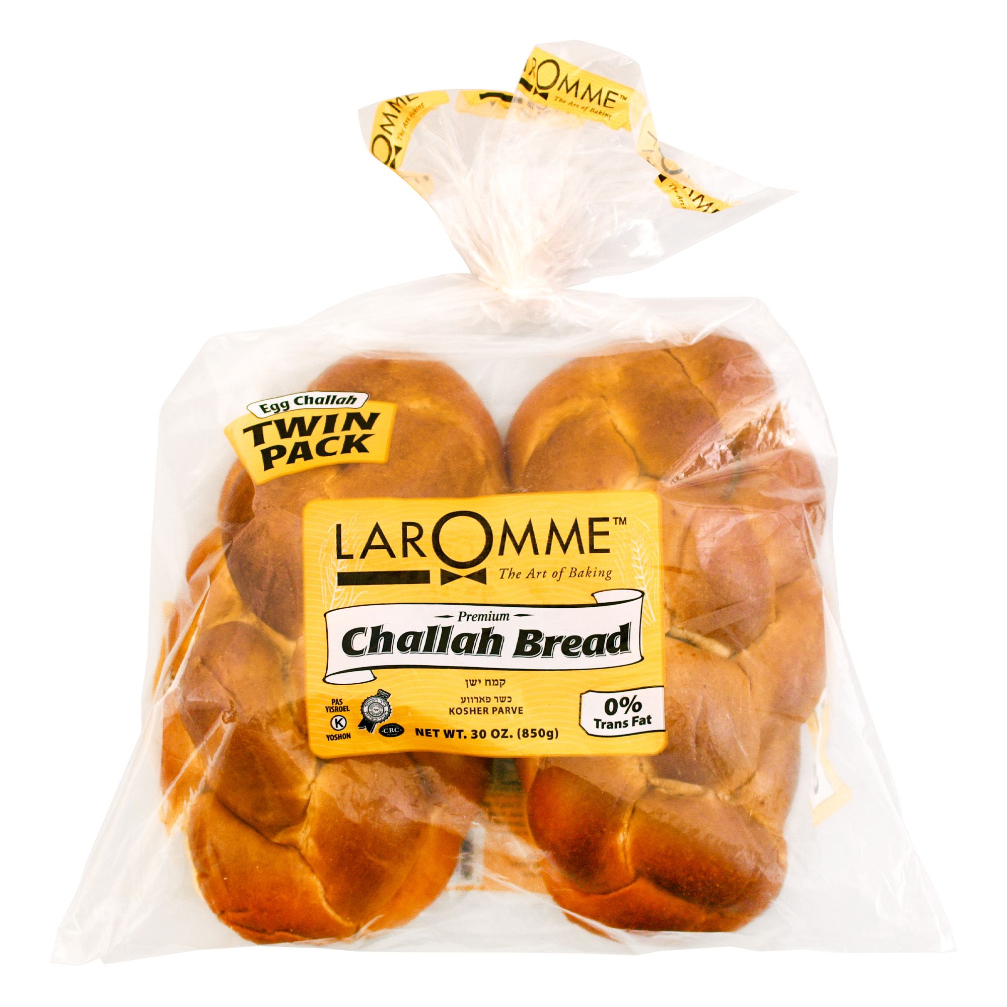 Laromme Challah Bread is premium egg challah bread made from the finest ingredients. Soft and fluffy, this rich tasting, hand-braided bread is an ideal accompaniment to any Kosher meal. This pack includes two 15 oz. pieces of challah bread made fresh in New York.