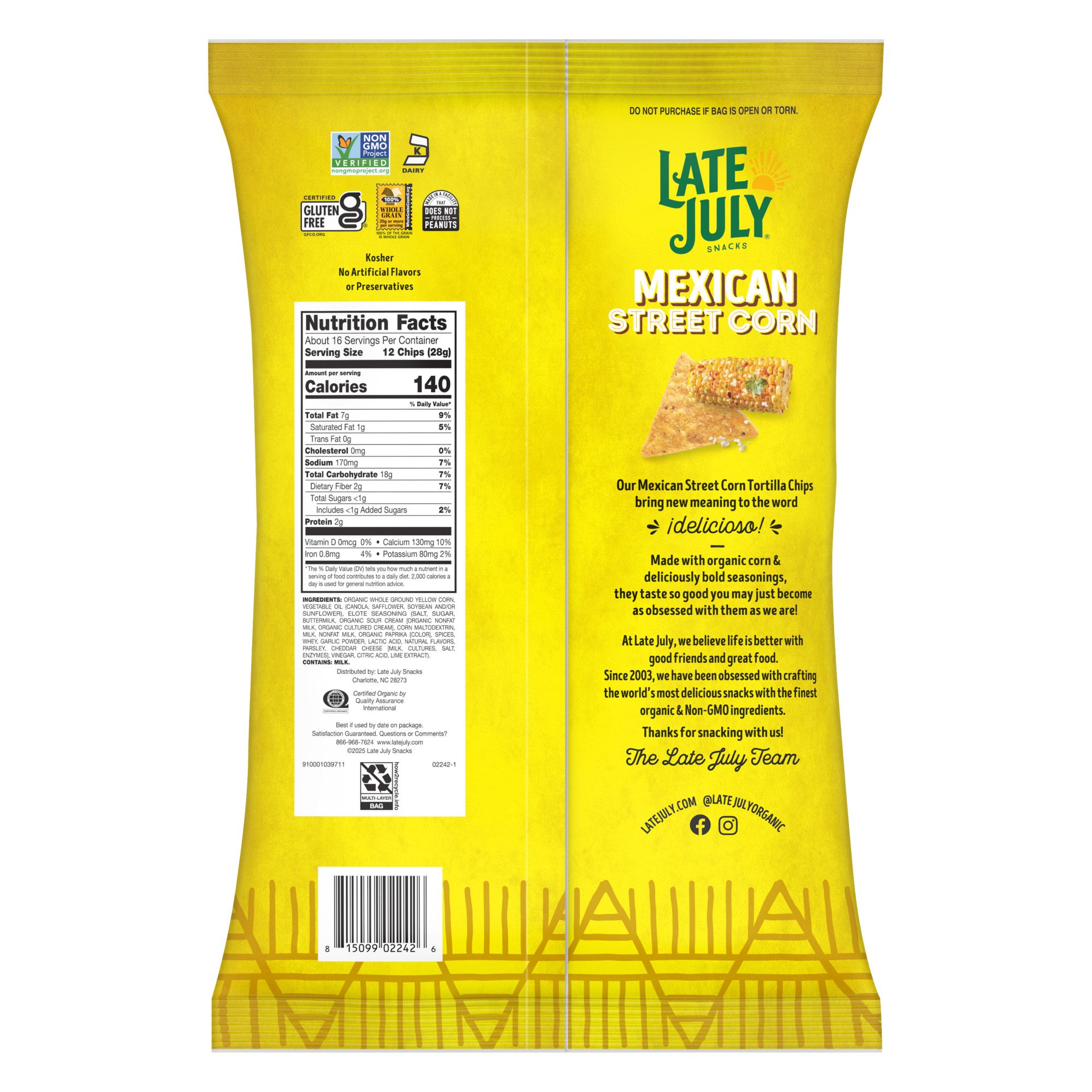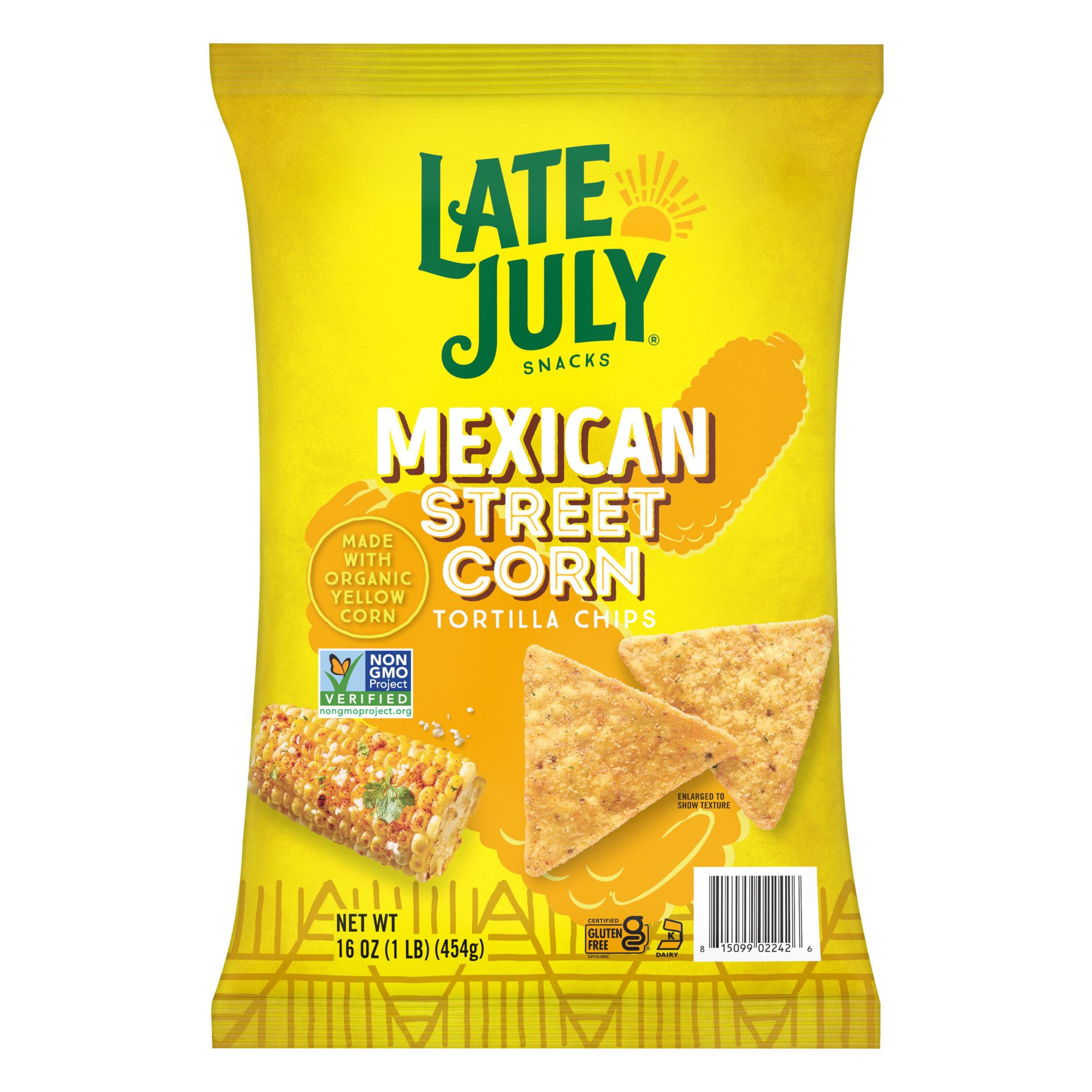 Get ready for the deliciously bold taste of Late July Mexican Street Corn Tortilla Chips. These tortilla chips are made with organic corn and seasonings and inspired by real ingredients for an amazingly delicious taste that you can enjoy right out of the bag. Late July hopes you’ll love them as much as they do. Late July is the sweet spot of summer. It’s a moment in time when life is simple, pure and good. And Late July's chips take you there, any time of year. It’s also their name and their snack-making philosophy. Since 2003, they have been obsessed with crafting the world’s most delicious snacks with only the finest organic and non-GMO project verified ingredients. These 100% whole-grain chips are made with organic corn, they’re kosher, are certified gluten free, and contain no artificial flavors or preservatives. There are about 8 servings per 7.8-oz. bag of Late July Tortilla Chips.