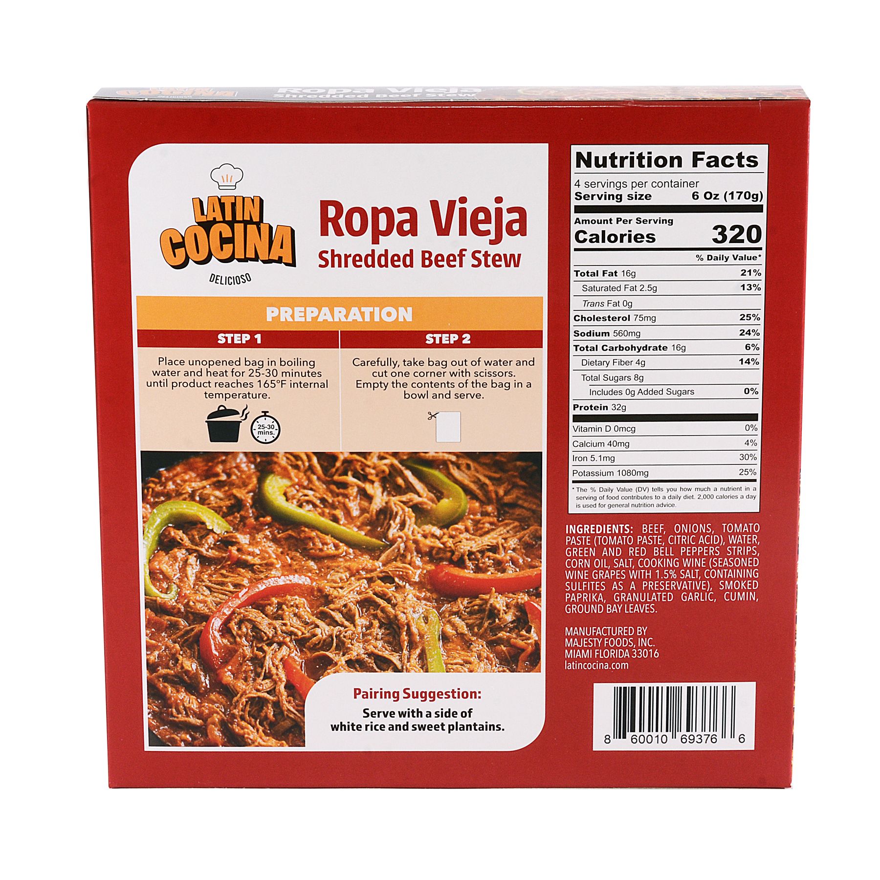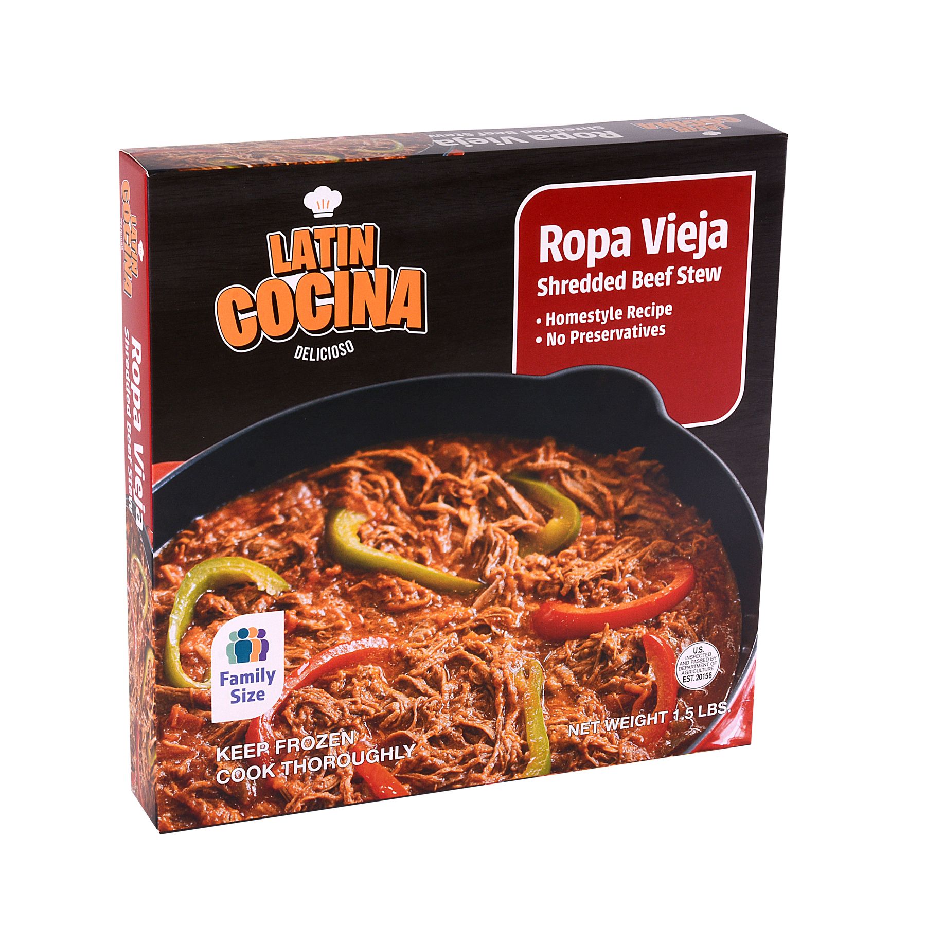 Latin Cocina Ropa Vieja, Shredded Beef Stew is an authentic Latin style shredded beef stew, made with pulled beef and cooked with hearty vegetables, such as red and green peppers and olives combined in a creamy, rich tomato sauce base. It is often served with black beans and rice. Latin Cocina meat dishes are deliciously seasoned with fragrant spices and carefully prepared to capture the original authentic flavors of their origins. Whether you are having a party or just needing a delicious dinner, these meat dishes are a convenient home cooked meal without the prep.