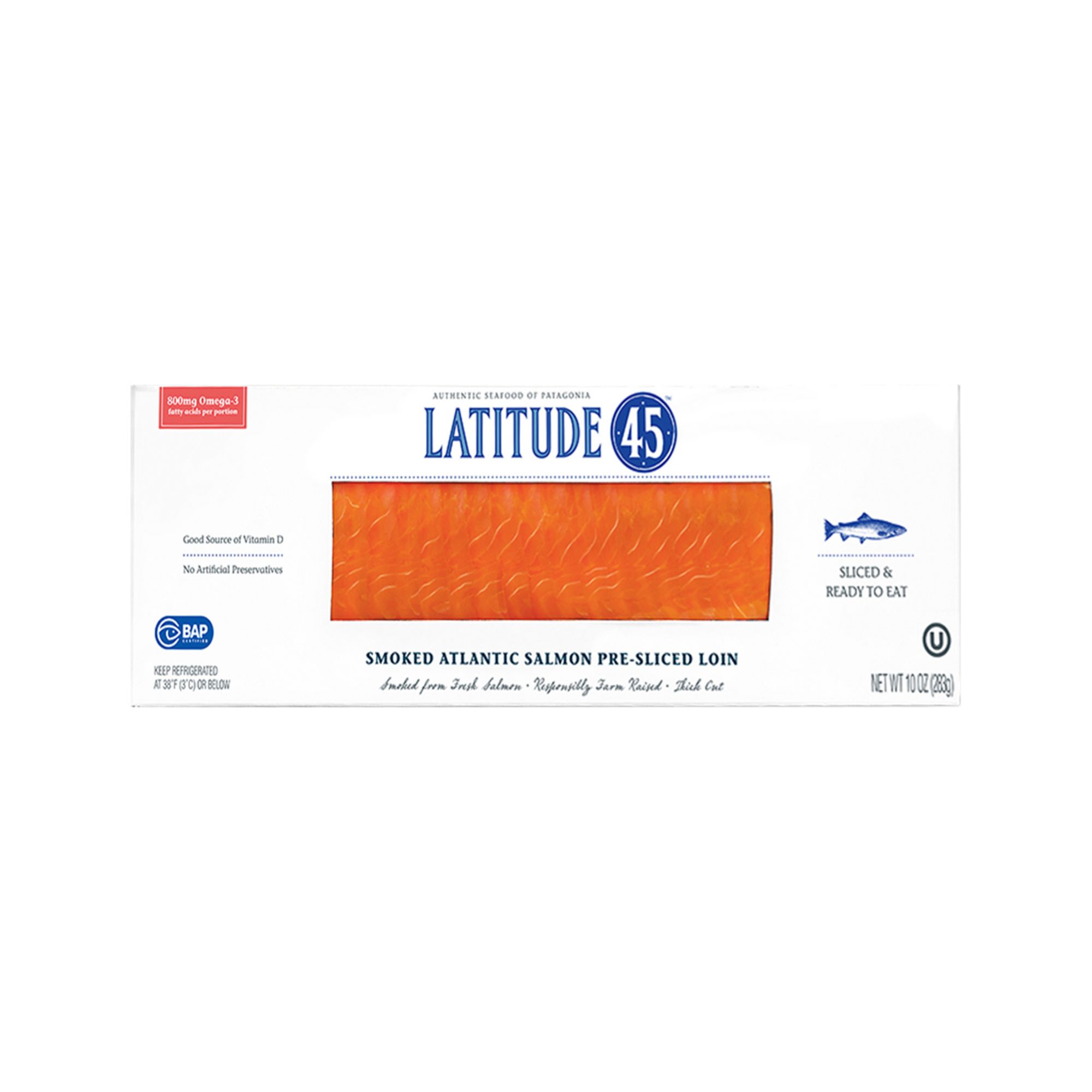Latitude 45's premium smoke roasted salmon is made from hand-selected fresh Atlantic Salmon, sustainably sourced from the pristine waters of the Chilean Patagonian region. Within hours of harvest, the salmon is naturally cured through a slow smoke process, creating one of the finest smoked salmon products available. Atlantic Salmon is a source of lean protein, omega 3 fatty-acids and a good source of vitamin D. The product is ready-to-eat and conveniently offers endless pairing options - the smoke roasting process makes this product perfect for delicious salmon dips and spreads on sandwiches, flat breads, and crackers; mincing into salads, or in pastas and as pizza toppings. Latitude 45 operates in an ideal environment for salmon production, the glacial fjords and pristine waters of Patagonia. This smoked salmon is always made from fresh salmon and smoked within 24 hours of leaving the water resulting in one of the finest smoked salmon products available to consumers, and its rich flavor allows consumers to enjoy a unique culinary experience every time they try it. Latitude 45 is also committed to transparency, food safety, and the implementation of world-class sustainable practices that support the environment. Latitude 45 is a member of The Global Salmon Initiative (GSI) and the Global Sustainable Seafood Initiative (GSSI) and operates a robust QC control system to satisfy the most demanding customers and consumers around the world. All of Latitude 45 products are OU kosher and BAP 4-Star Certified.